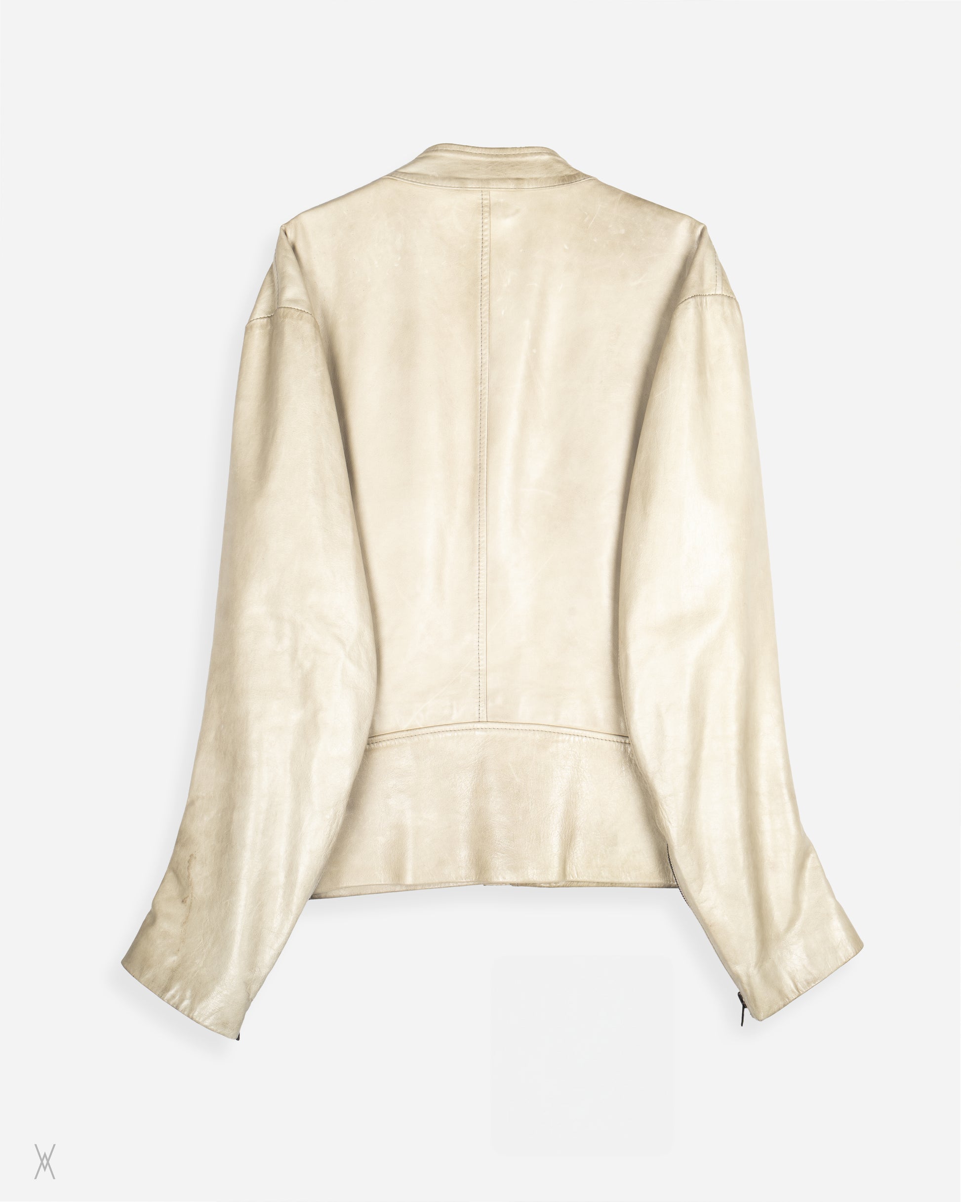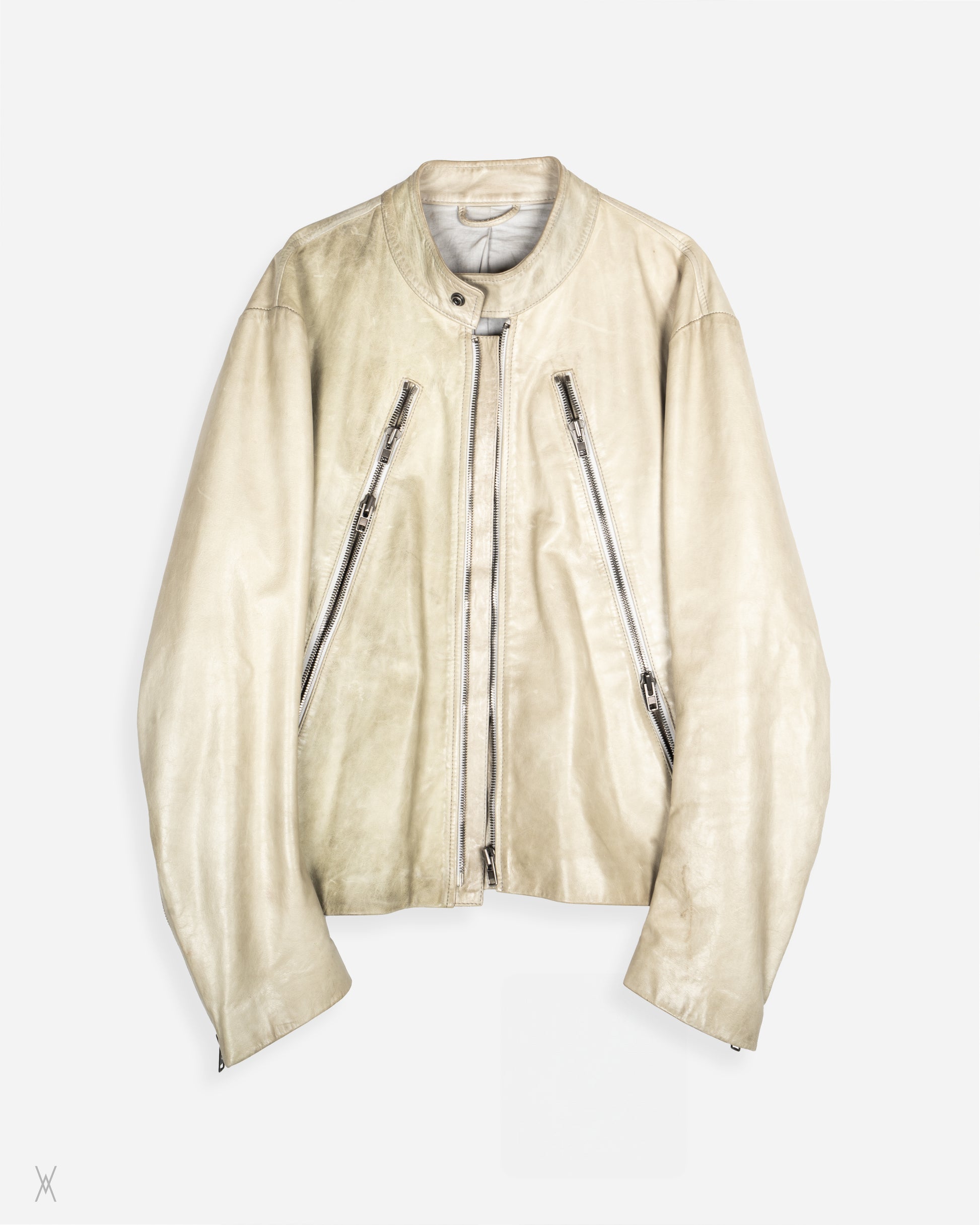Maison Martin Margiela Line 10 leather jacket from the Spring Summer 2009 collection crafted from soft, lightweight lambskin in a unique washed beige tone that reads like a milky latte in person. Designed with Margiela’s iconic five-zip front: two long diagonal metal zippers framing the torso and a central zip closure, all in heavy silver hardware. Features a clean band collar with snap fastening, elongated sleeves with zip cuffs, and a minimal, uninterrupted back panel that highlights the sculptural cut. Fully lined in light grey cotton. Made in Italy.