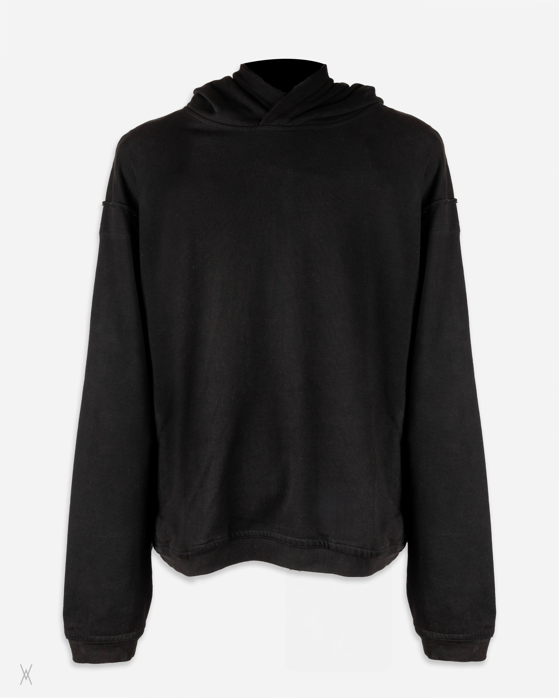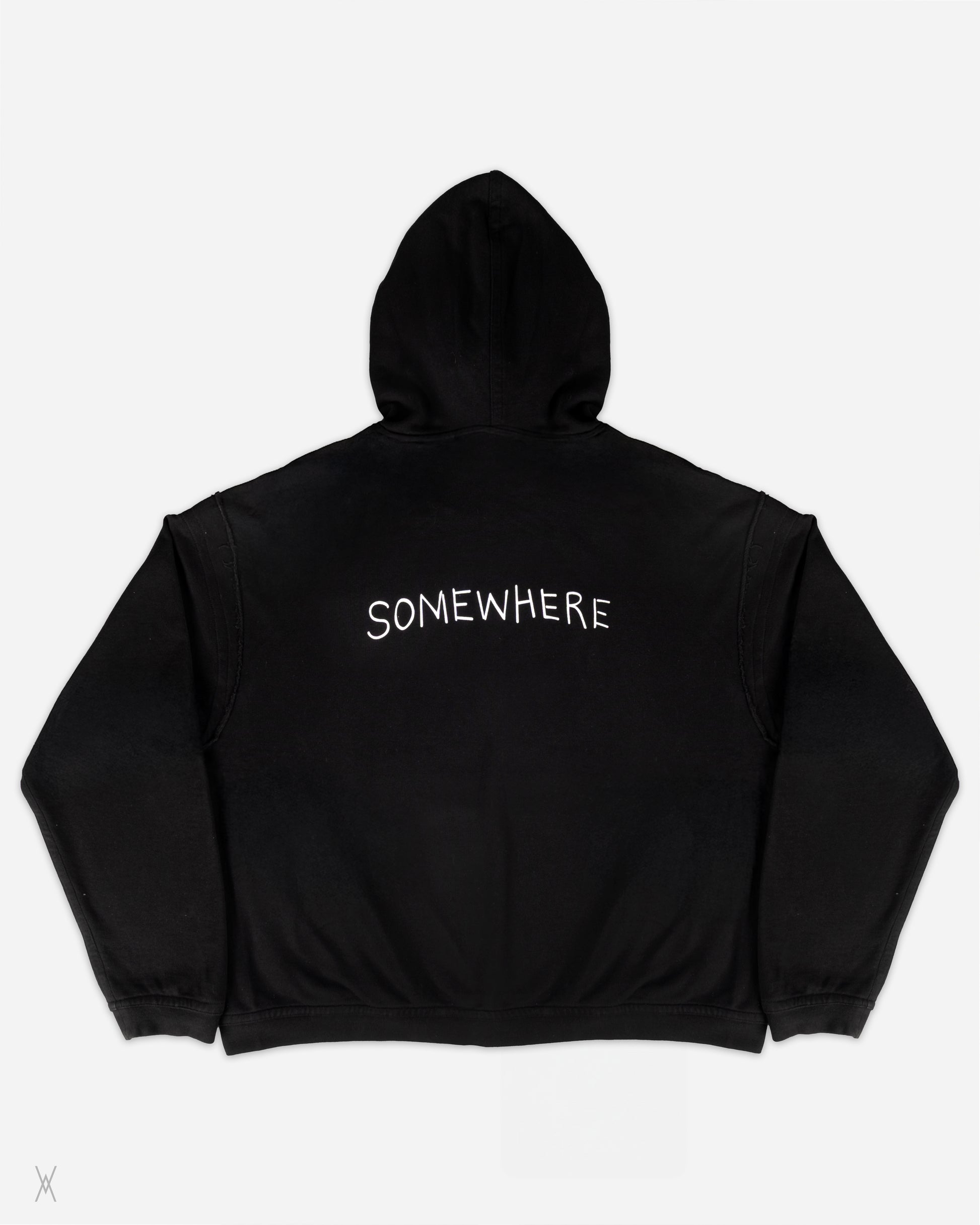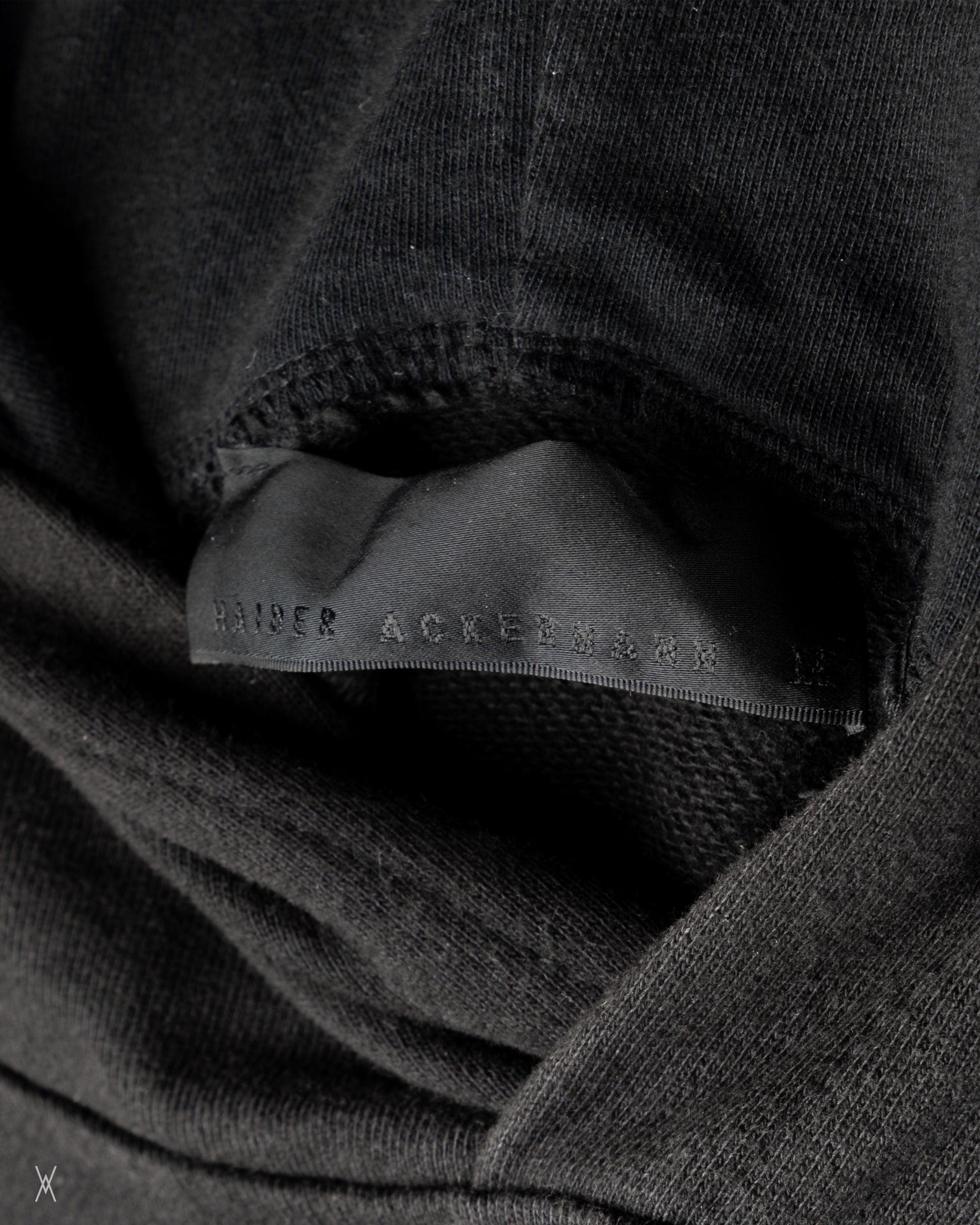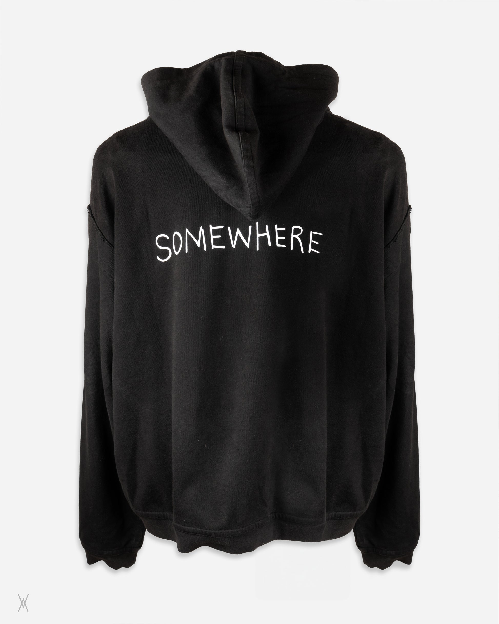 Black cotton-blend hoodie by Haider Ackermann, featuring a minimal front and bold “SOMEWHERE” graphic on the back in handwritten font. Constructed with signature Haider tailoring, including a cross-over shawl neckline and relaxed, slightly cropped fit. Raw hems and subtly dropped shoulders underline the effortless attitude. Extremely rare, archive-worthy piece with artisanal construction. This is one of Haider’s most iconic casual garments—hard to come by, especially with the original back print—sought-after by collectors and fans of directional luxury streetwear.