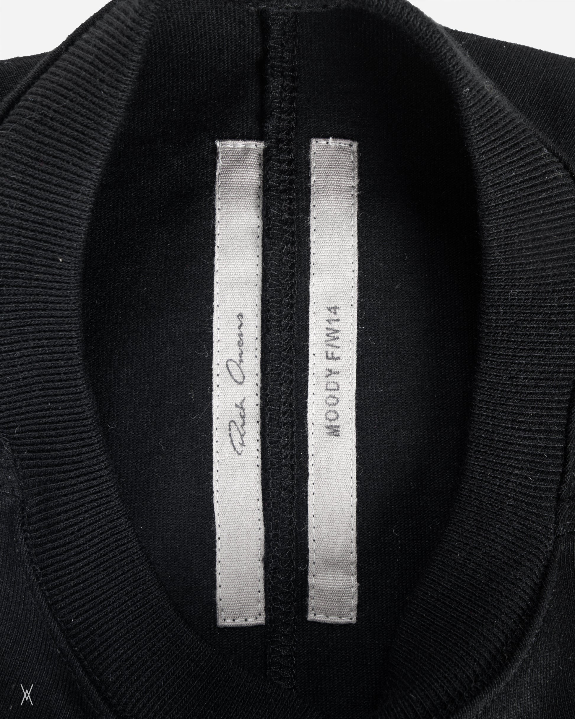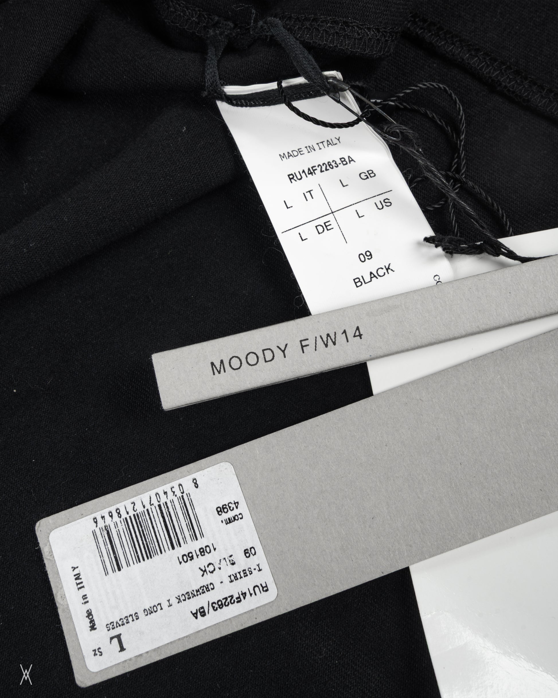 Archive Rick Owens long-sleeve crewneck from the Moody collection (FW14). Code RU14F7283-BA. Cut in Rick’s classic elongated block with ribbed collar and cuffs, straight hem and the signature center-back spine seam. Made in Italy from a heavyweight cotton jersey that feels dense yet soft with a dry, vintage hand—an iykyk fabric Rick doesn’t use anymore. Pure black. New old stock with full paper tags.