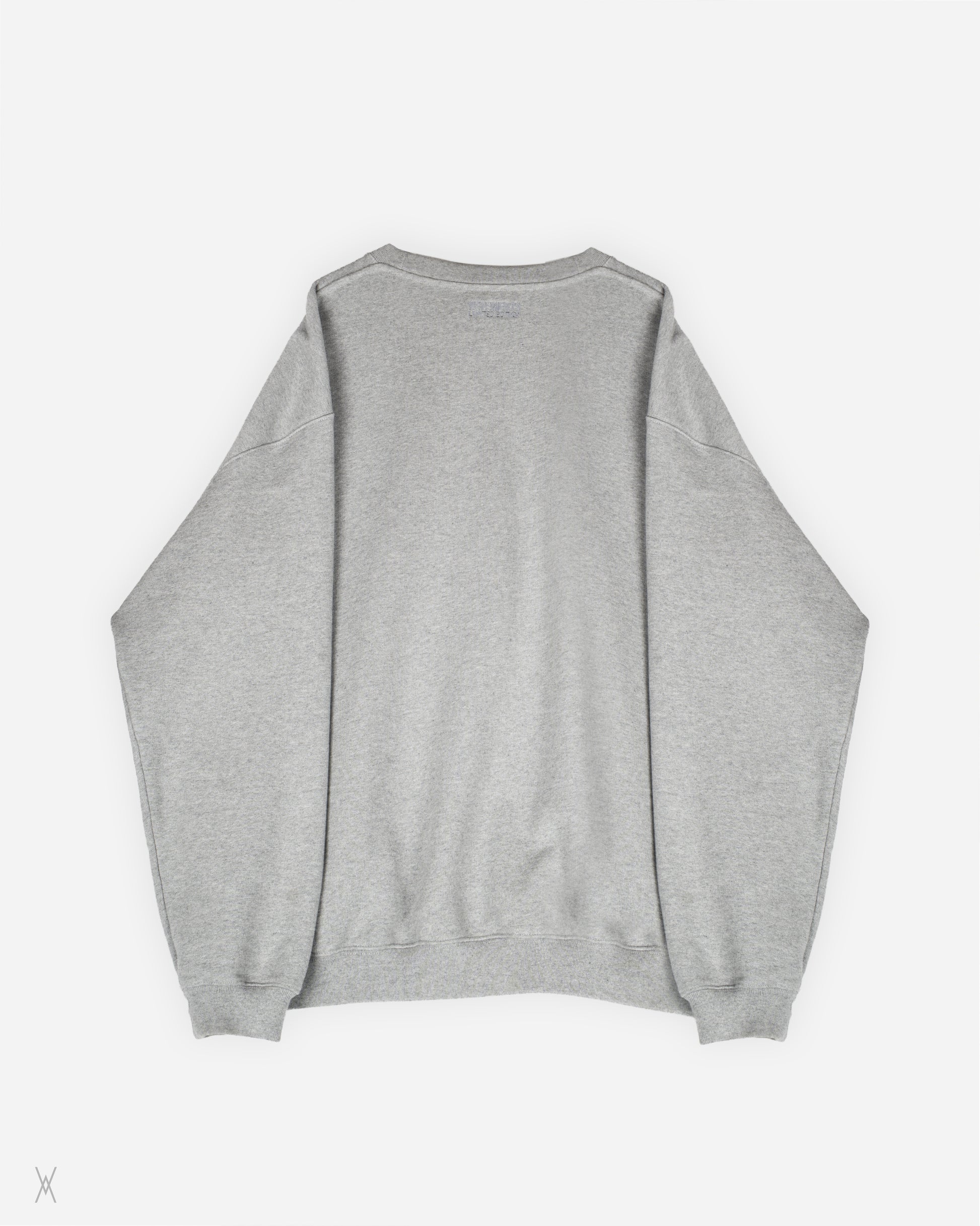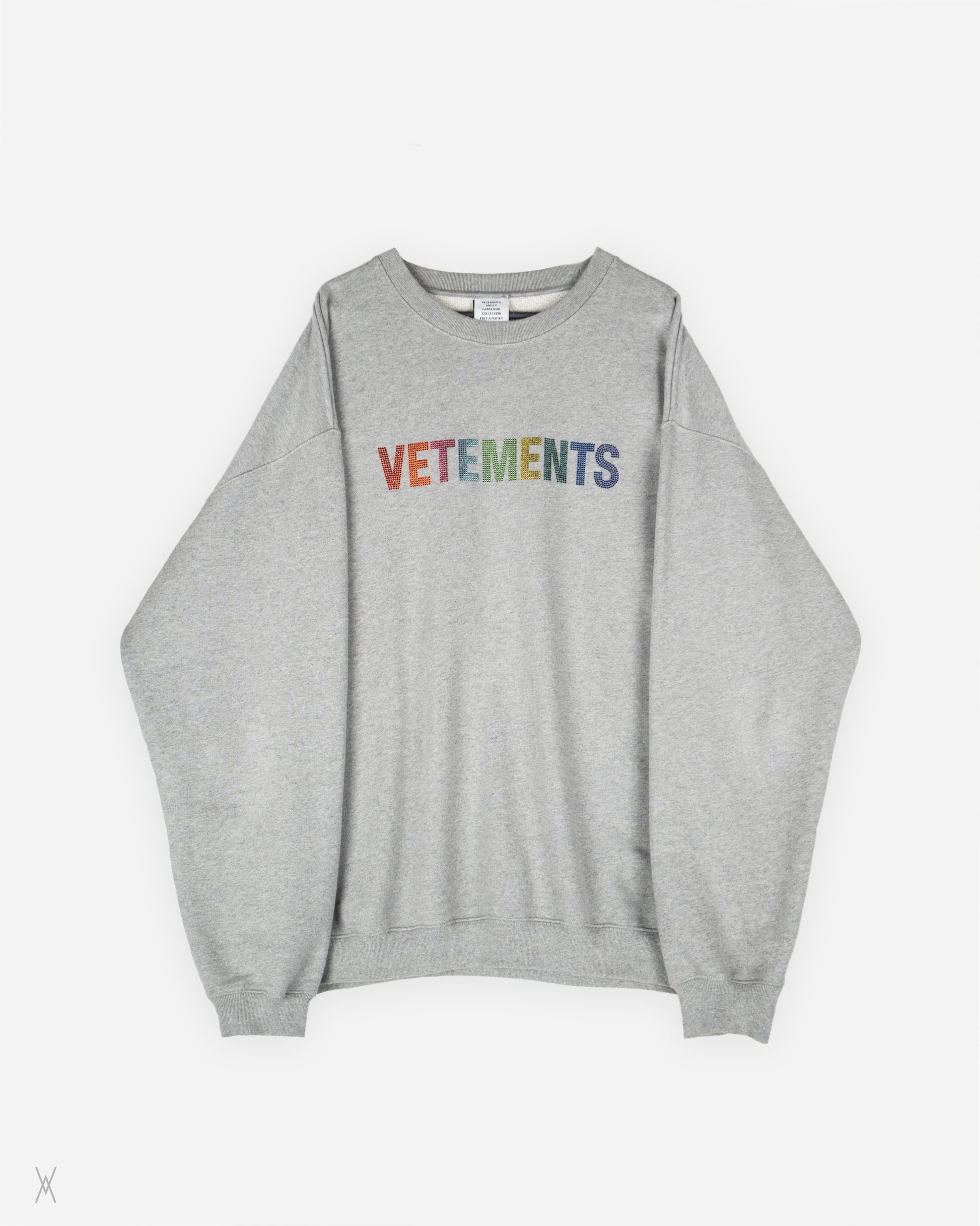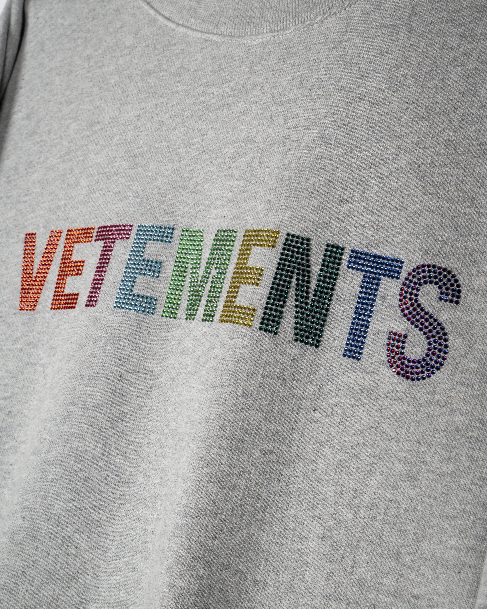 Vetements crewneck sweatshirt in grey melange from the Unisex Garderobe Collection. Constructed from heavyweight cotton jersey with a brushed fleece interior. The front is finished with a multicolour crystal-embellished VETEMENTS logo, applied directly to the fabric in a clean, linear layout.
