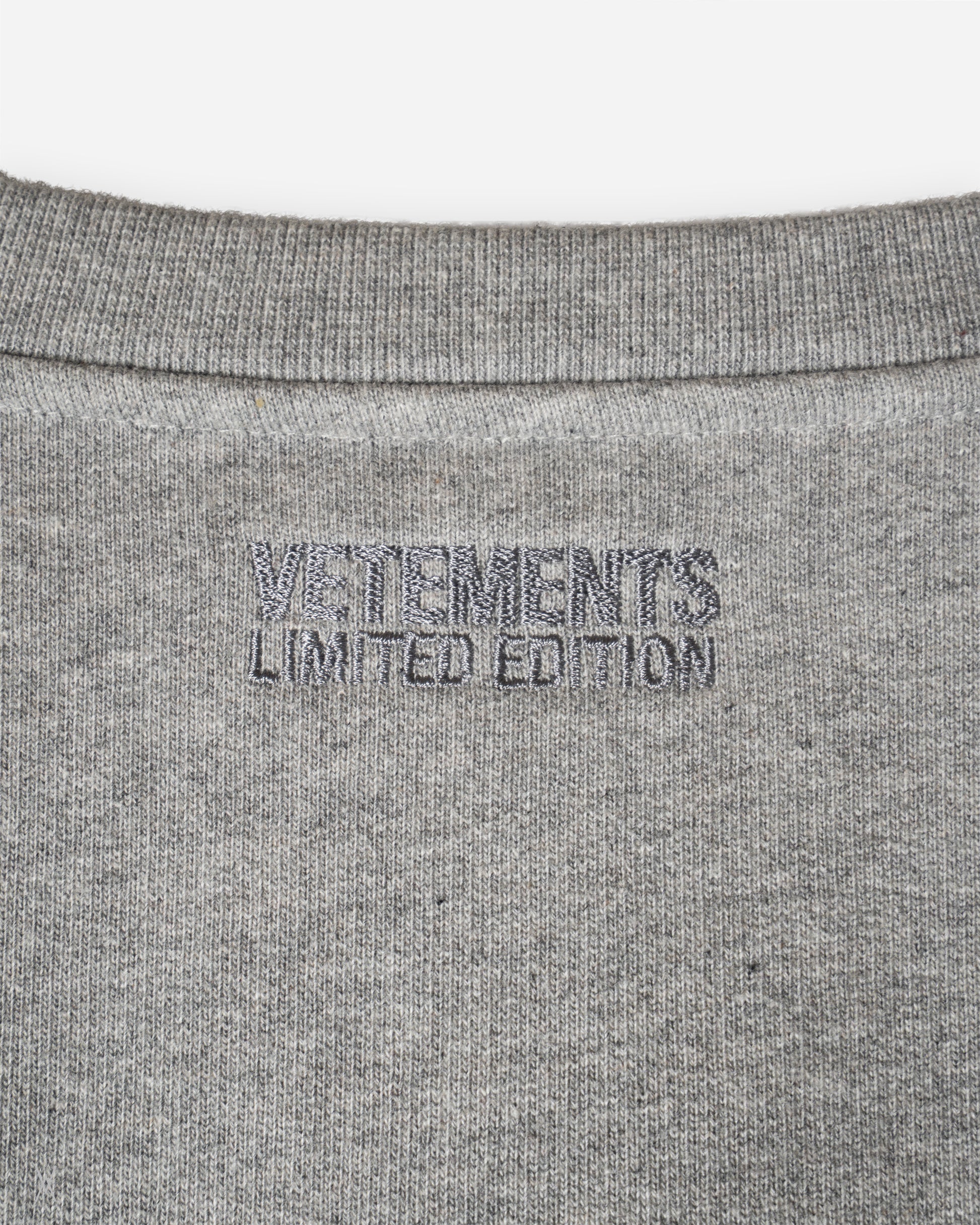 The piece features a relaxed, oversized silhouette with dropped shoulders, ribbed crew neckline, cuffs, and hem. An embroidered Vetements Limited Edition marking is placed at the upper back neckline.
