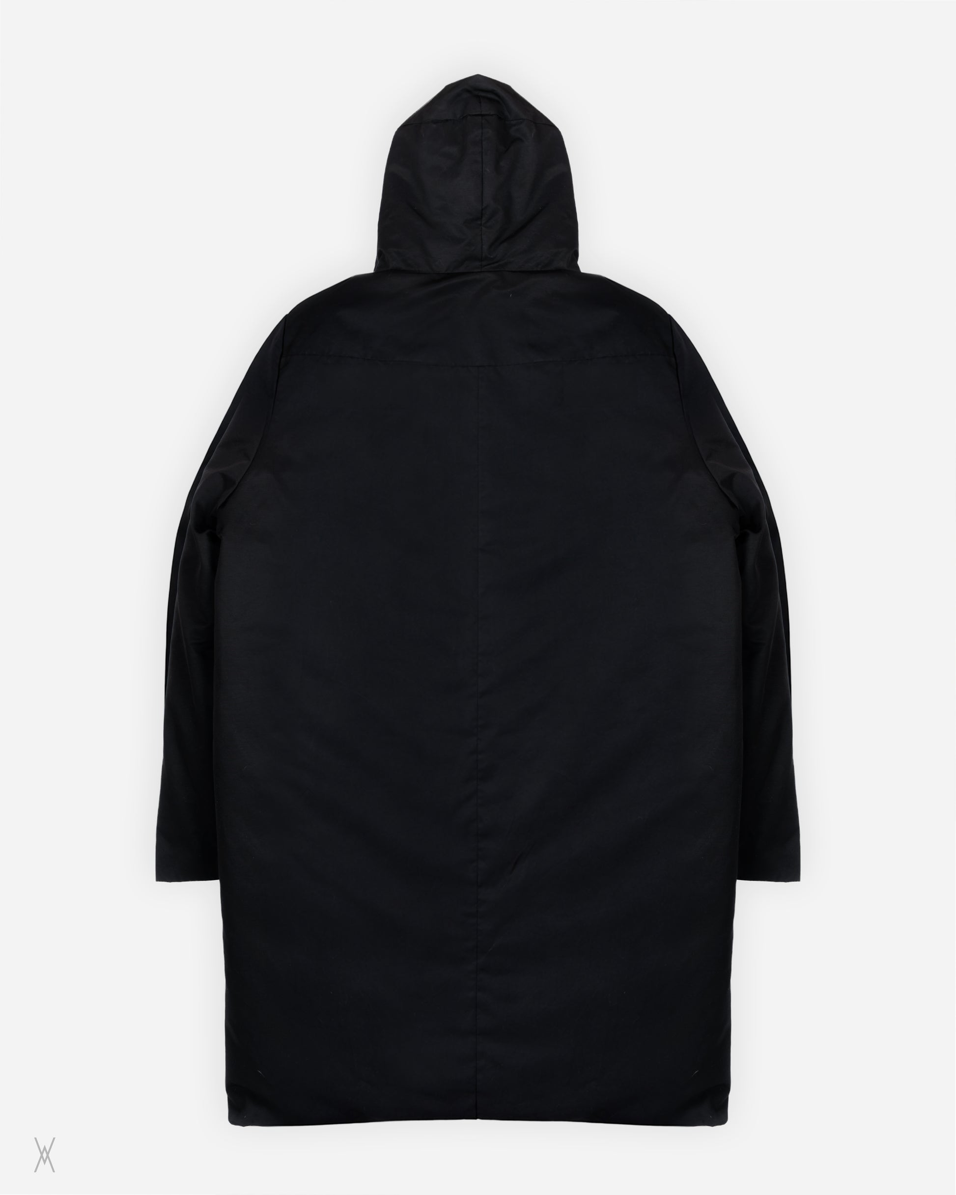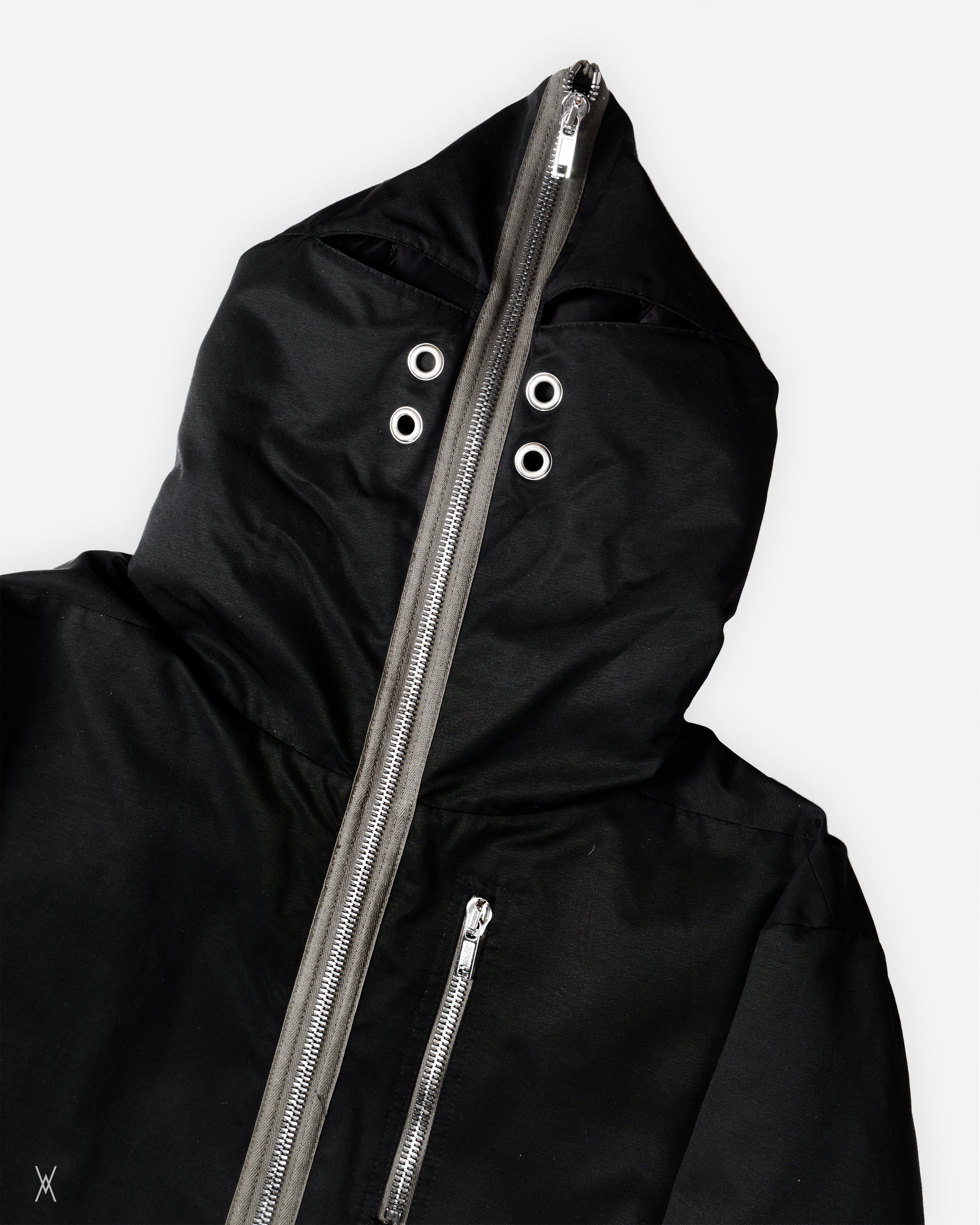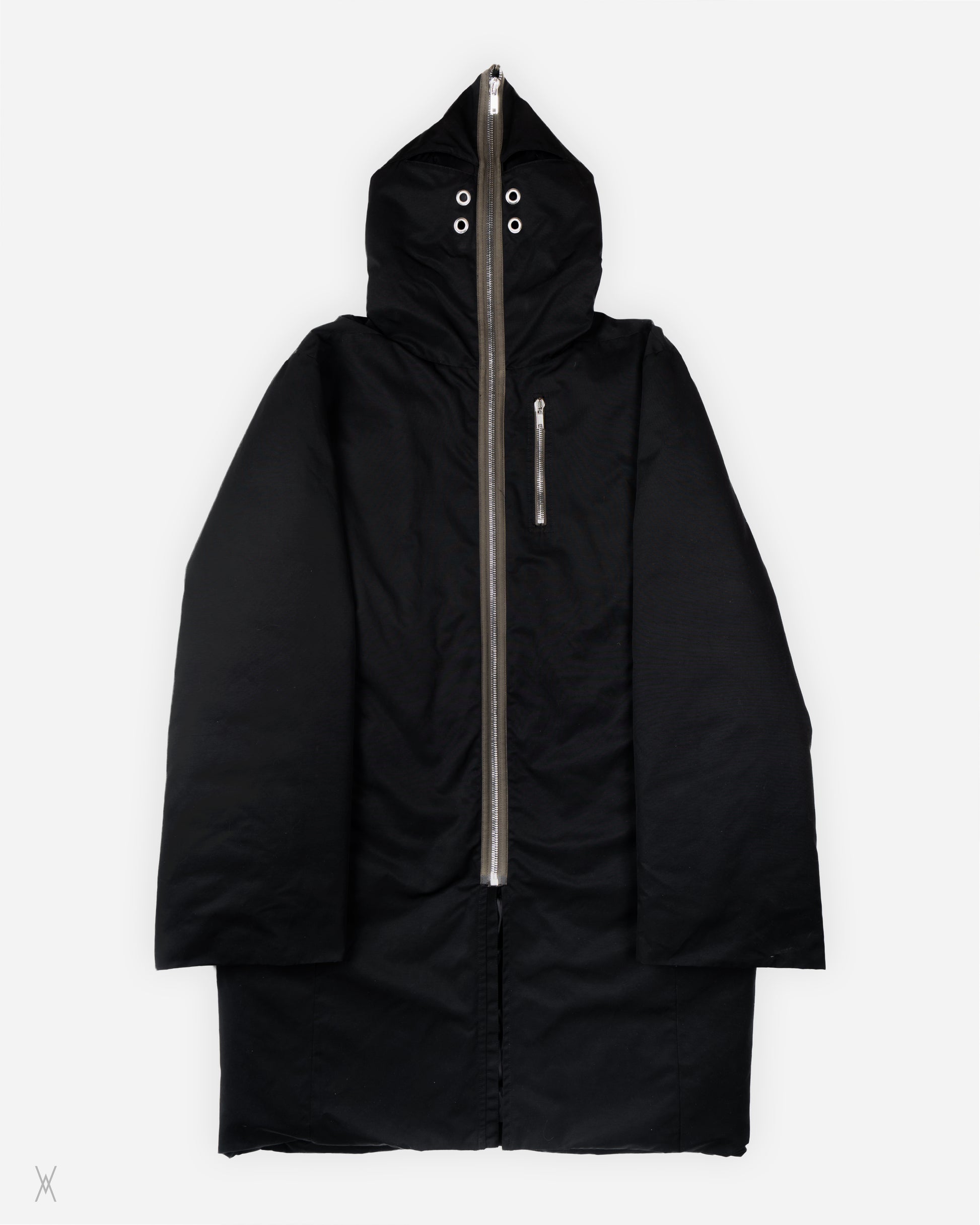 Rick Owens padded hooded coat from FW22, constructed in a technical nylon blend with a quilted down-filled interior. Features a full-length front zip extending through the hood, metal eyelet detailing at the face opening, and a clean, elongated silhouette with minimal seam interruption. Designed with a zip chest pocket and fully insulated body and sleeves. Size IT 48, made in Italy.