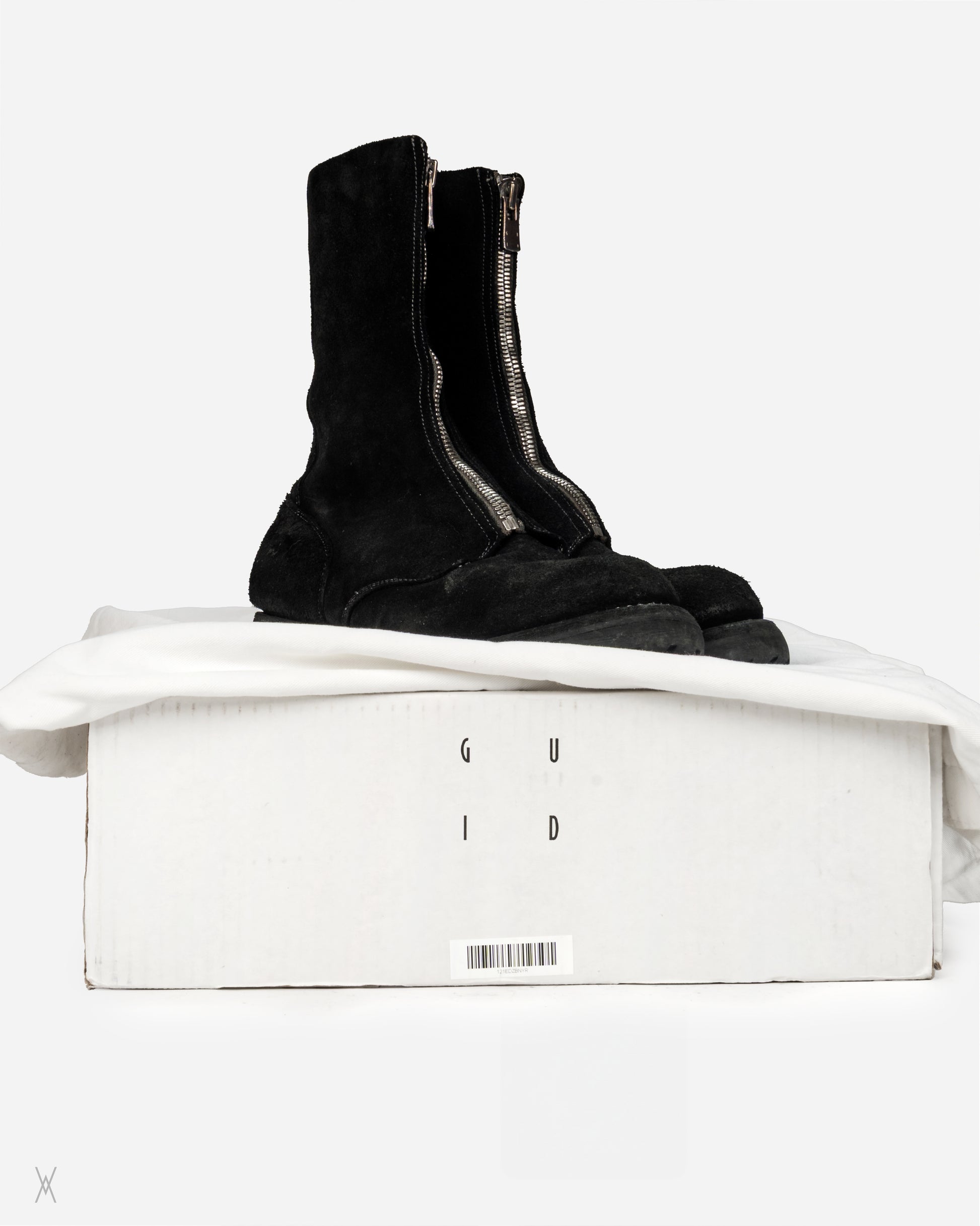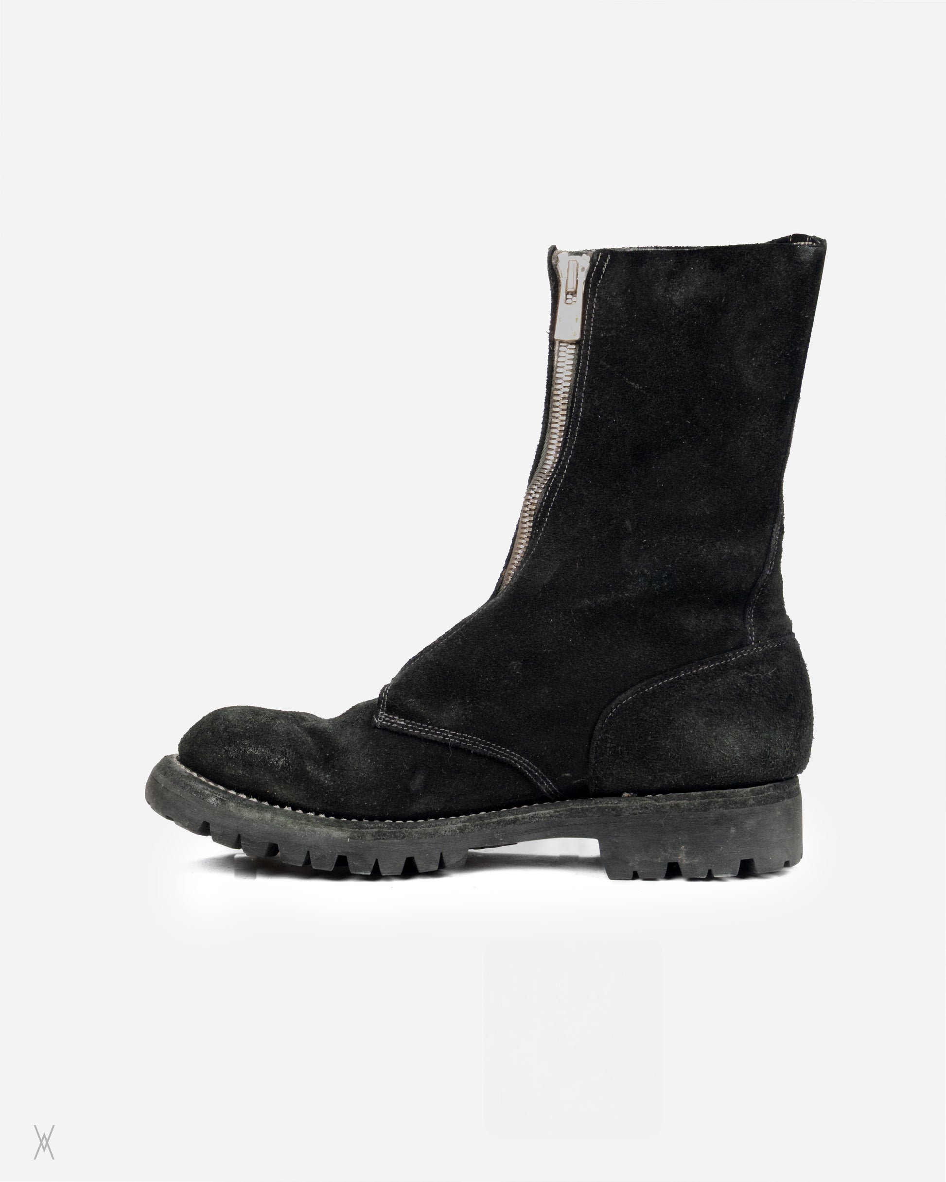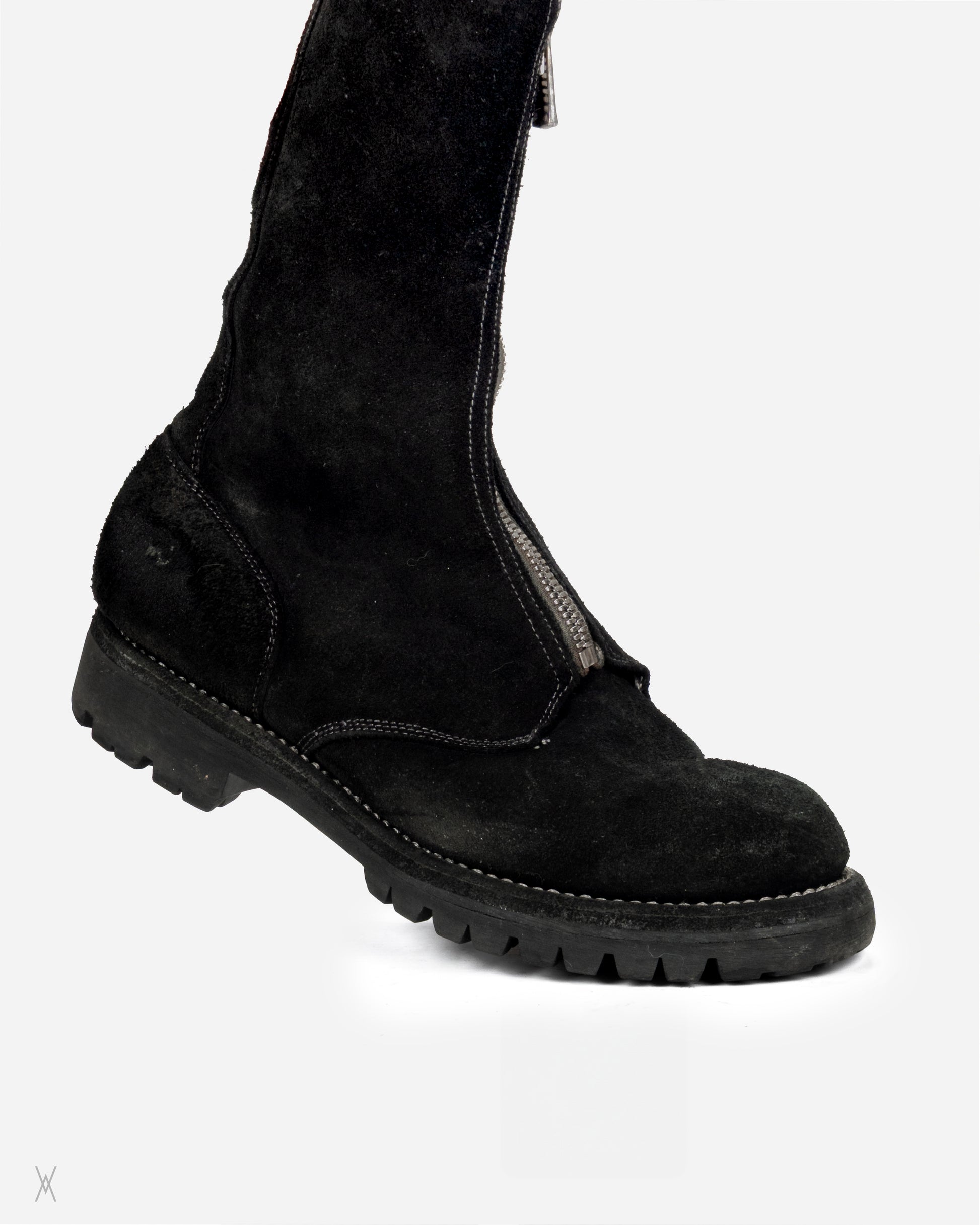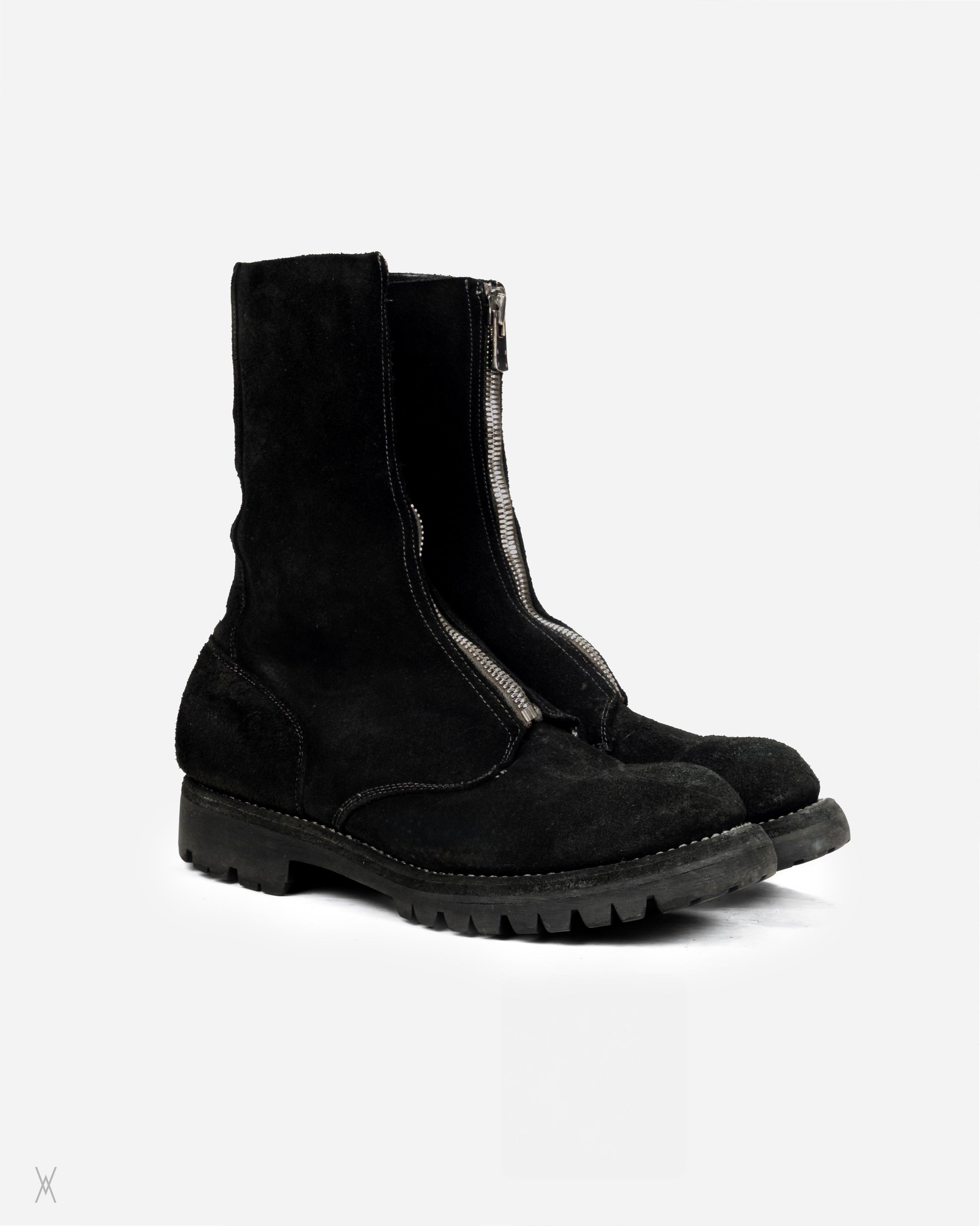Guidi unisex 5308FZV front-zip boots in black reverse calf (suede side out). Center metal zip, rounded toe. Welted, nail-tacked construction on a Vibram® lug sole with stacked heel. Fully leather-lined. Made in Italy. Includes original box and dust bag.