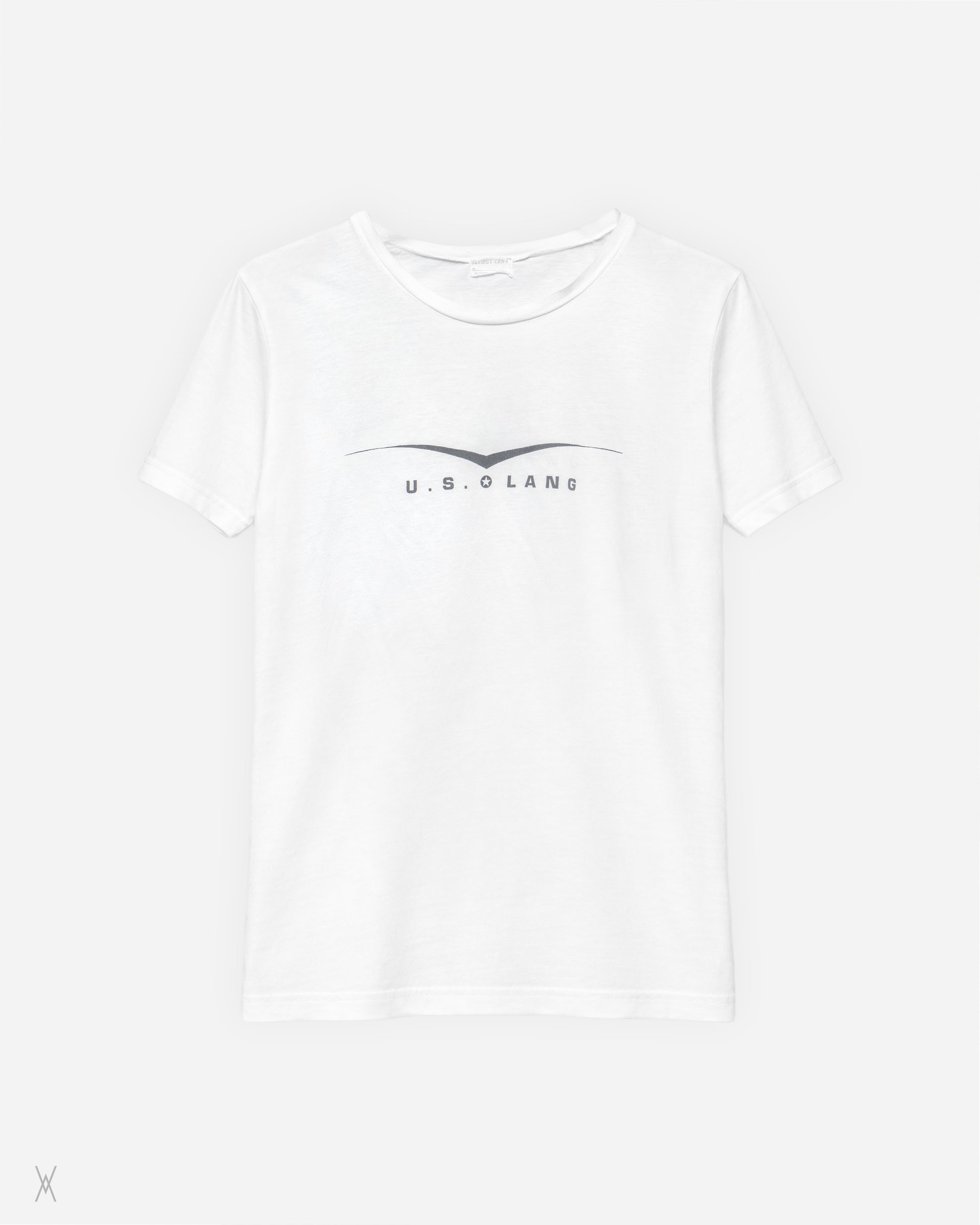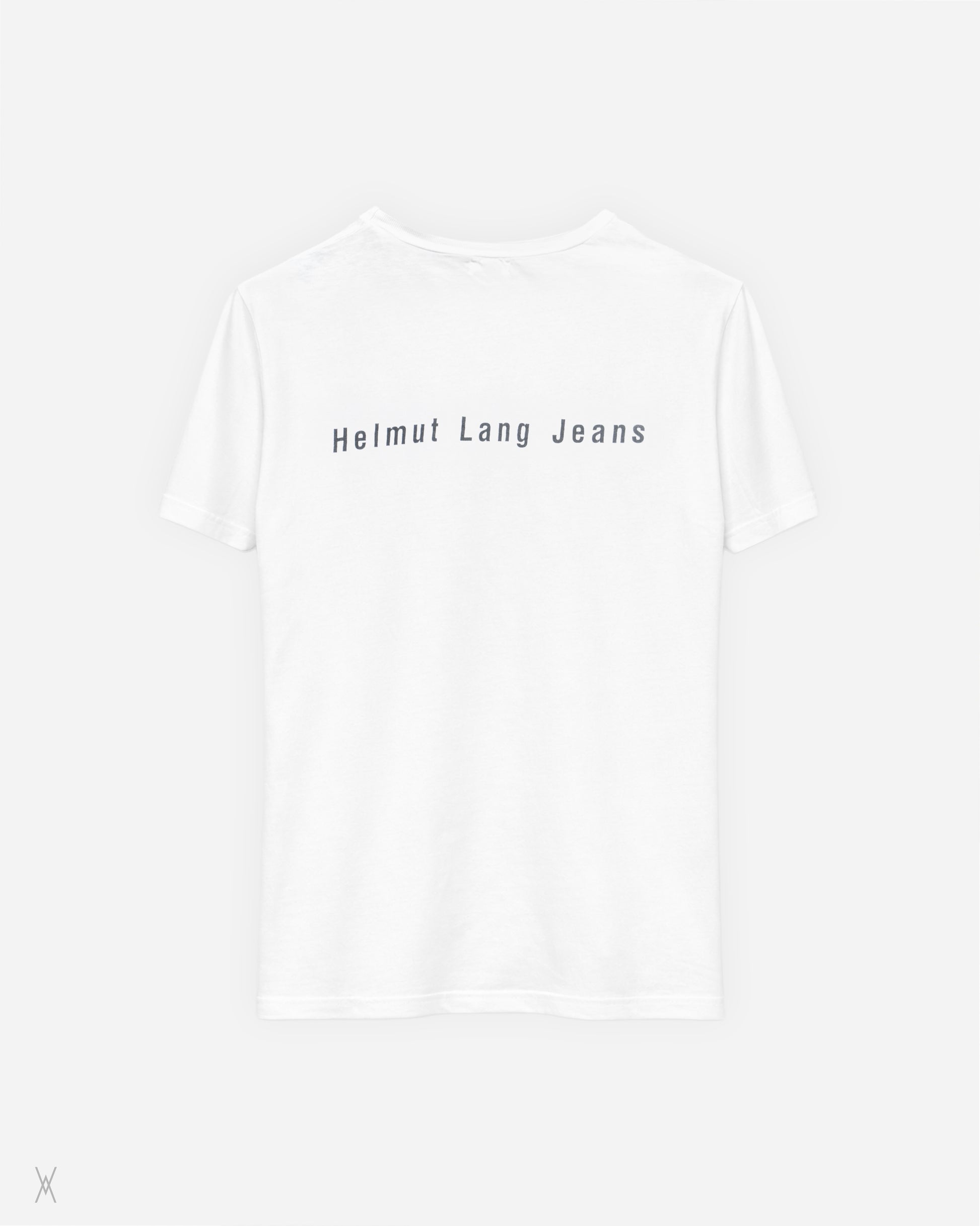 Helmut Lang Jeans short sleeve T-shirt, made in Italy. Crafted from soft white cotton with a regular, clean fit. The front features a subtle u.s.o graphic print, while the back is finished with Helmut Lang Jeans lettering across the shoulders. Lightweight construction with restrained branding, consistent with Helmut Lang Jeans output from the late 1990s / early 2000s.