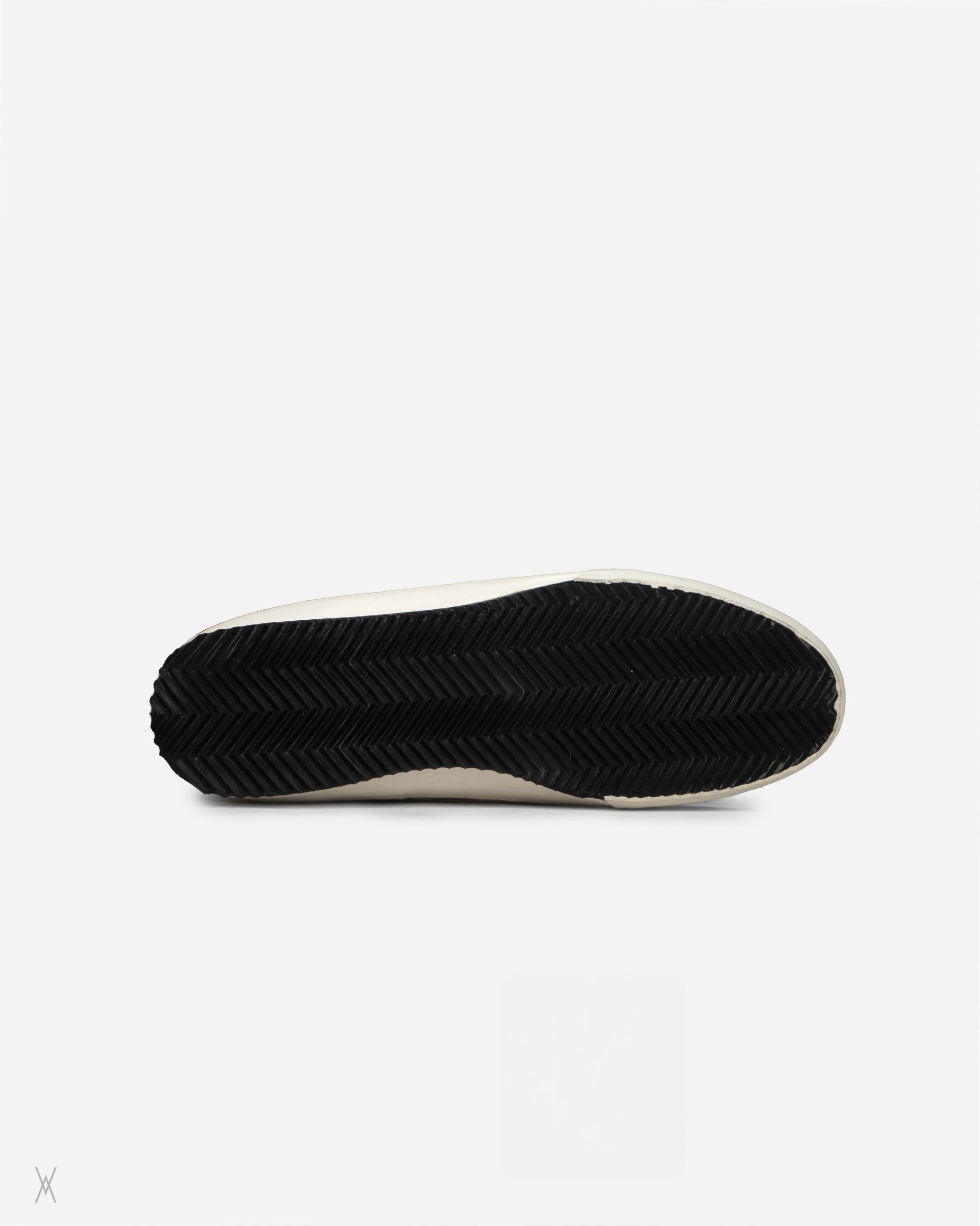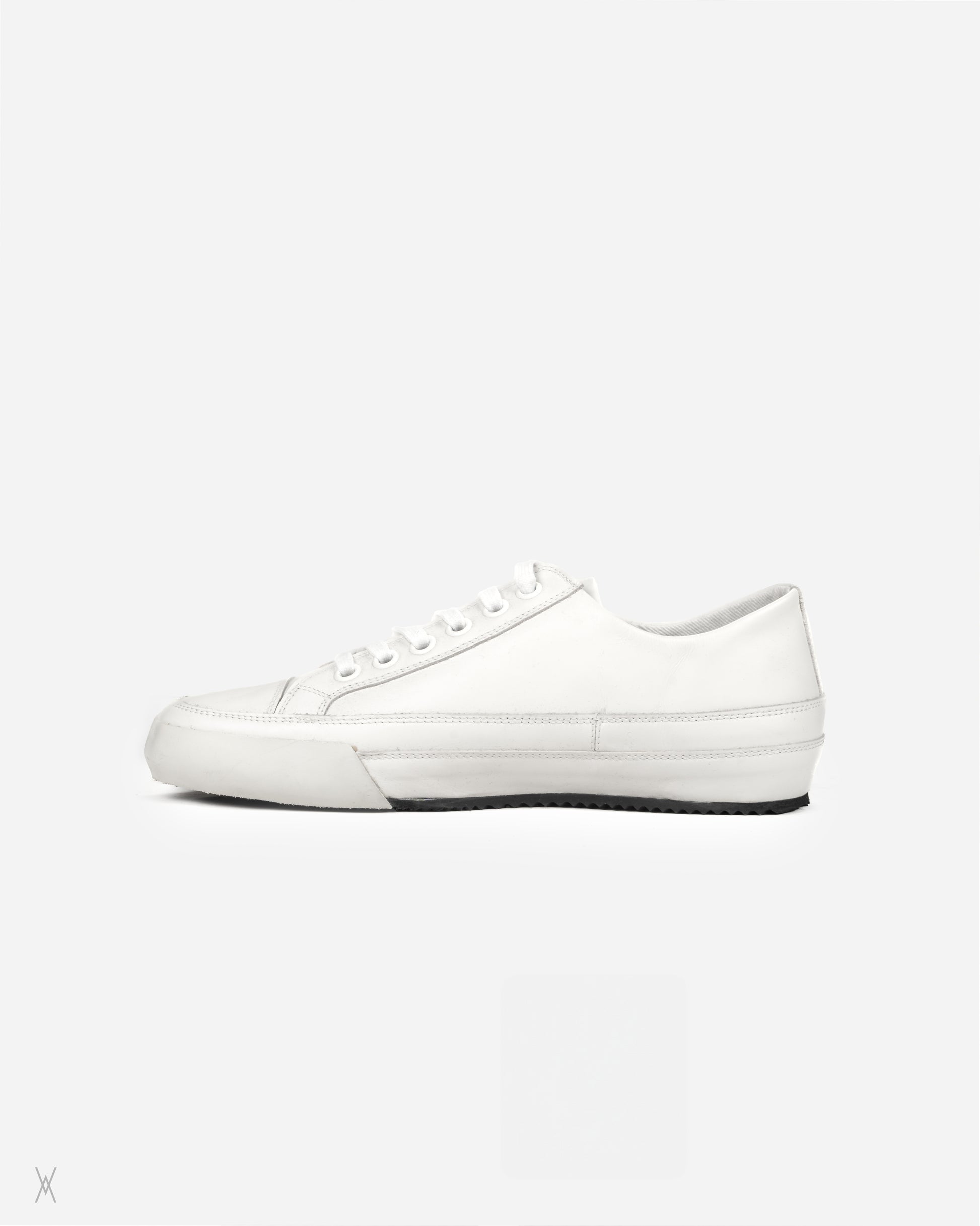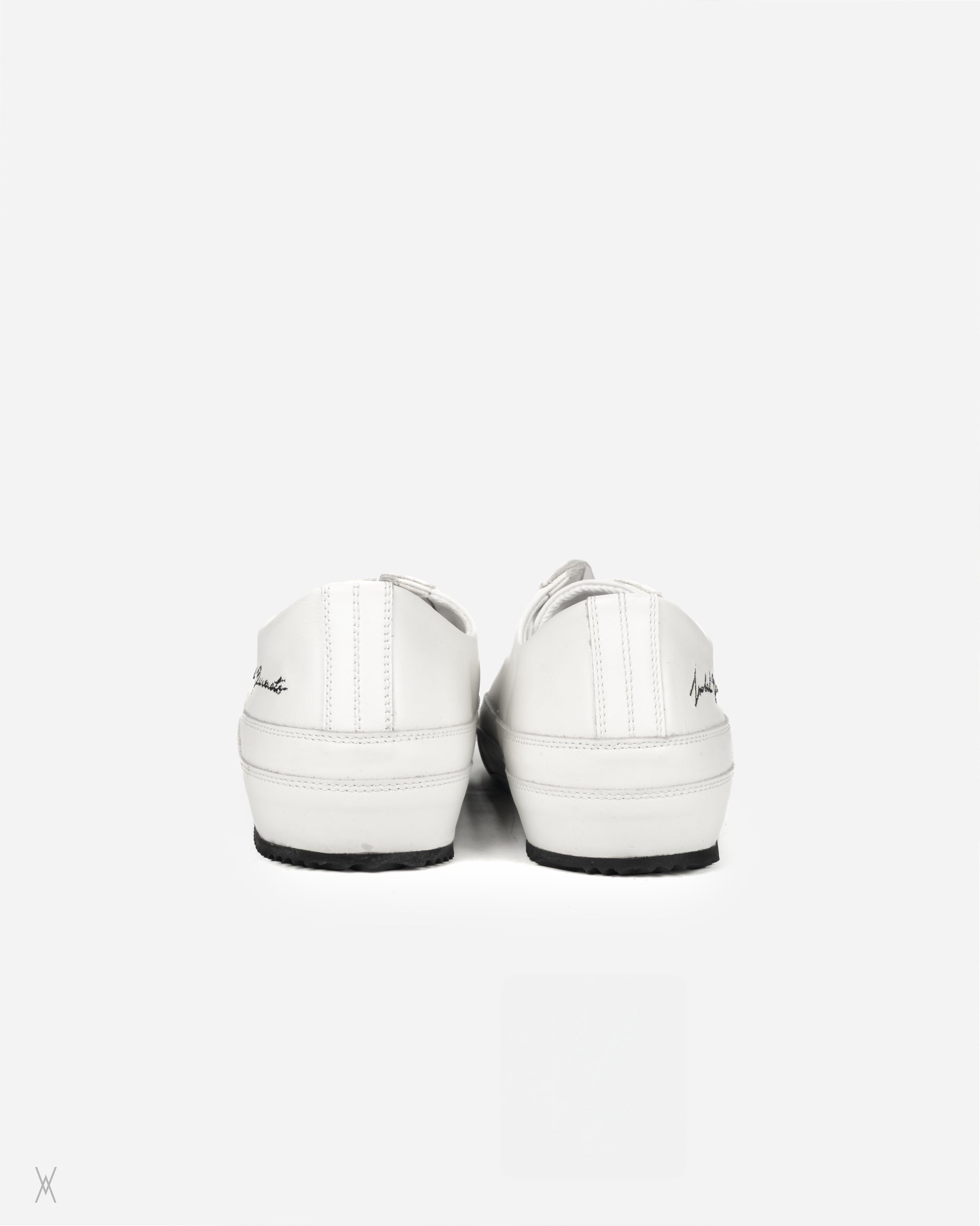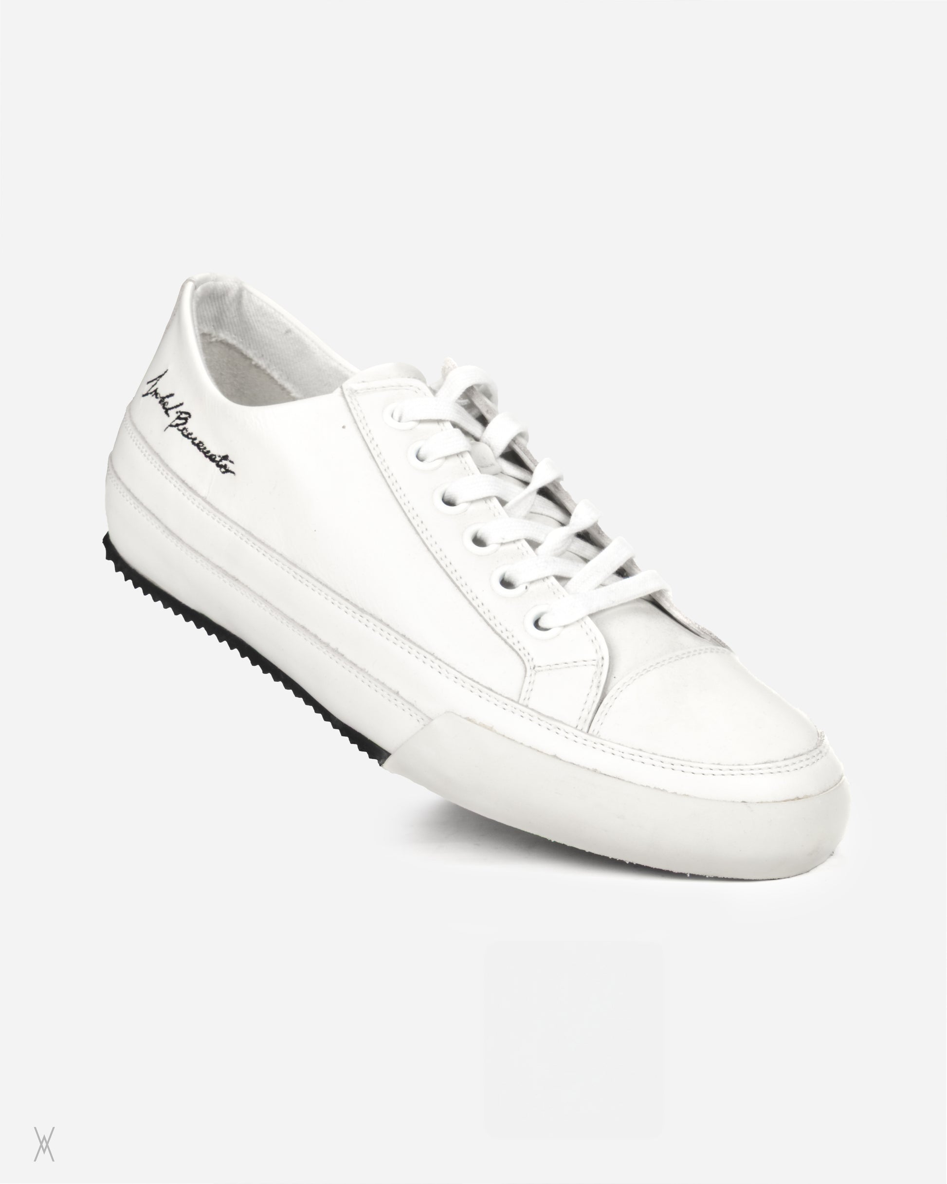 Isabel Benenato low-top sneakers, style US04519, from SS19. Smooth white calf leather with tonal stitching, signature Isabel Benenato script at the heel, 8-eyelet lace-up, and rubber toe bumper. Black herringbone rubber outsole. Made in Italy. Includes original box and dust bag.