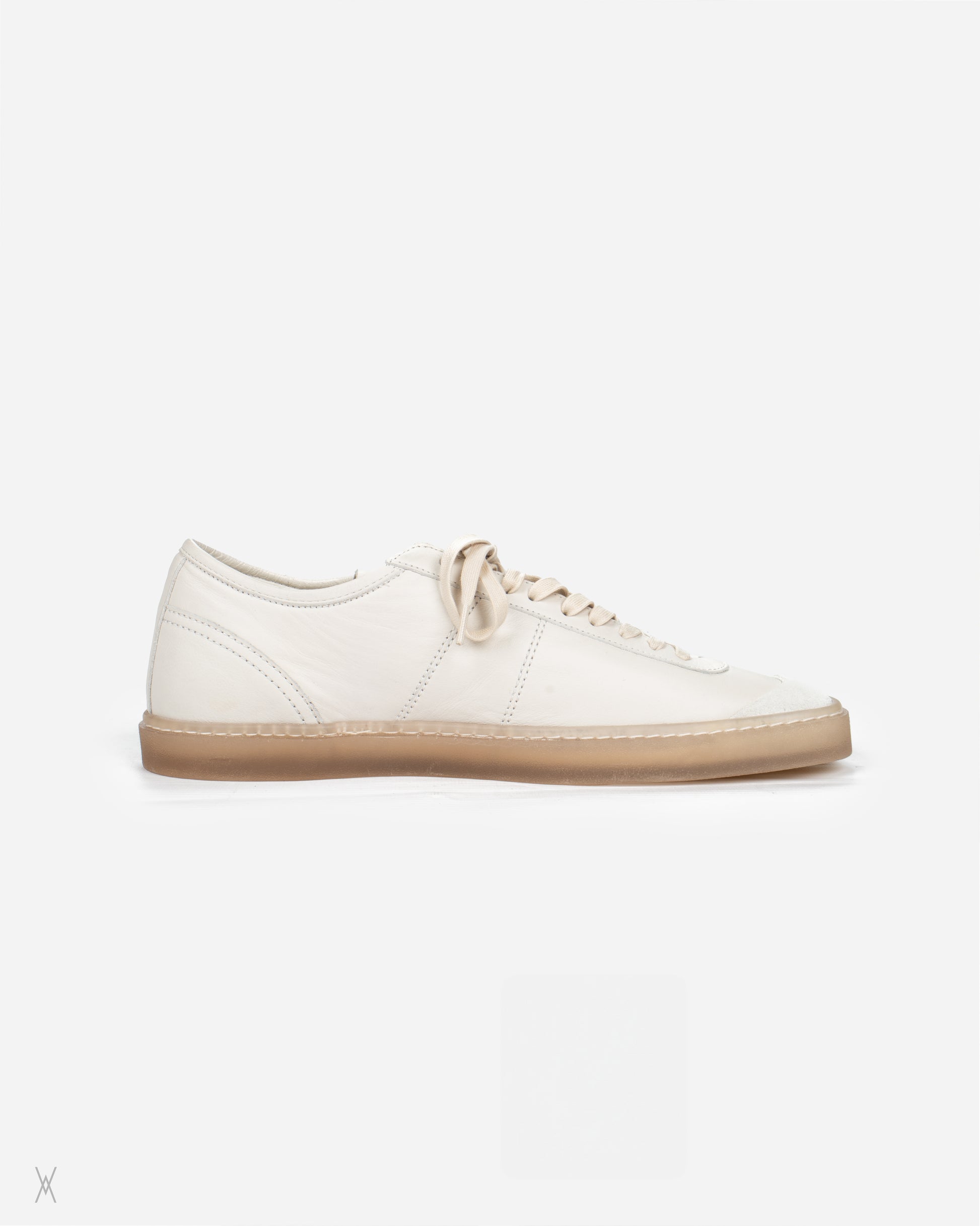 Lemaire “Linoleum” low-top sneaker in matte off-white with a soft square toe and natural gum cupsole. Tonal flat laces and blind eyelets keep the lines clean; minimal side paneling with neat, tonal stitching. Low-profile silhouette that sits well under wide trousers or straight denim. Light, flexible sole with a stable step; quiet, logo-free finish focused on proportion and texture. Edges are softly rounded at the toe and collar for a refined, easy break-in feel.