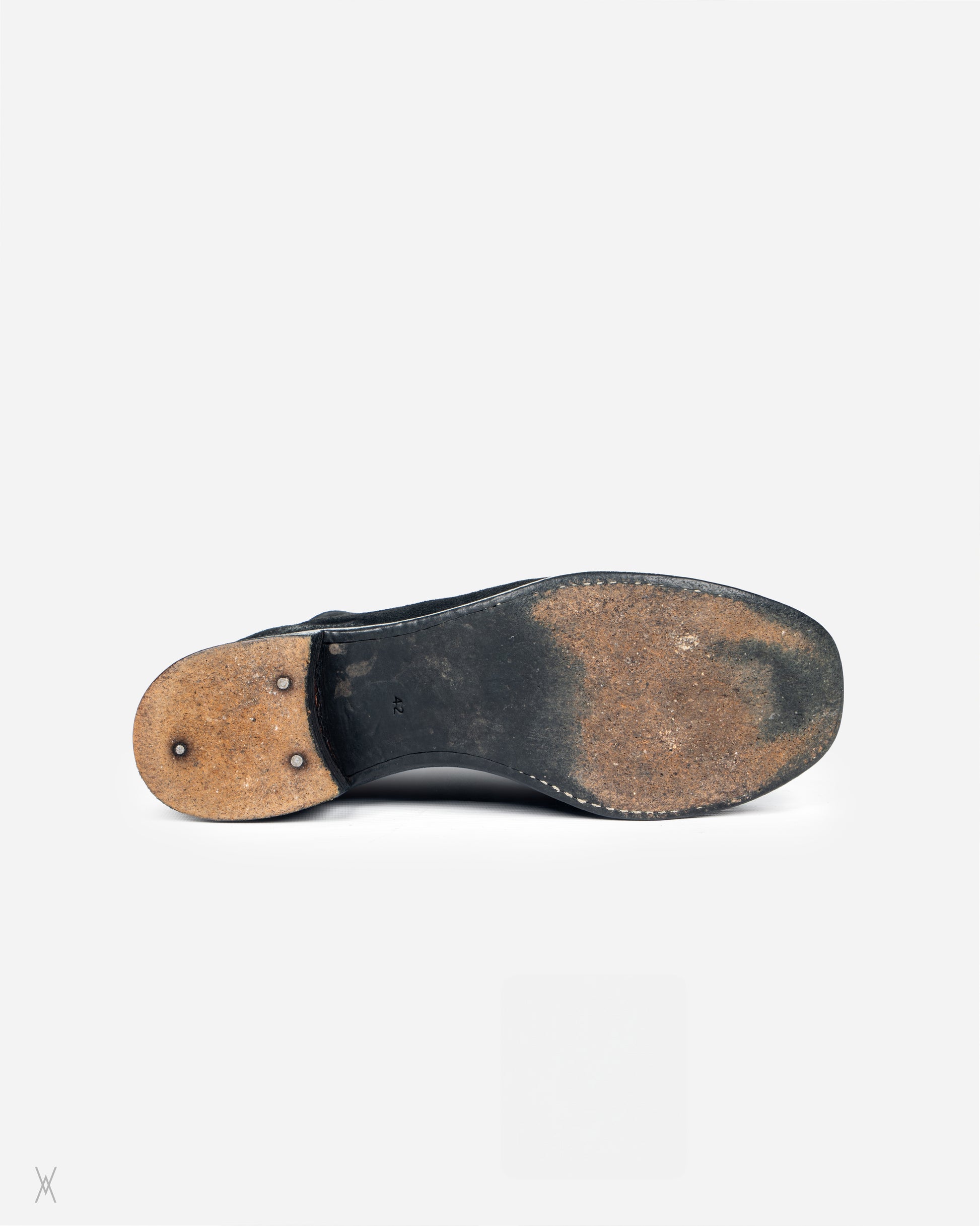 Guidi PL11L lace-up boots in deep black leather. Classic fully laced construction with a rounded toe, stitched leather sole and stacked leather heel. The surface has the natural matte, slightly rough texture Guidi is known for. Handmade in Italy with the brand’s traditional artisanal finish.