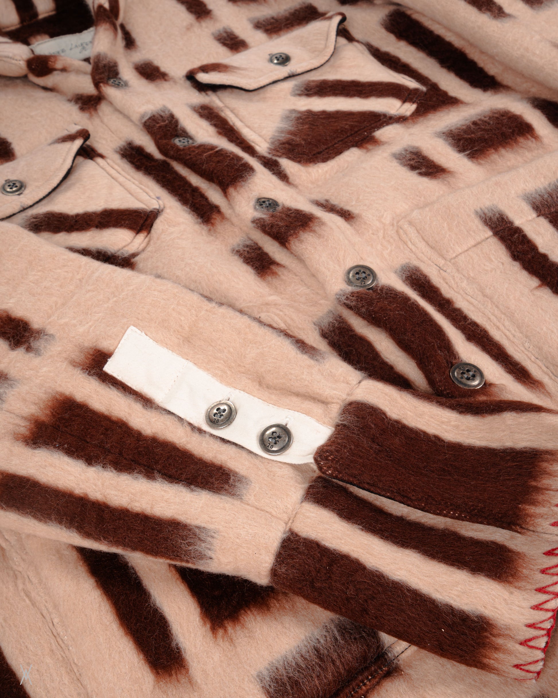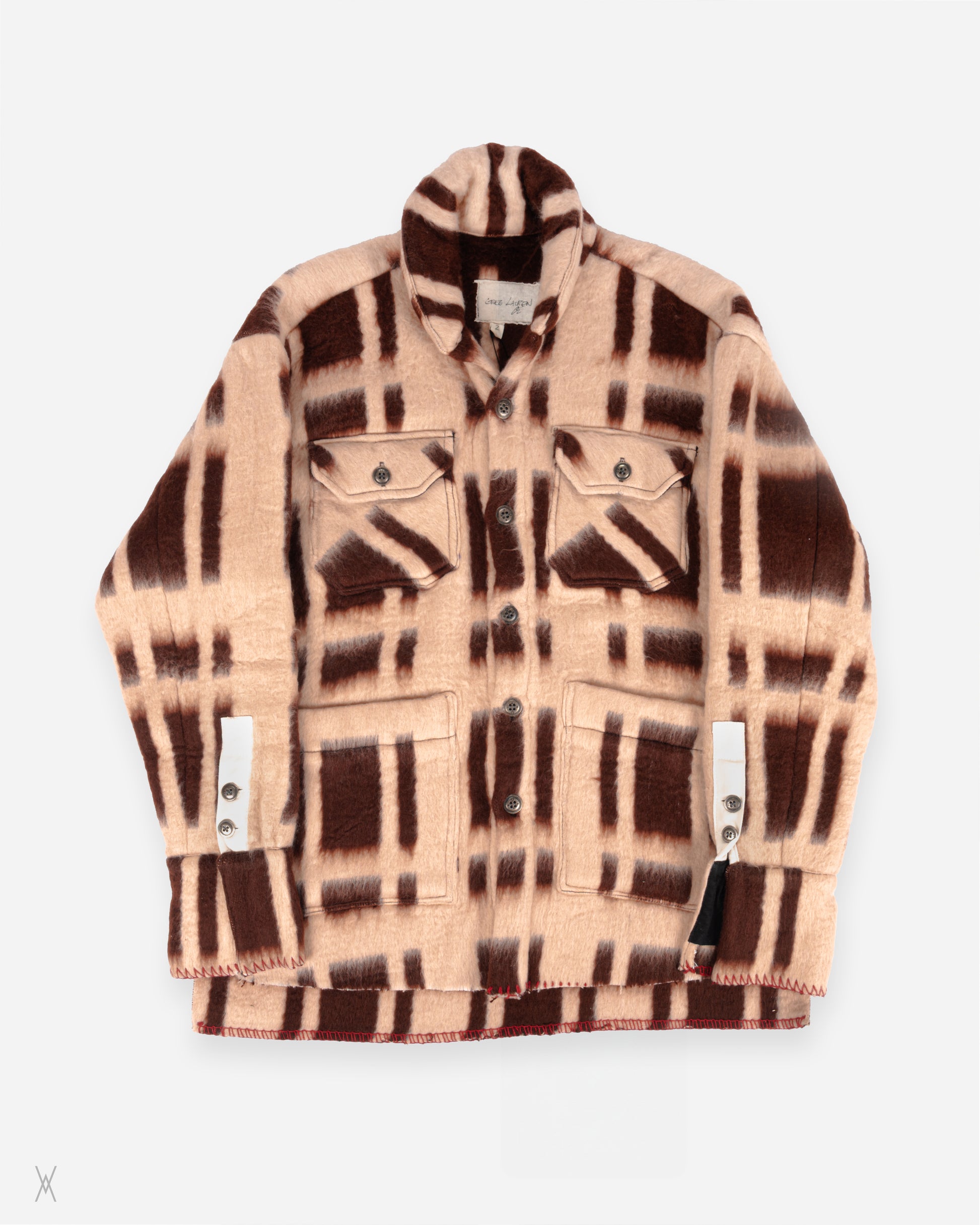 Greg Lauren “Plaid Blanket Shawl Collar Boxy” overshirt/jacket. Hand-crafted in Los Angeles from 100% woolblanket cloth with a brushed, fuzzy pile and Greg’s signature blurred plaid in sand/brown. Shawl collar, button front, four pockets (flapped chest + lower patch), and contrast white twill cuff tabs with metal buttons. Raw-edge/hand-finish attitude throughout with visible whipstitching at the hem—classic GL atelier work. Made in USA.