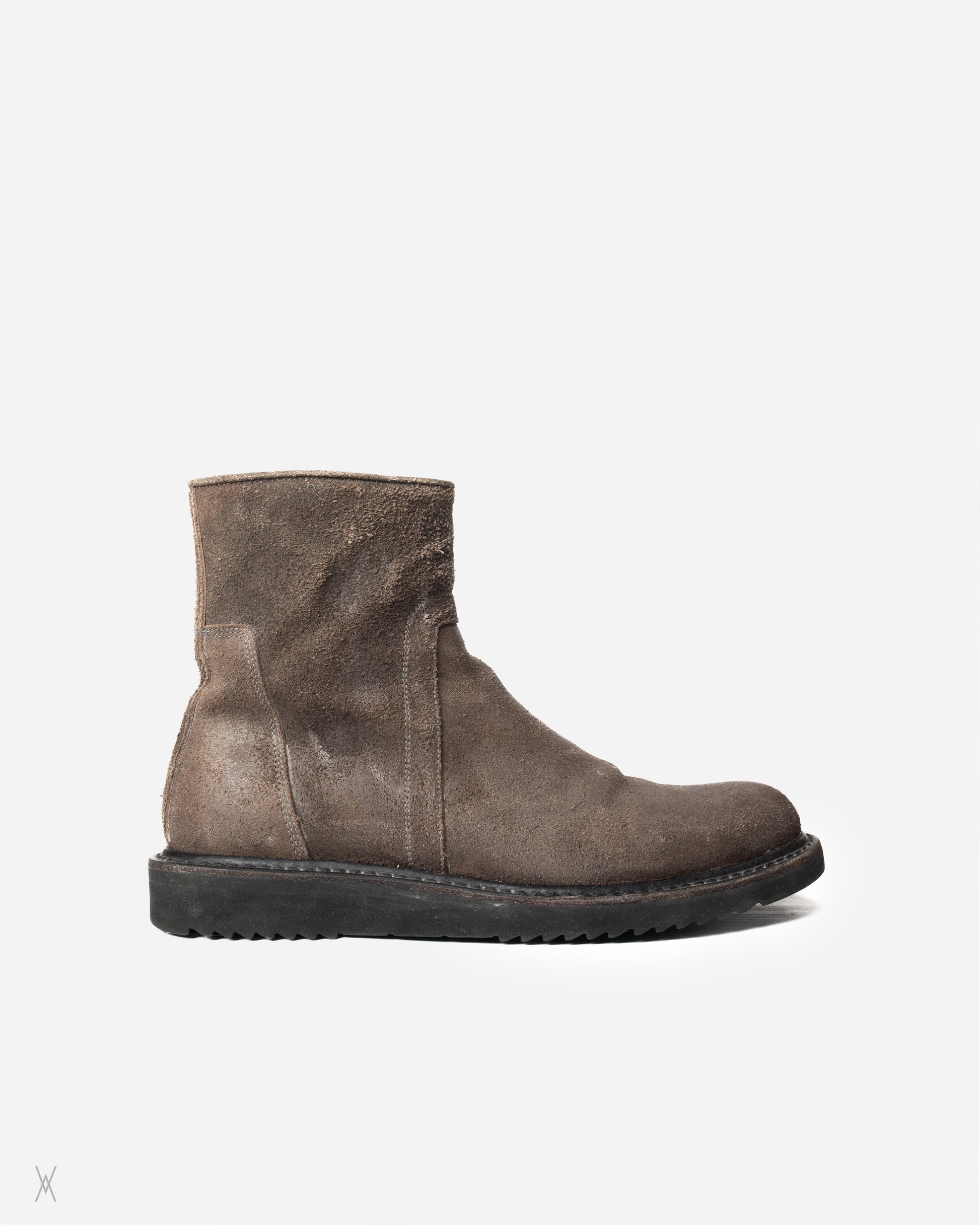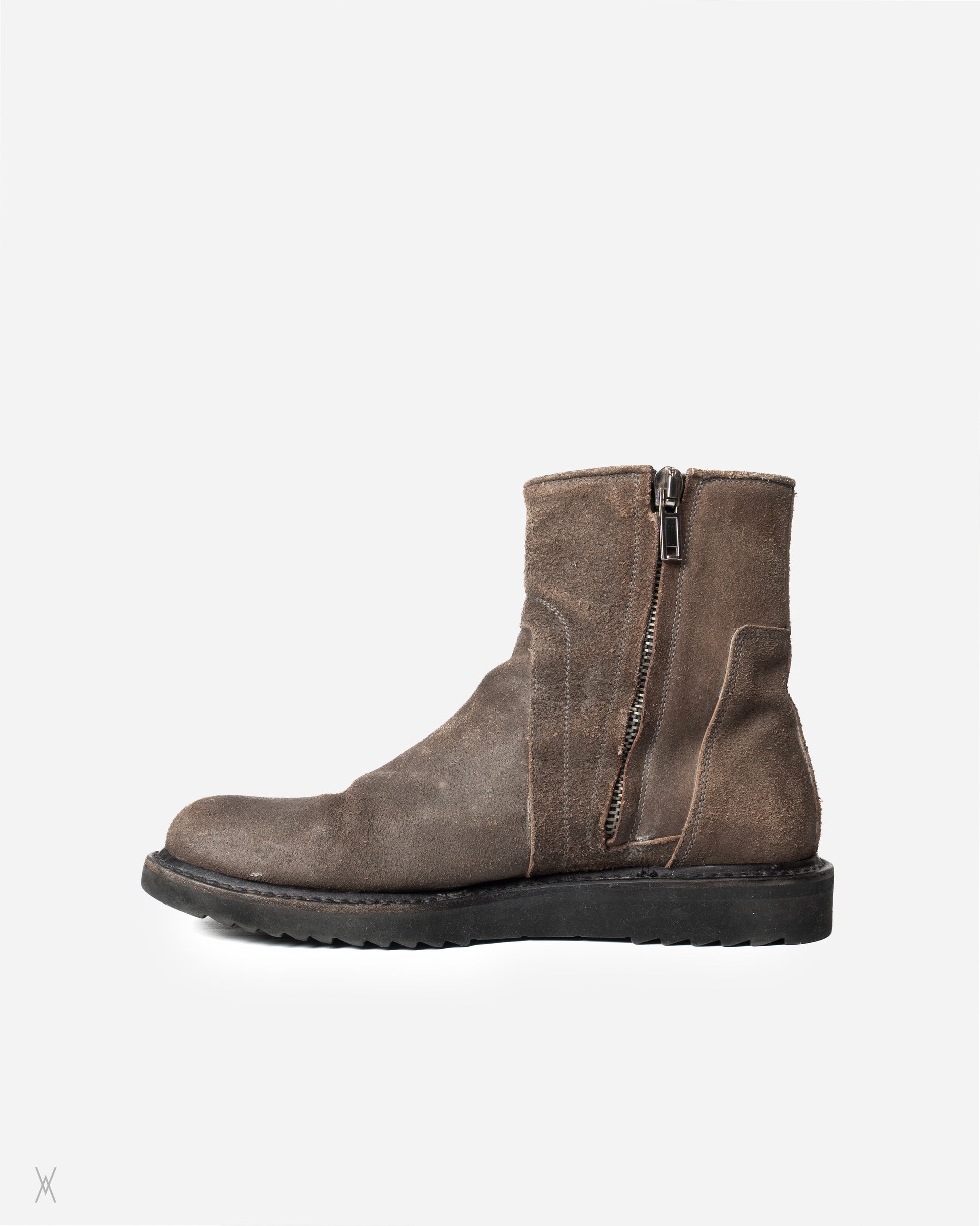 Rick Owens suede creeper boots from the early 2010s, constructed from thick, textured blistered suede leather in a dark brown tone. The boots feature a mid-height shaft with side zip closure, layered panel construction, and a rounded toe shape. Finished with a black rubber creeper-style sole providing a flat profile and pronounced tread.