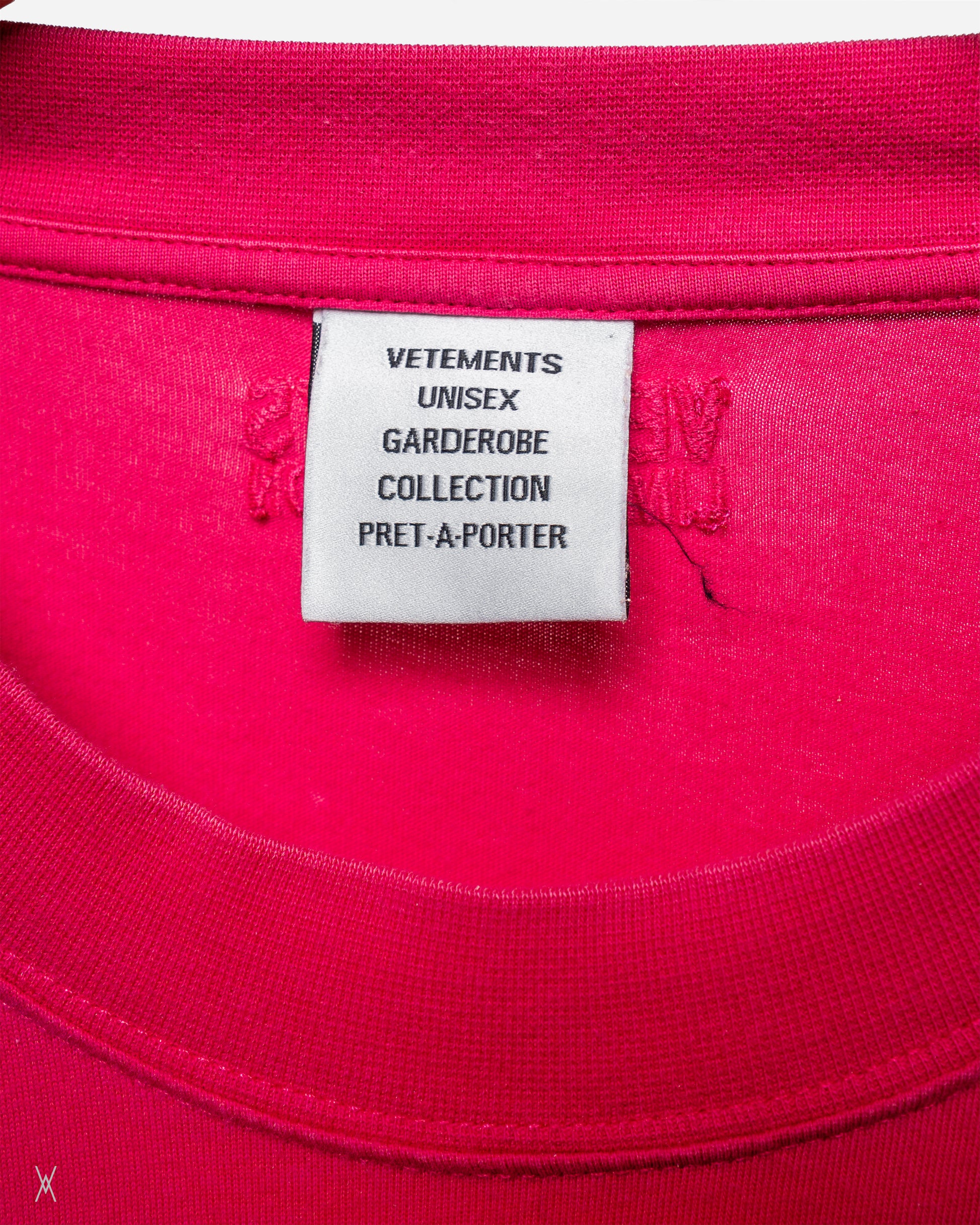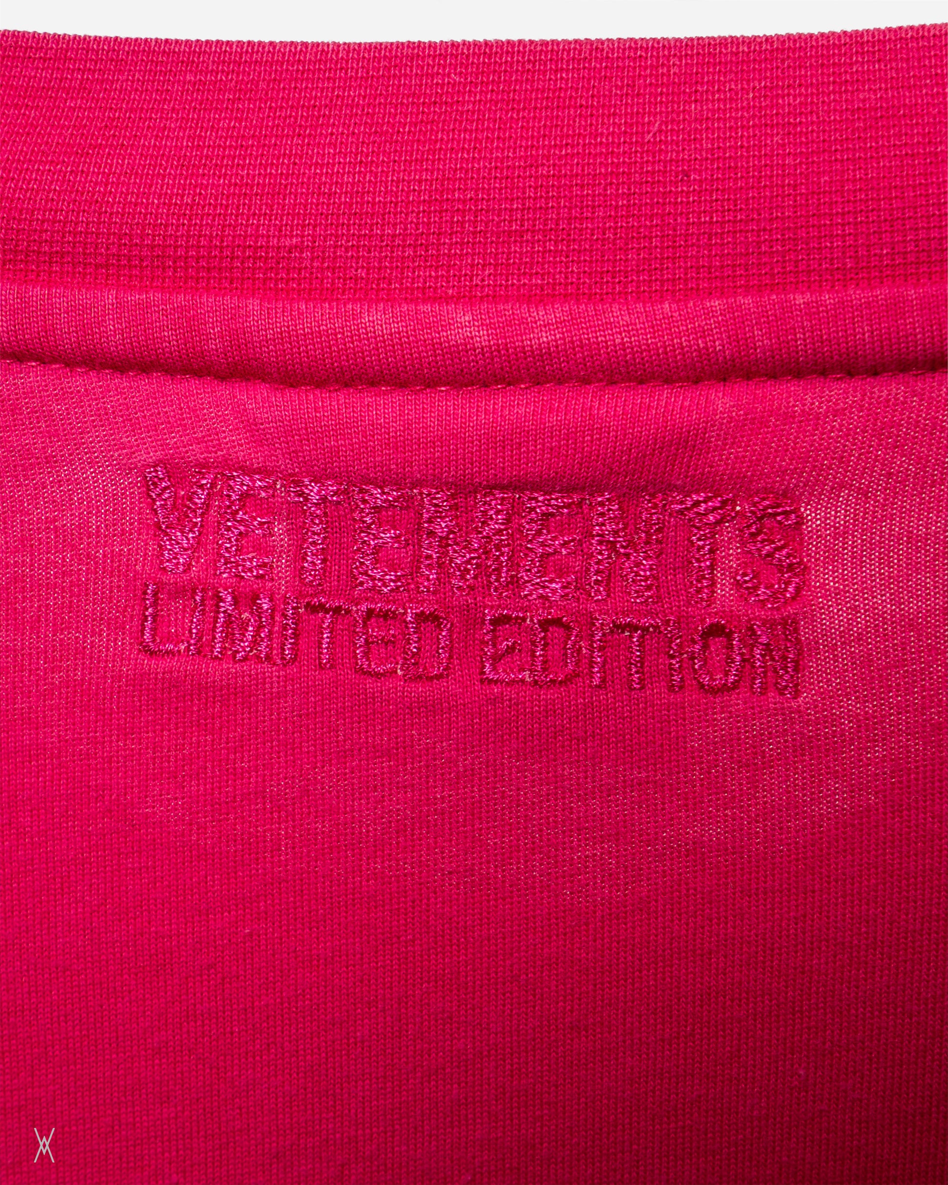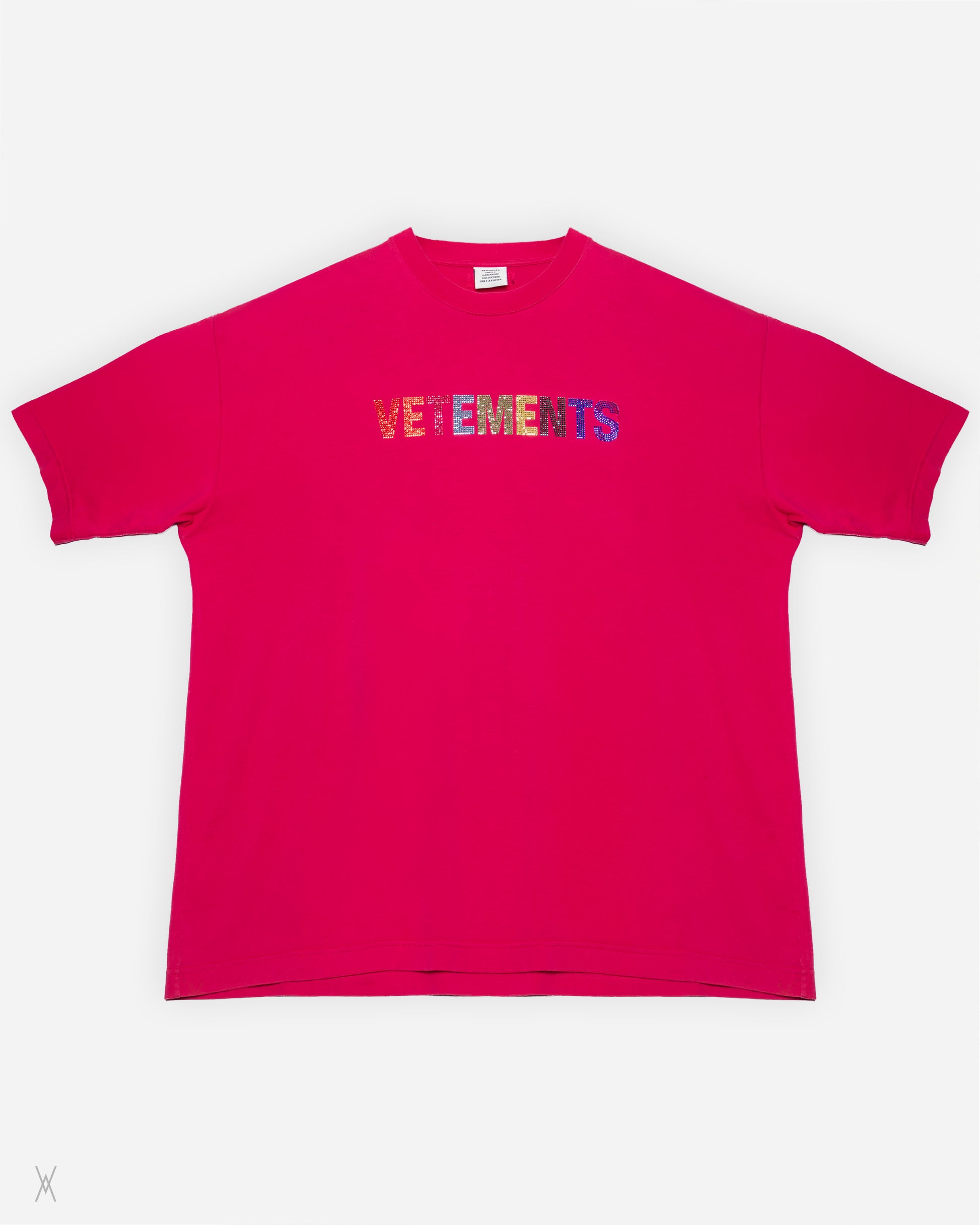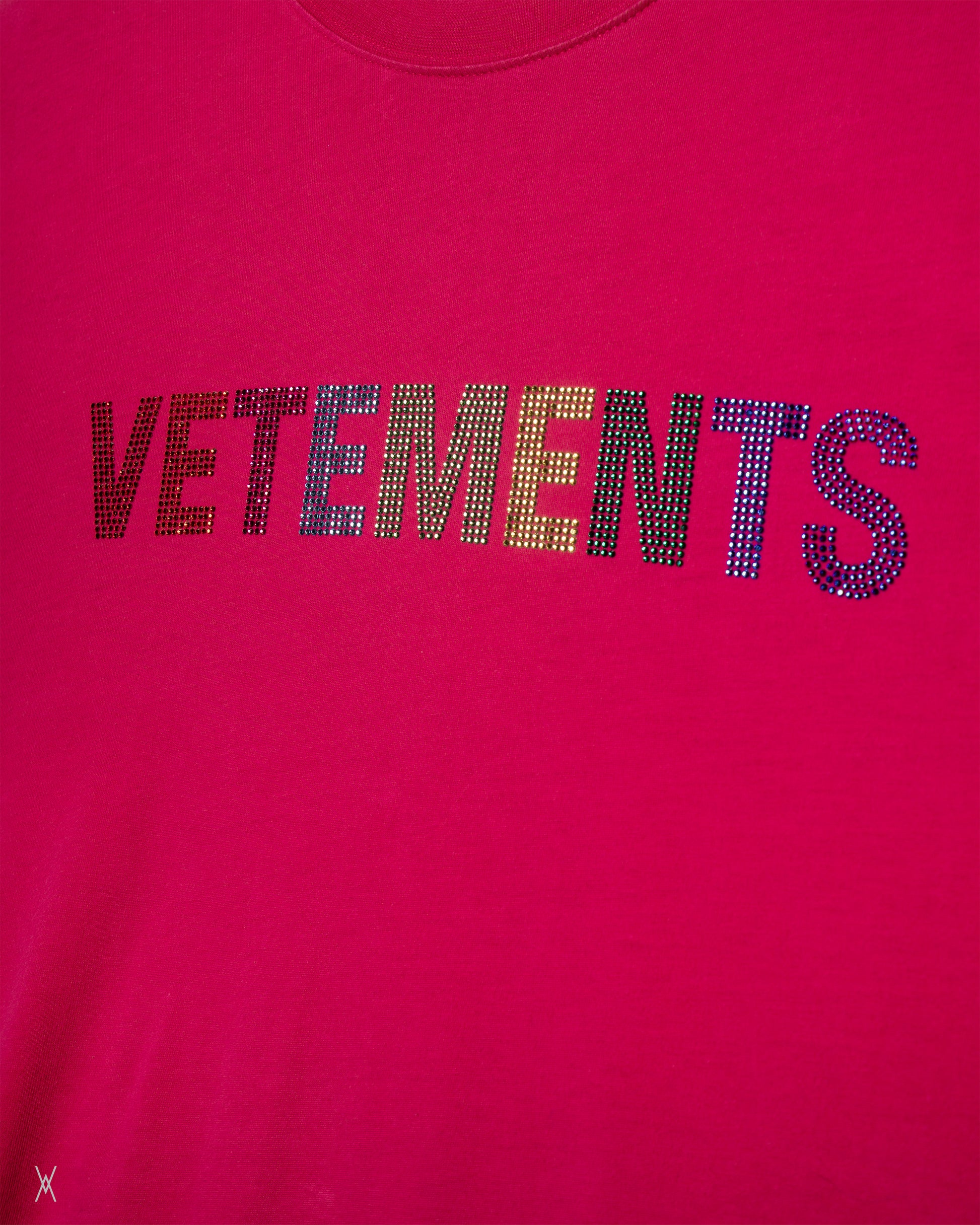 The front features a multicolor crystal-embellished Vetements logo applied directly to the chest. Construction is clean and minimal, with straight hems and a soft drape. An embroidered “Vetements Limited Edition” marking is placed at the upper back below the neckline. Designed for an oversized, unisex fit.