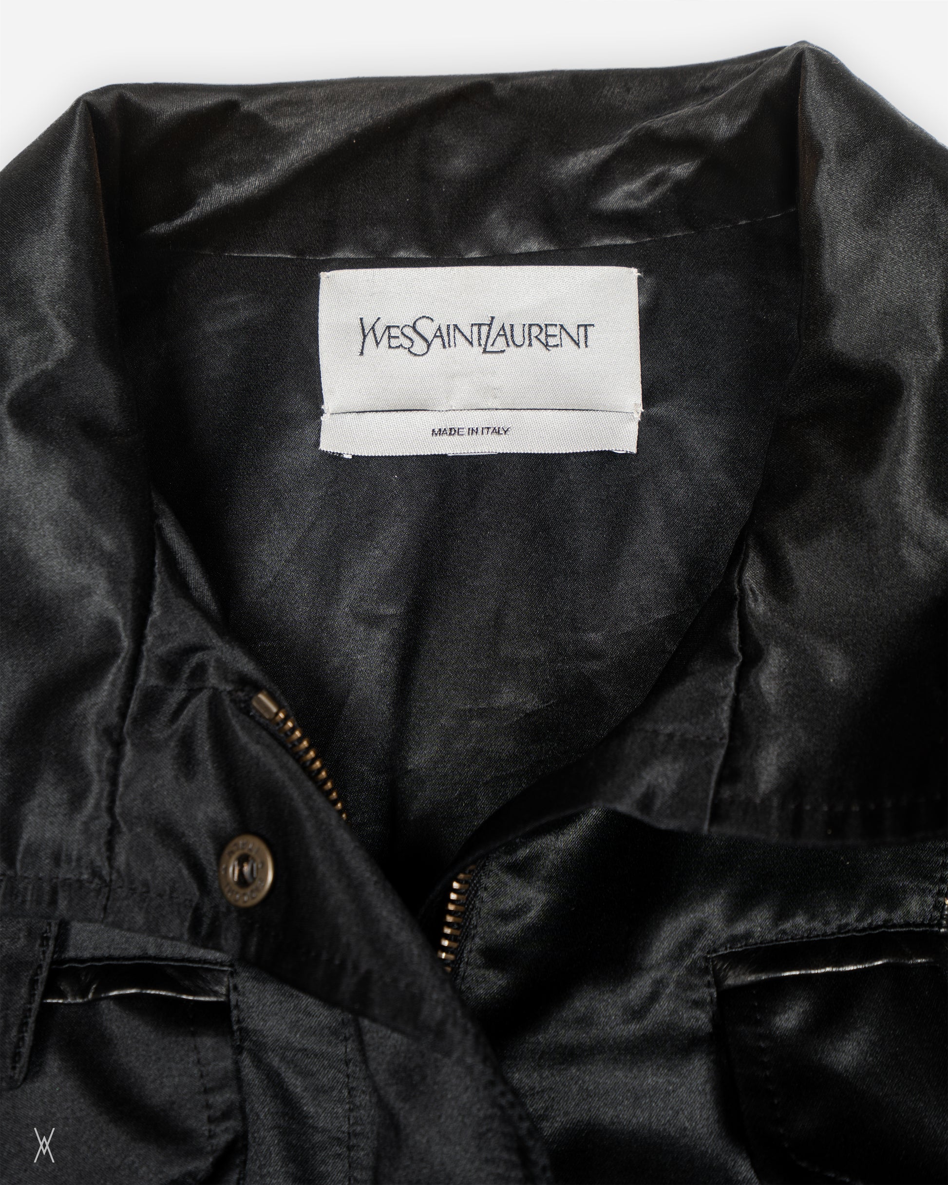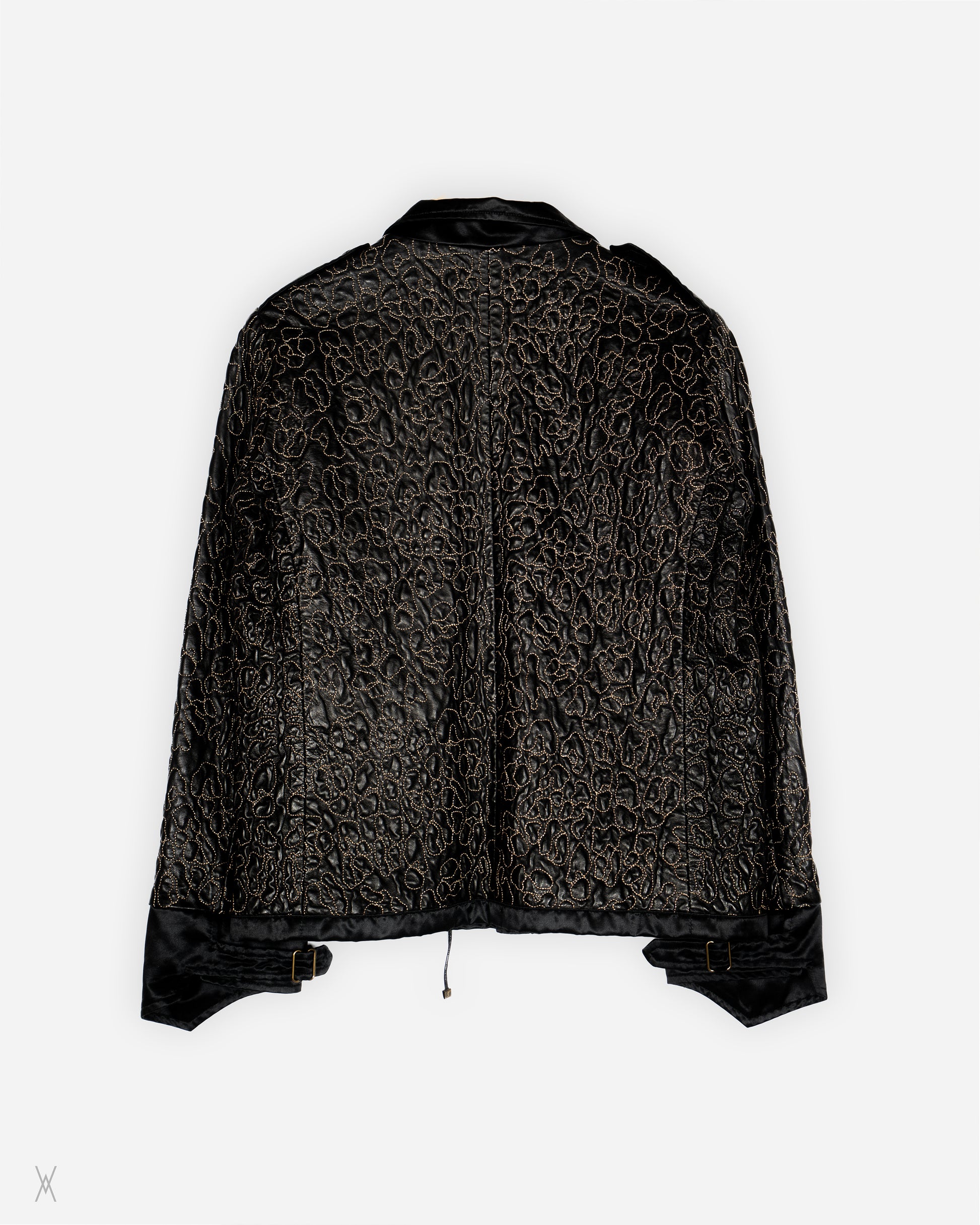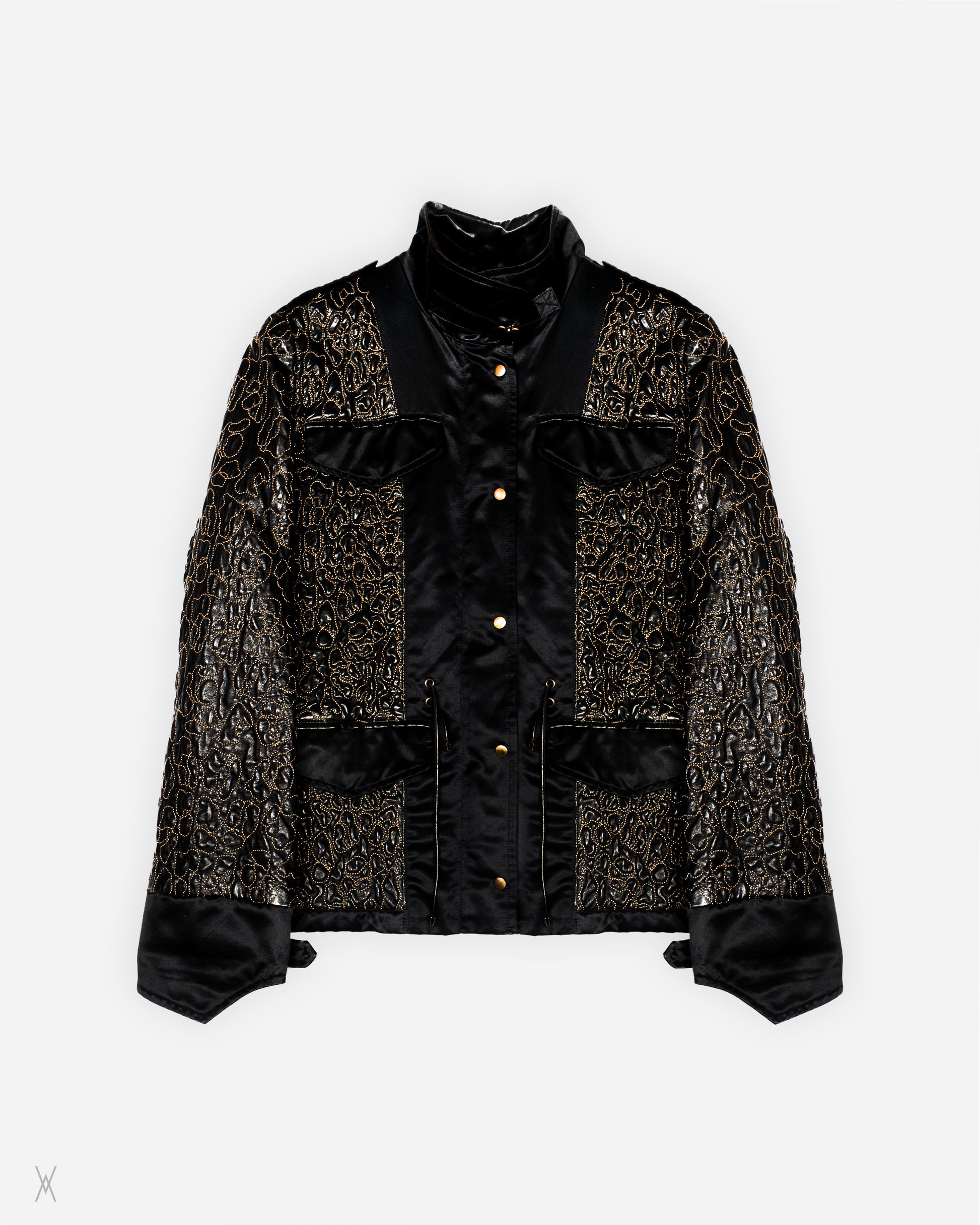 Very rare early 2000s Yves Saint Laurent jacket built in a mixed material construction that contrasts glossy black base panels with raised embroidered leather sections across the sleeves body and back. The leather is worked with an all over organic motif stitched in warm metallic thread giving the surface a textured almost relief finish while the satin like panels keep the silhouette clean and sharp. Stand collar and a structured straight cut make it read like a utility jacket at first glance but the fabric treatment and embroidery push it into statement archive territory. Finished with a snap front plus an inner zip multi pocket layout and hardware details including eyelets and lace style waist adjustment and buckle tabs at the cuffs and hem. Made in Italy with a viscose cotton lining. Fiocchi hardware.