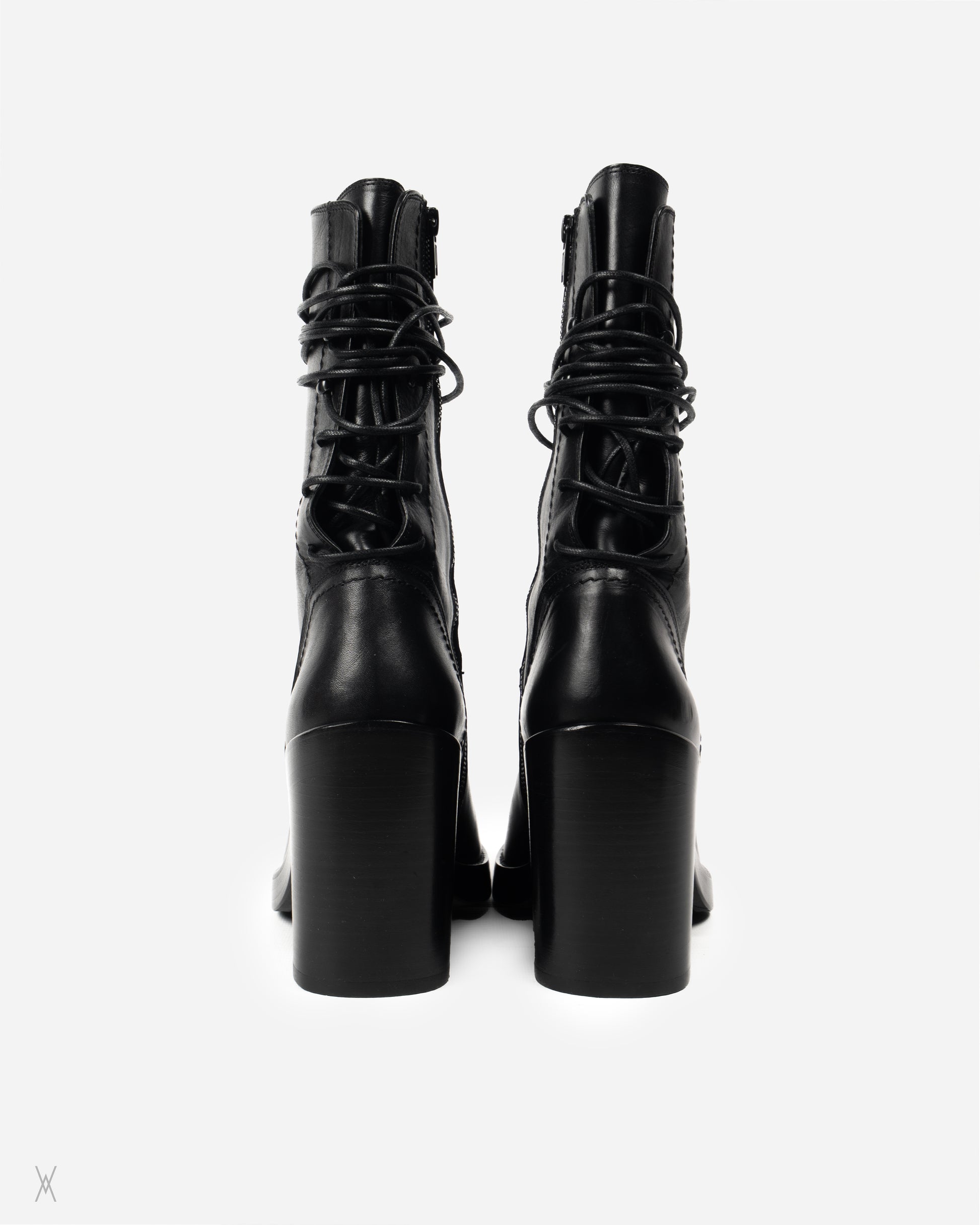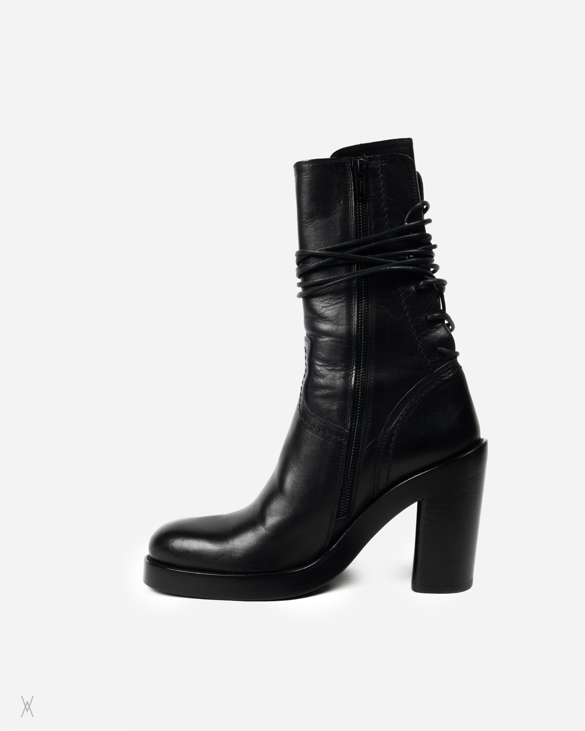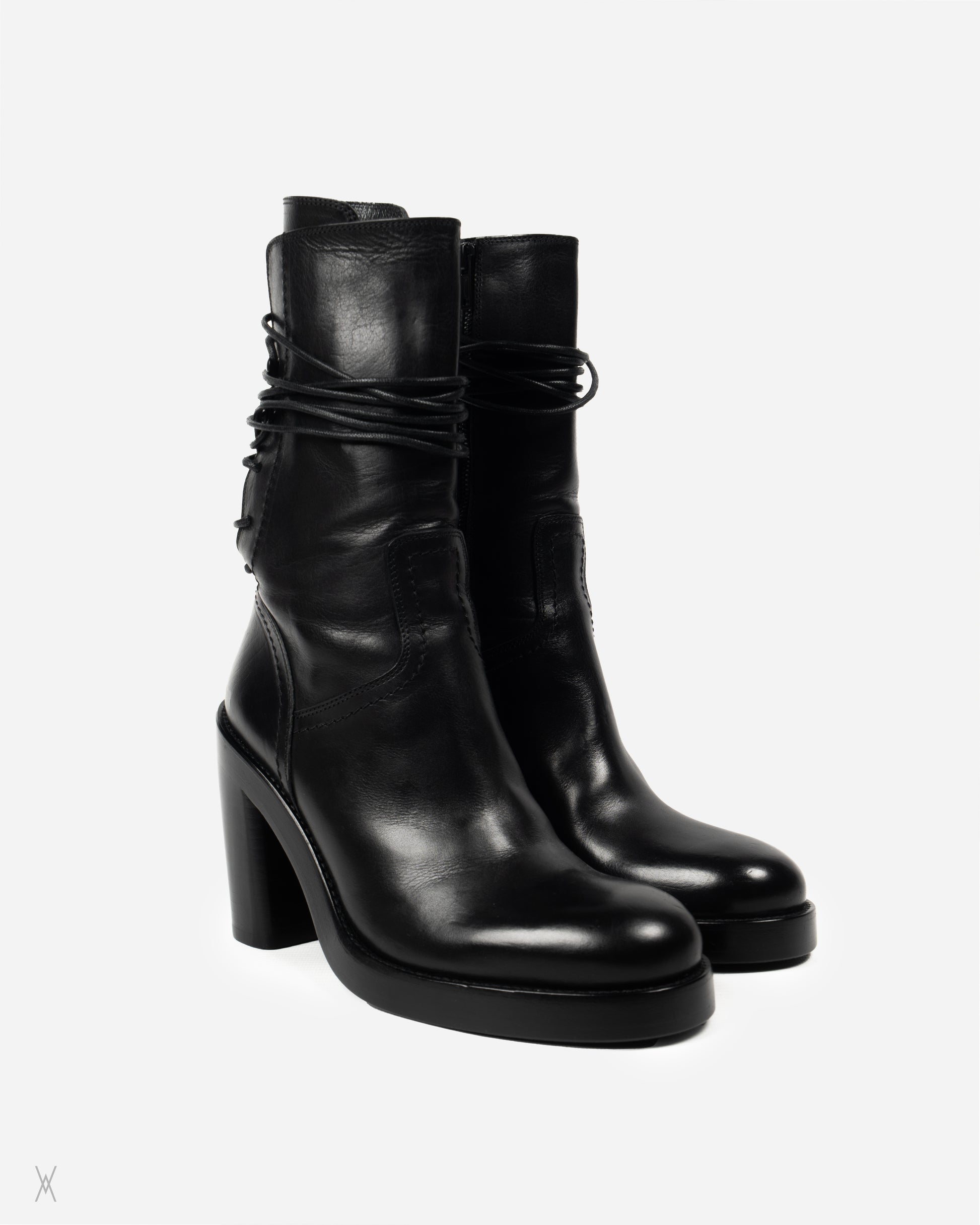 Ann Demeulemeester black leather lace-up ankle boots with a bold platform and high block heel. Crafted in Italy with a smooth leather upper and a rounded toe, finished with a front lace-up panel and signature long laces designed to wrap around the ankle. Functional side zip closure for easier entry, with clean tonal stitching and a sculpted heel profile that gives height without losing stability. Leather outsole stamped “Vero Cuoio” with Ann Demeulemeester branding.