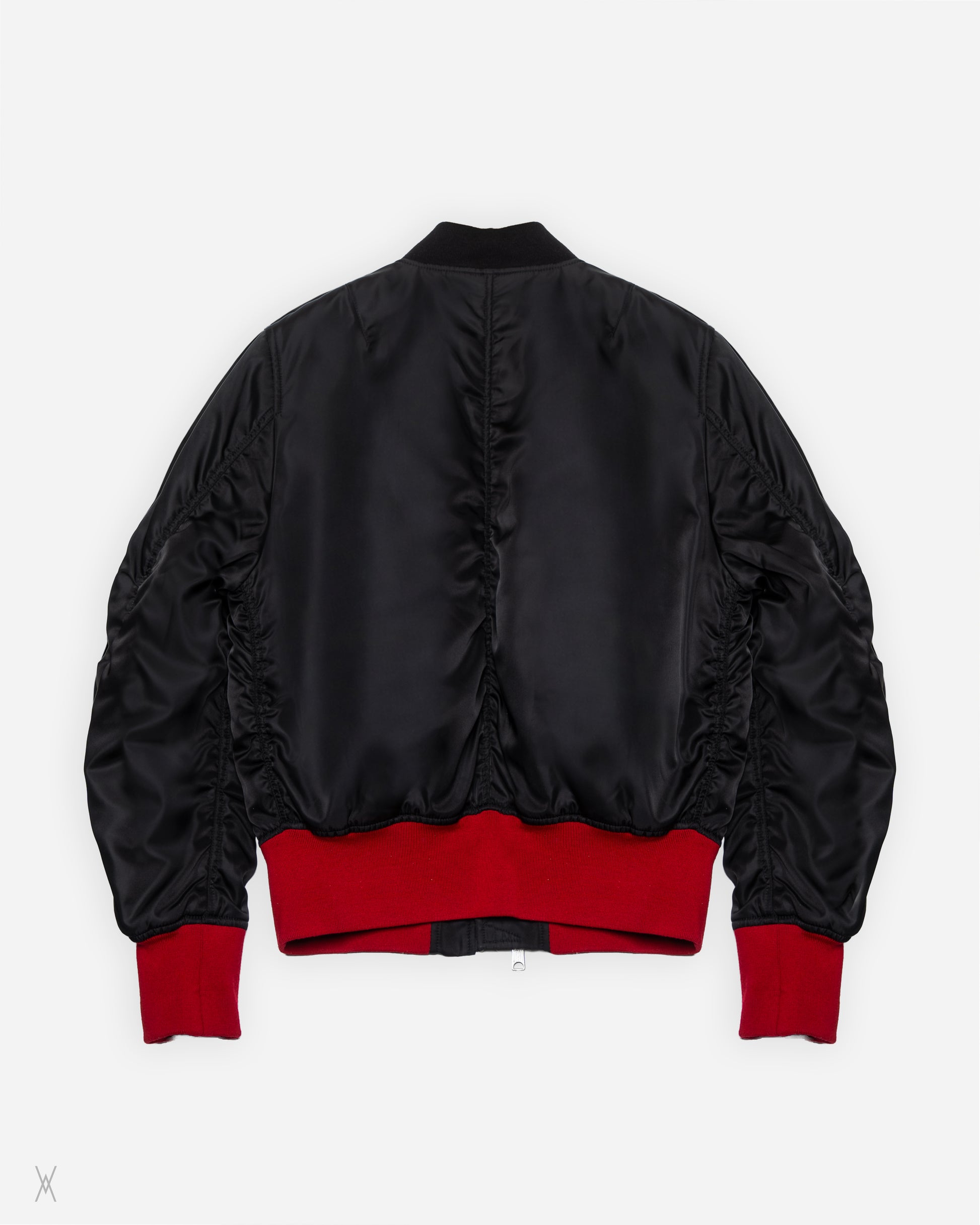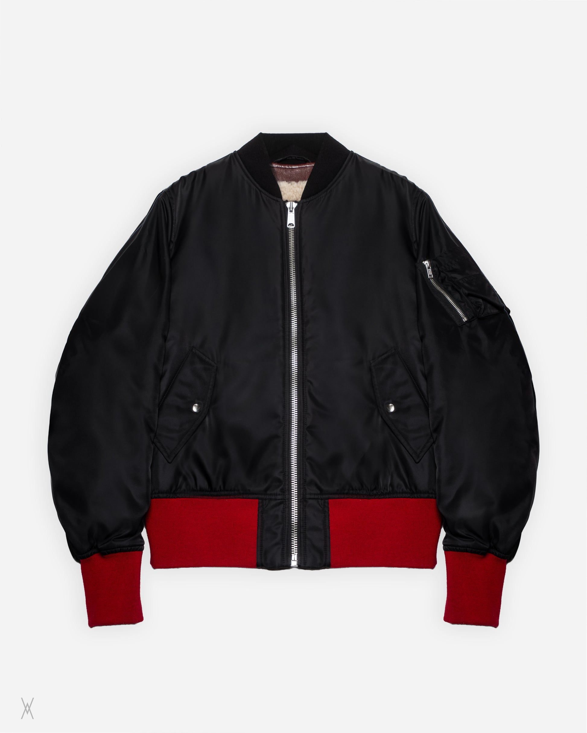 Calvin Klein 205W39NYC bomber jacket, produced in Italy and reflecting the refined utilitarian language of the Raf Simons era. Constructed with a smooth black nylon outer shell, the jacket is fully lined with plush shearling for warmth and structure. The design follows a classic MA-1 silhouette, elevated through precise proportions and contrasting ribbed knit trims in deep red at the hem and cuffs.