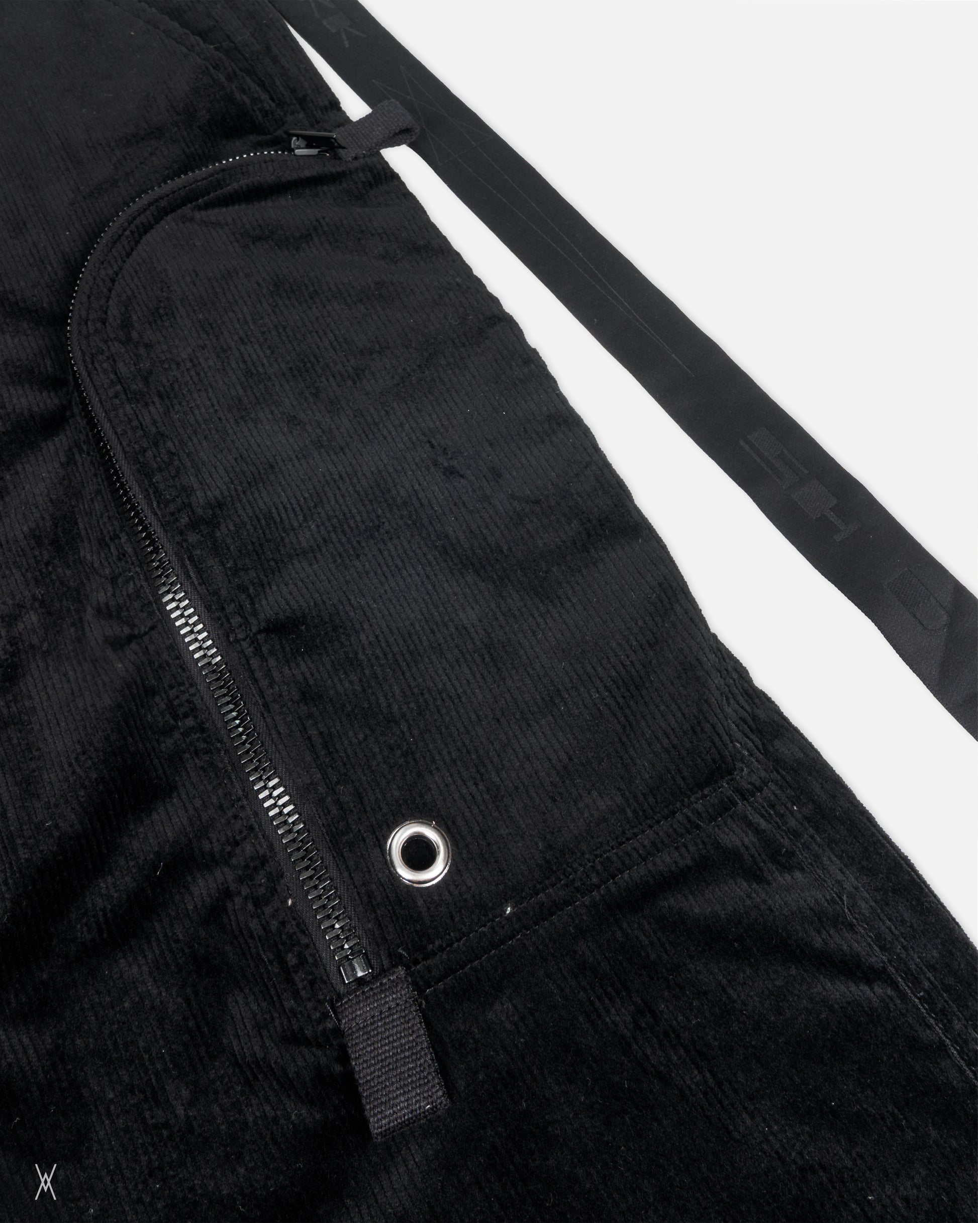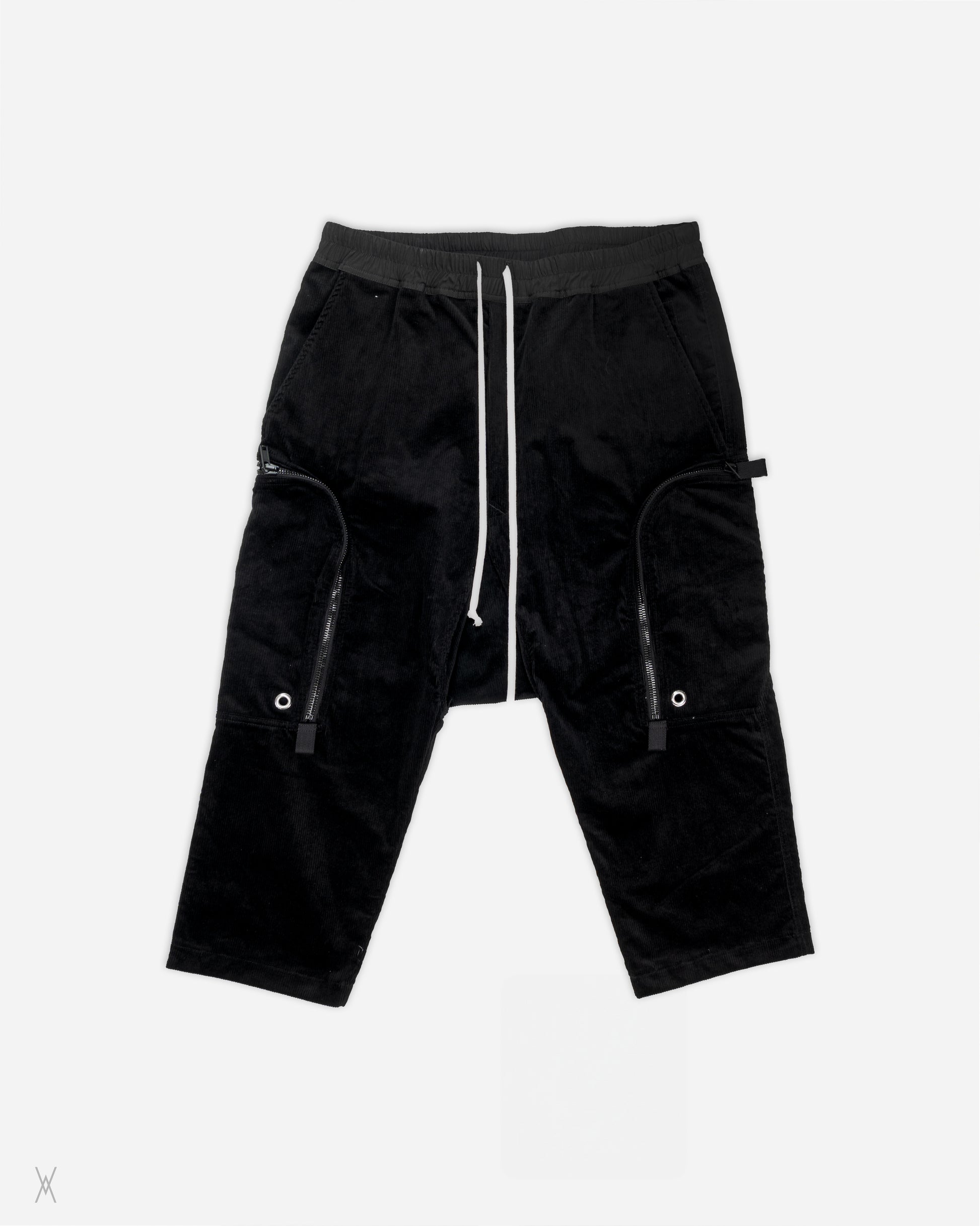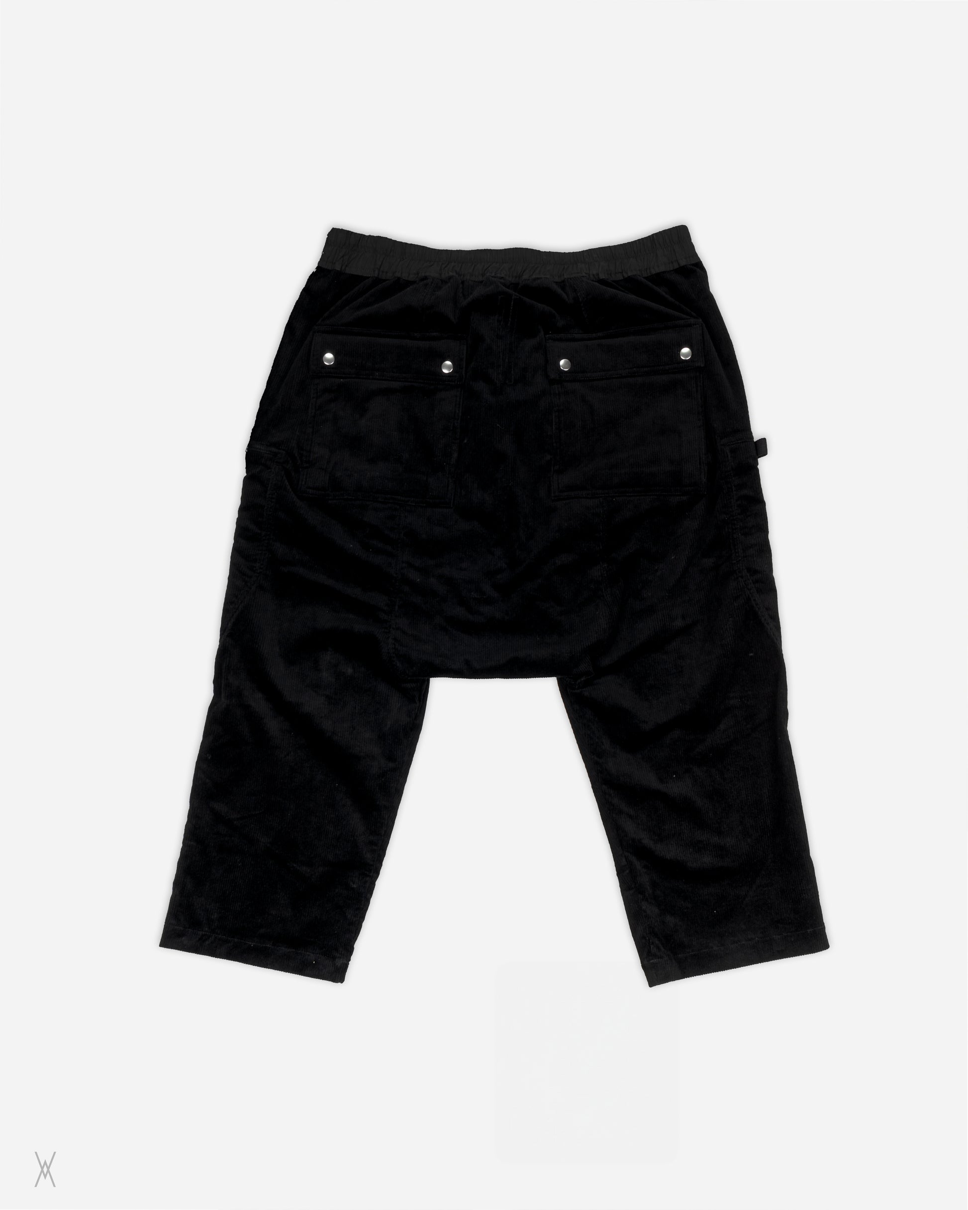 Signature Rick Owens DRKSHDW 3/4 pants crafted from heavyweight black corduroy with a structured, slightly elastic handle. Featuring the iconic Bauhaus pockets — curved zip pockets with oversized metal eyelets — a dropped crotch construction, and an elastic waistband with exaggerated drawstrings. Rear snap-button flap pockets balance the silhouette, while tonal webbing detail reinforces the garment’s utilitarian identity.