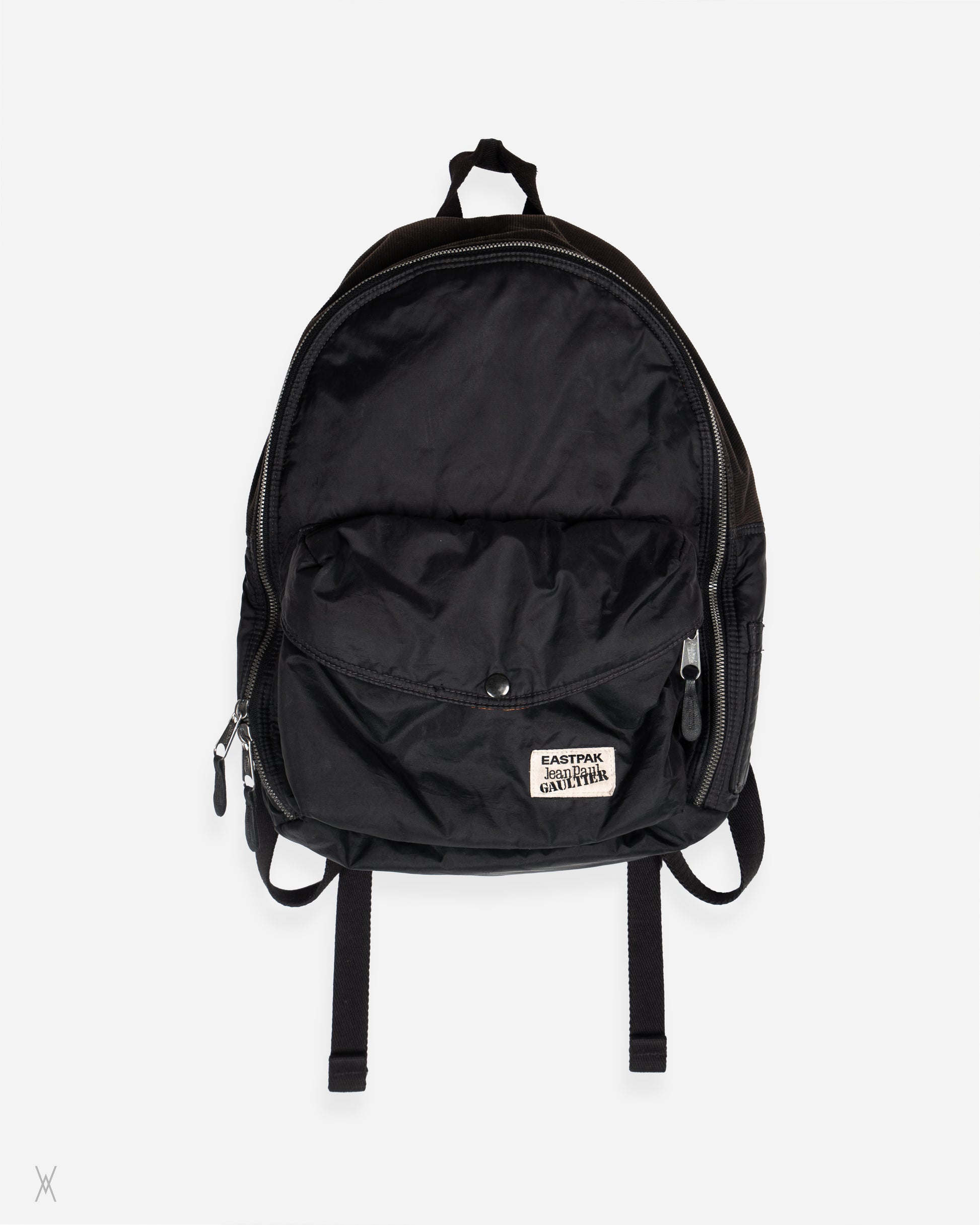Eastpak x Jean Paul Gaultier backpack built in the classic MA-1 bomber style. Black nylon shell with a soft, slightly slouchy structure and the signature bright-orange quilted lining inside. Features a welt detail on the top, a bomber pocket detail on the side, oversized two-way zippers, a front pocket with snap closure, and the stitched Eastpak × Jean Paul Gaultier patch. A clean, functional design with strong archival Gaultier character.