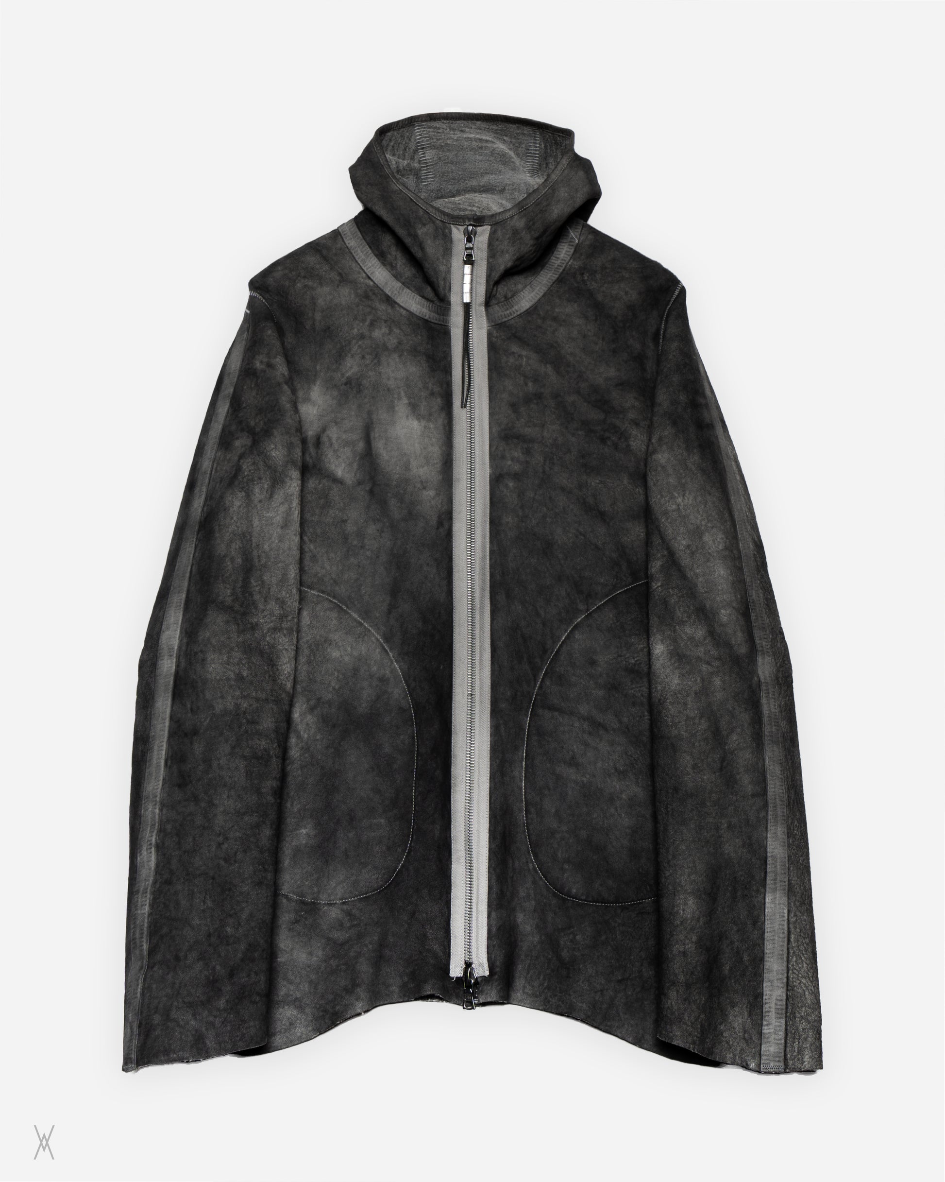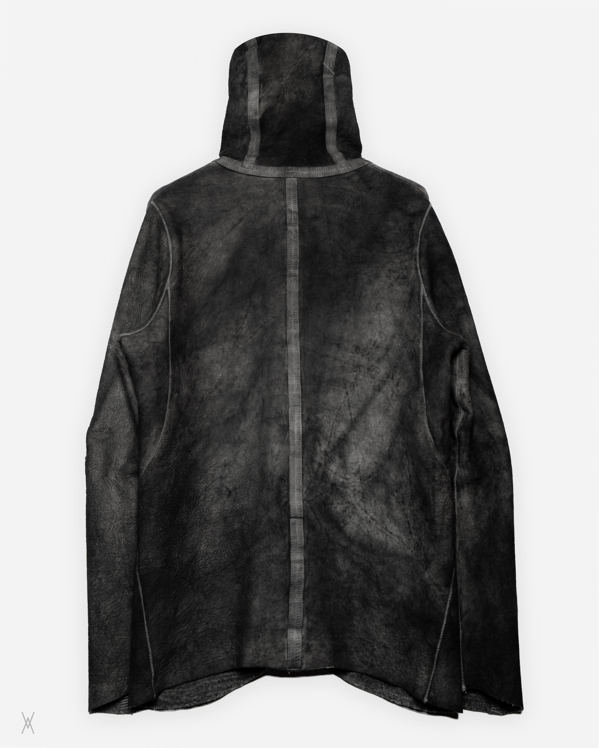 Isaac Sellam hooded leather jacket constructed from treated leather with a matte, textured surface and tonal variation across panels. The jacket features a full front zip closure, integrated hood, and curved seam construction shaping the body. Finished with zippered hand pockets and reinforced paneling along the sleeves and back.