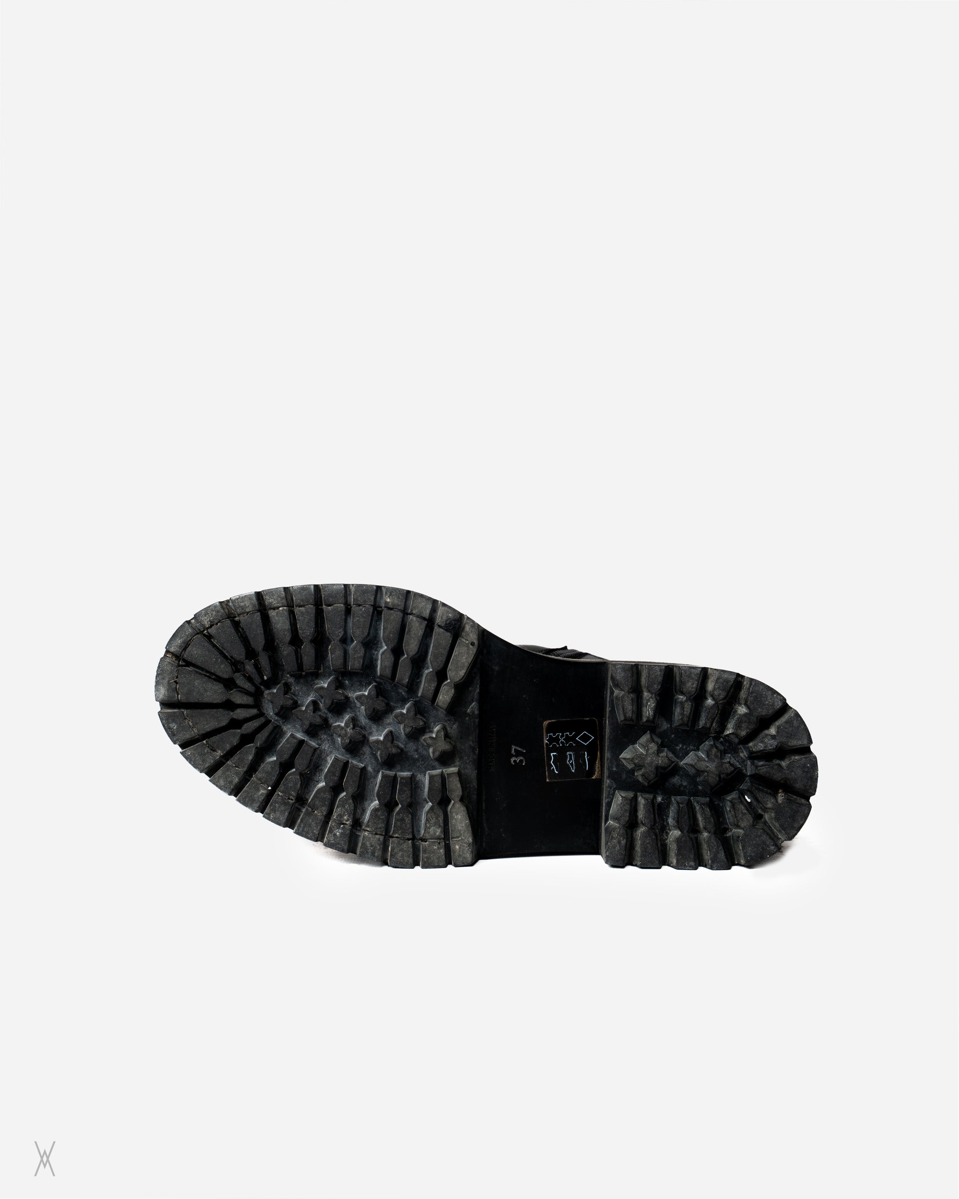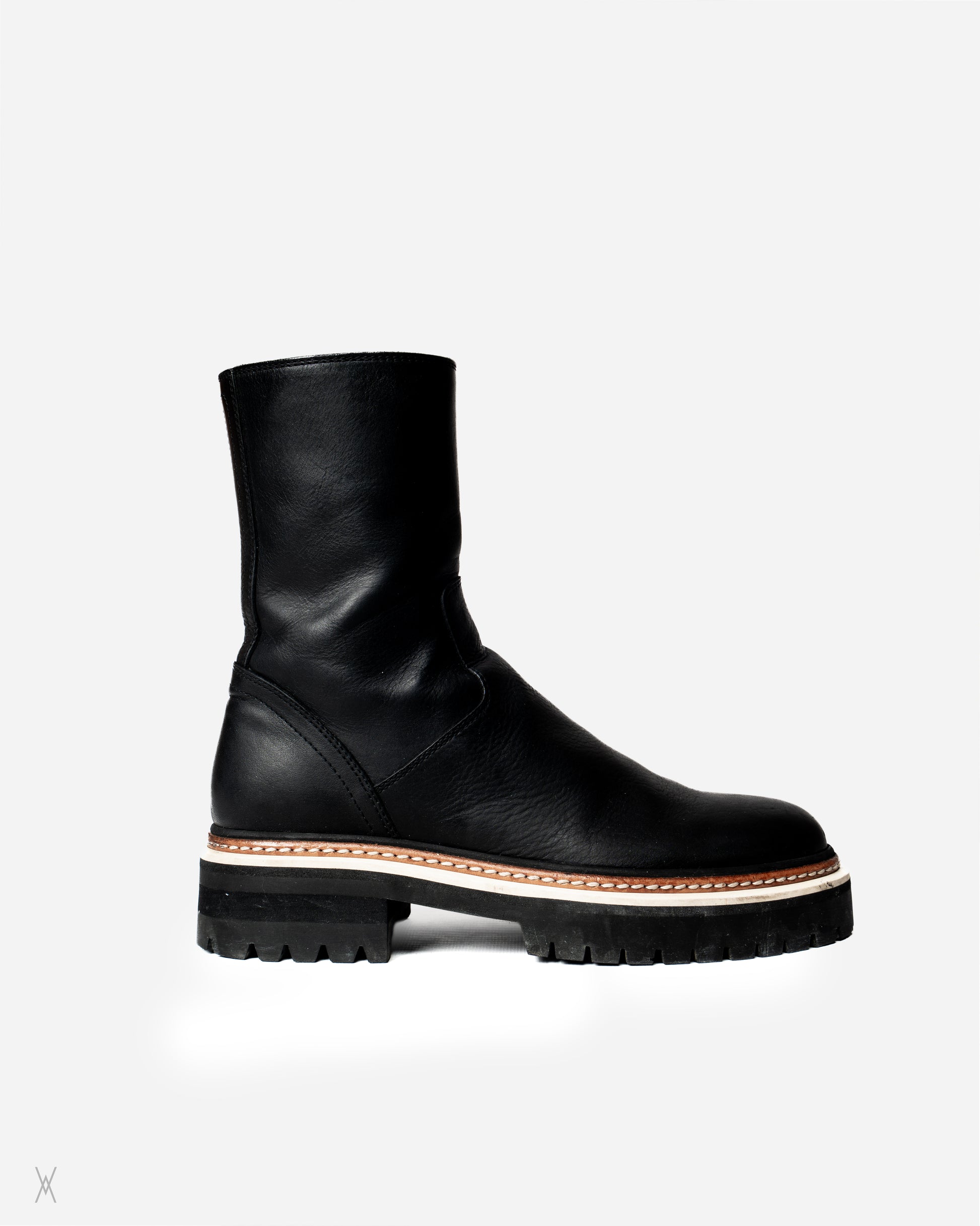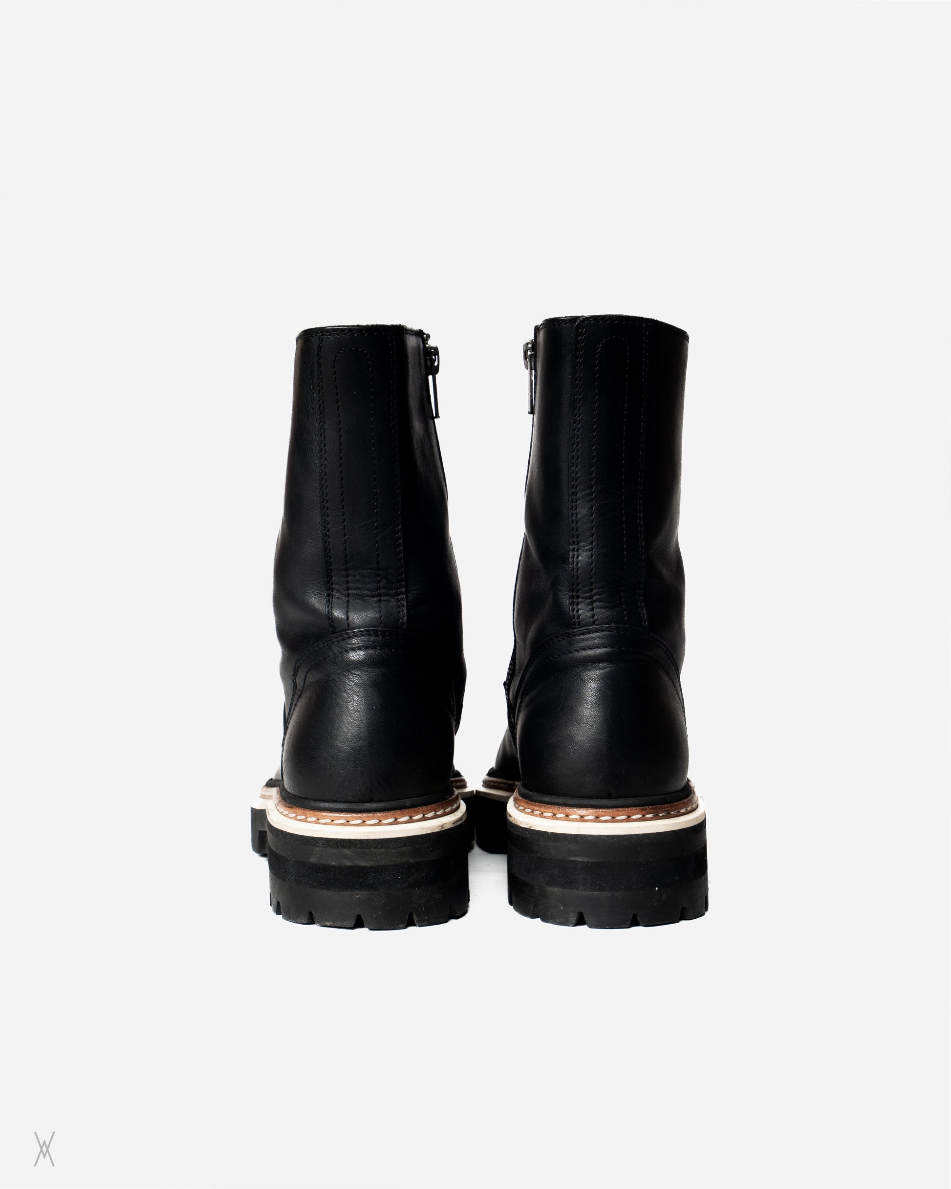 Ann Demeulemeester leather boots crafted in Italy. Executed in smooth black leather with a structured, utilitarian silhouette characteristic of the brand’s footwear language. Mid-calf height with a side zip closure for ease of wear. Set on a solid lug sole with a stitched mid-layer, adding weight and durability while keeping the overall design restrained. Clean paneling and minimal detailing place the focus on material and construction.