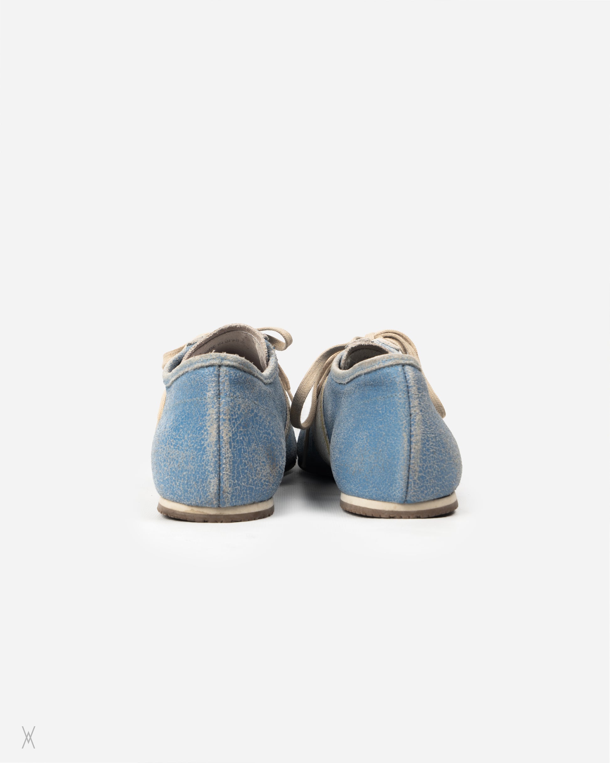 Miu Miu vintage sneakers in soft sky blue with white and yellow side stripes. Crafted with a distinctive crackled finish that gives a unique texture and retro depth to the surface. Low-profile silhouette with perforated detailing, tonal stitching, and beige laces. Lightweight and minimal, these sneakers echo 1970s athletic shapes but through a distinctly Miu Miu lens — refined, playful, and quietly eccentric. Rare and virtually impossible to find in this size.