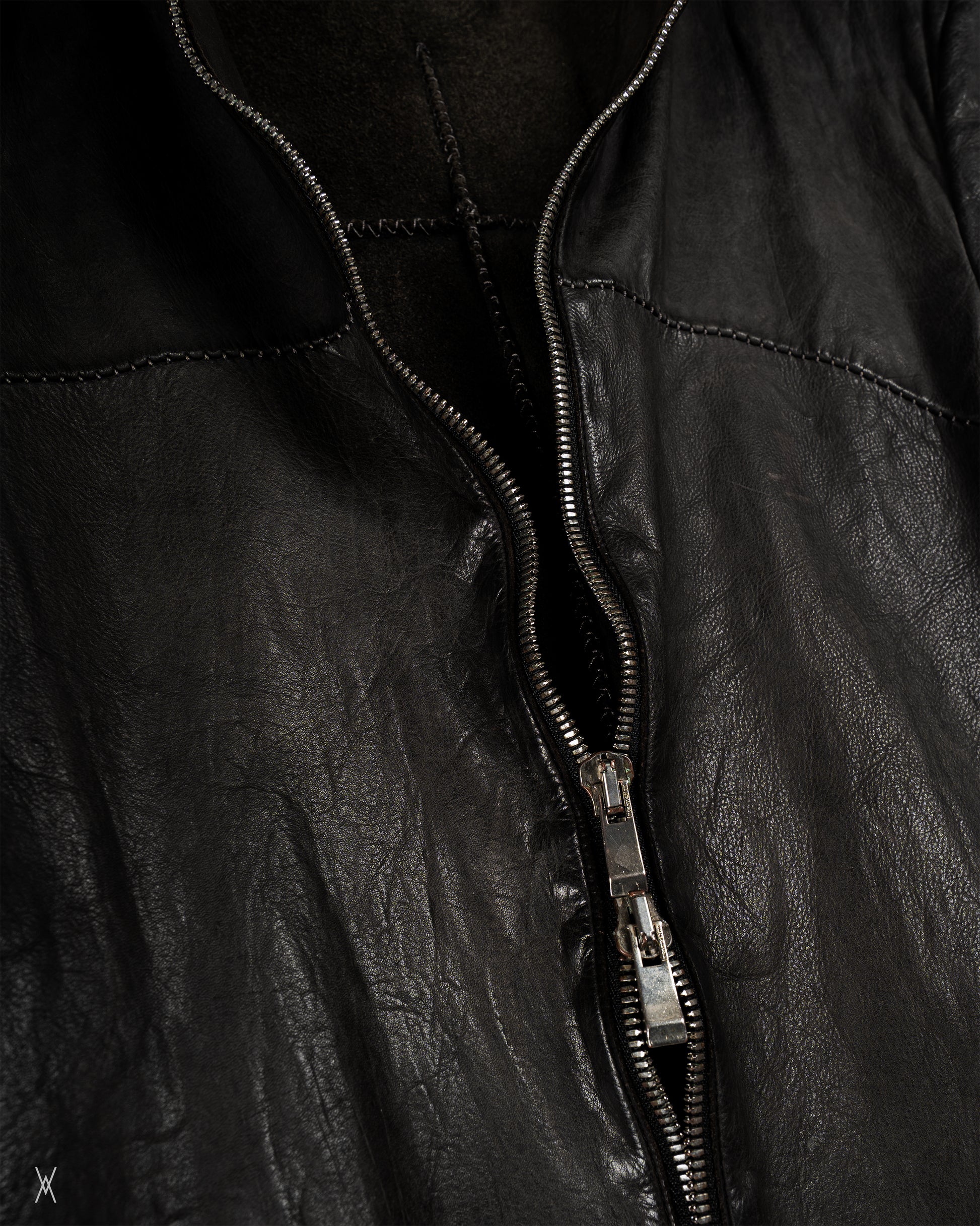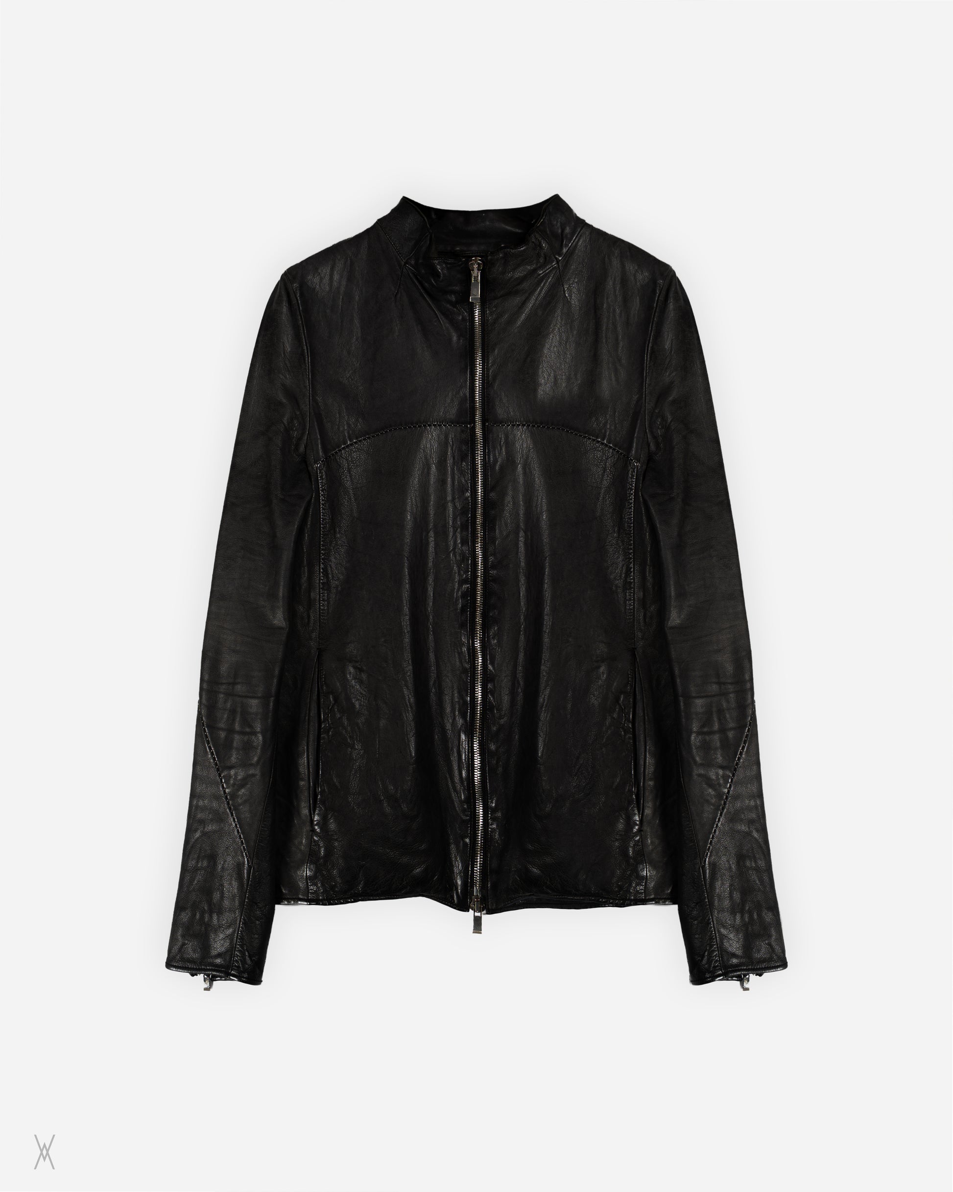 Incarnation leather jacket constructed from vegetable-tanned calf leather with a natural grain and soft sheen. The jacket features a streamlined, collarless neckline, full front zip closure, and articulated seam construction shaping the body and sleeves. Finished with zippered cuffs and clean paneling throughout.