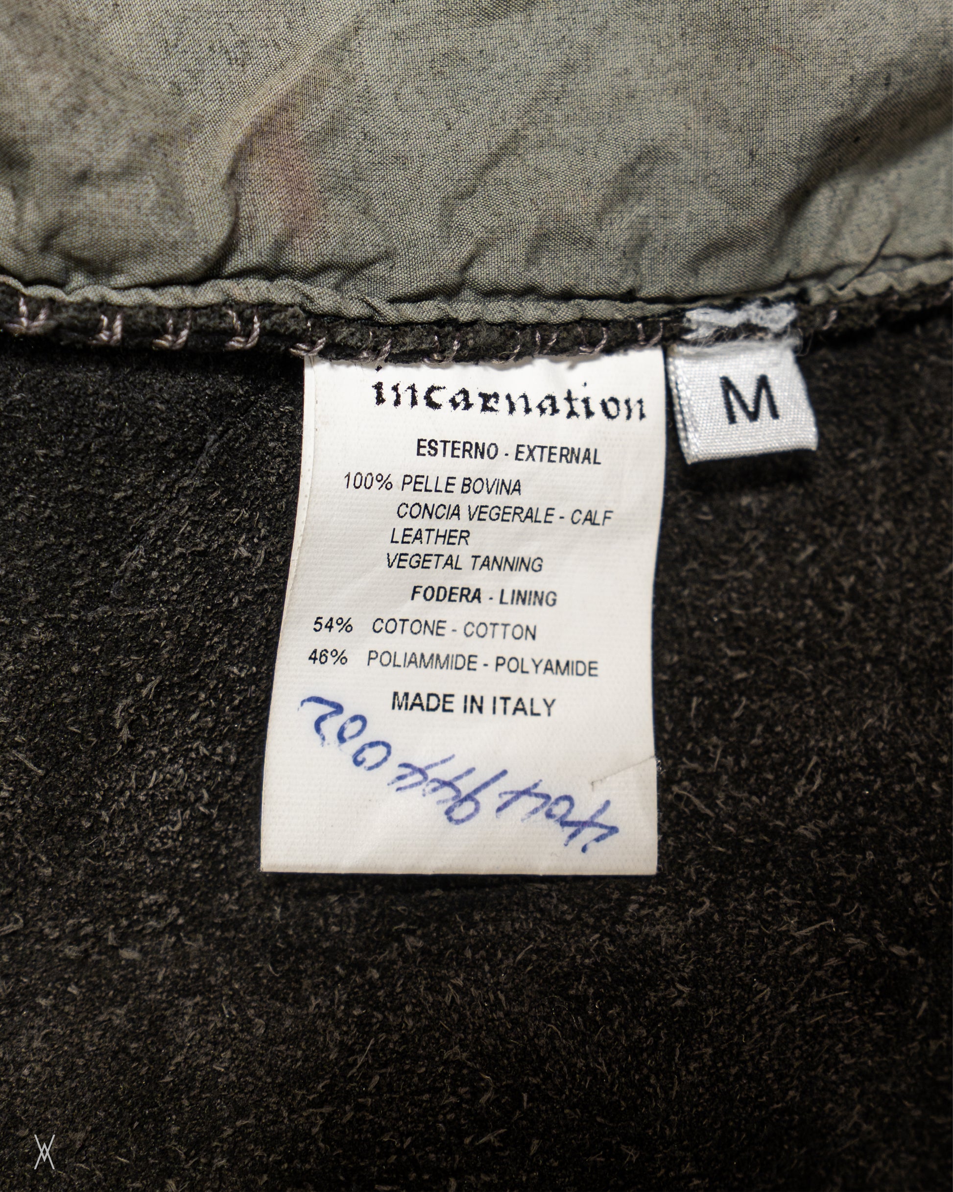 The leather shows natural creasing and tonal depth inherent to vegetable tanning. Interior is lined with a cotton and polyamide blend. Made in Italy.