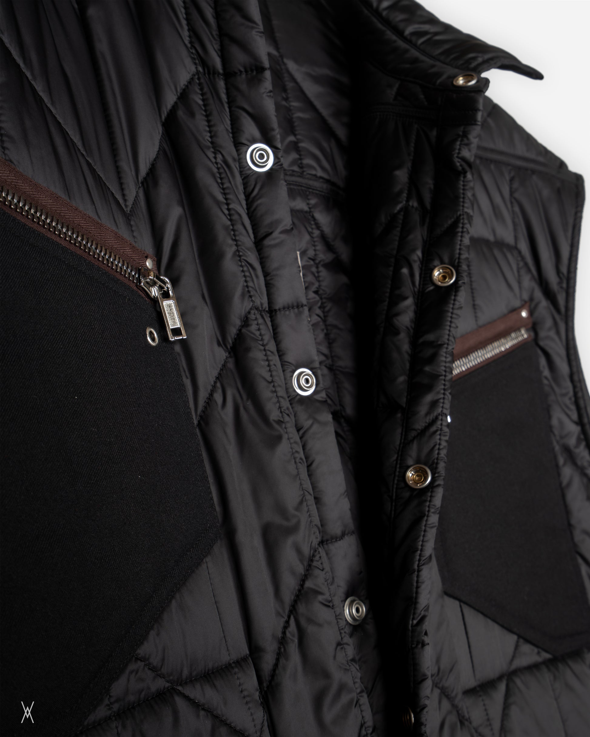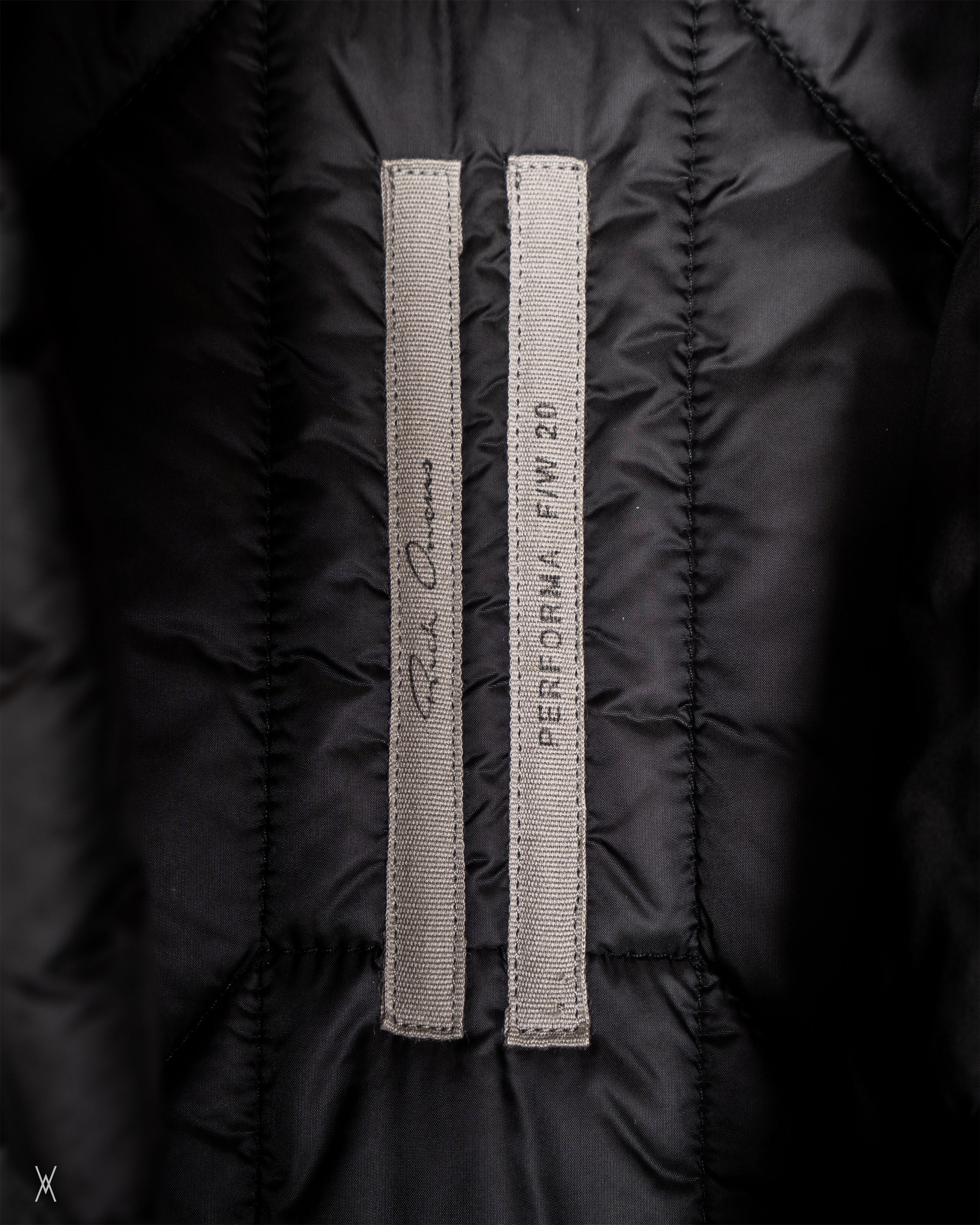 Rick Owens quilted padded vest / vest coat in black (color 09), made in Italy. Cut from lightweight nylon with a clean chevron quilt pattern and a compact, structured drape. The front closes with tonal snap buttons and is balanced by two oversized angled zip chest pockets built from contrast panels, giving the piece a functional, hardware-led finish without adding bulk. The hem is softly curved and the back features Rick Owens’ signature webbing strap detail secured with metal rivets.