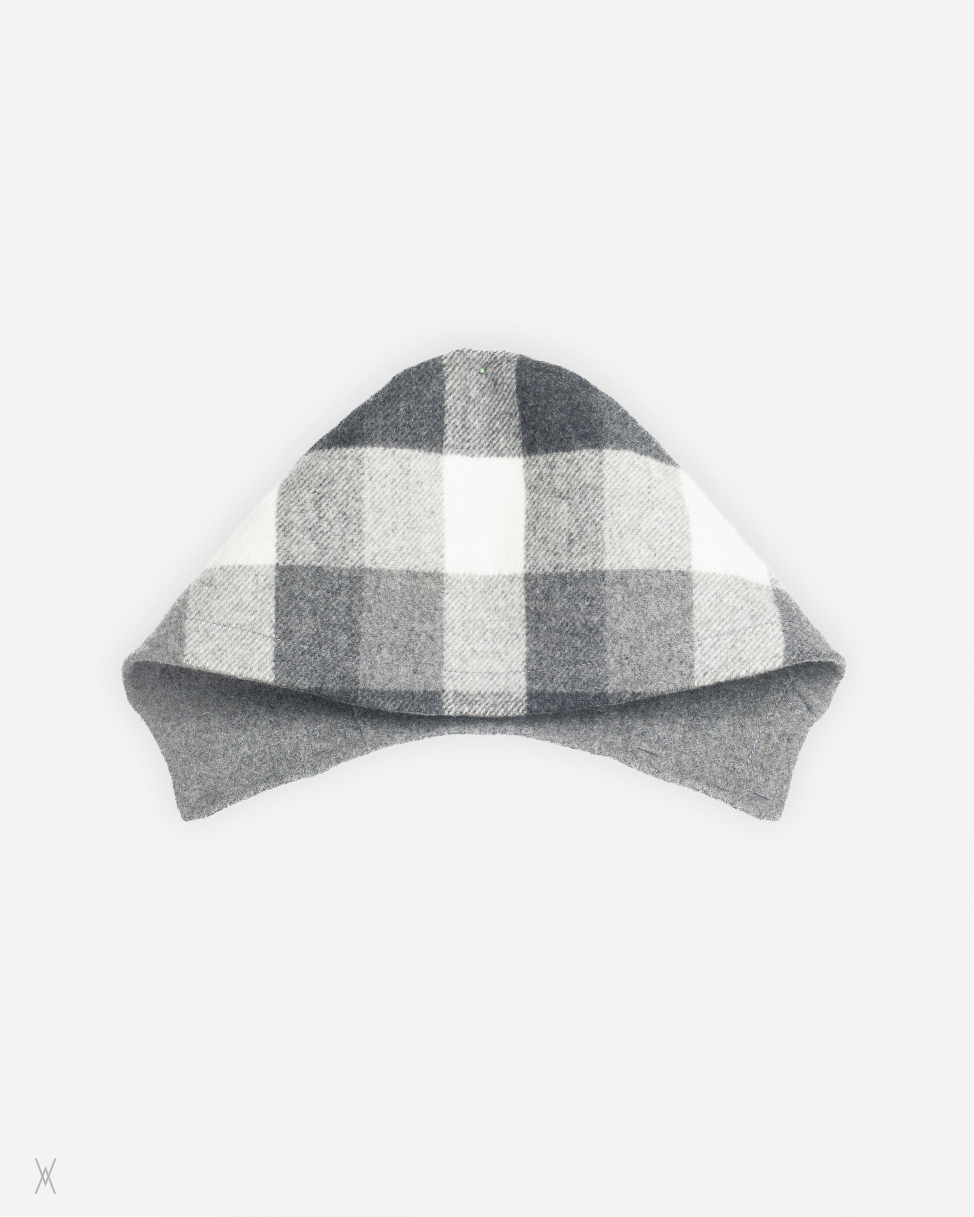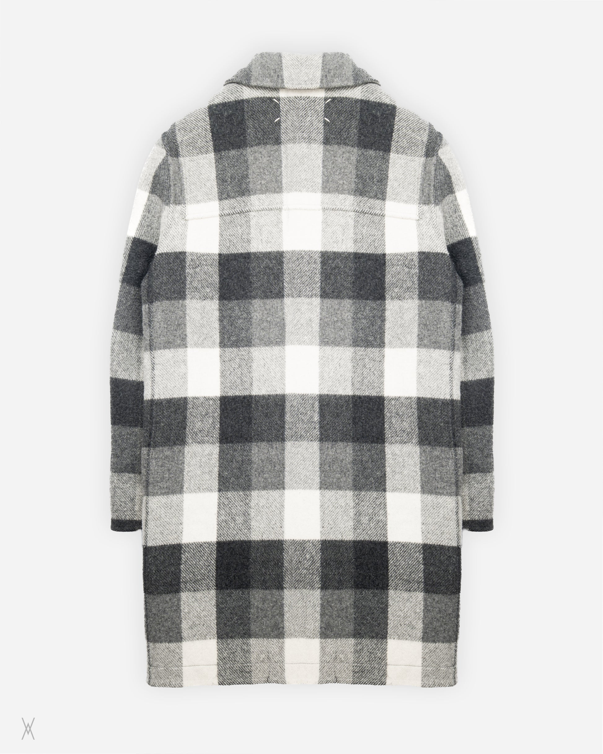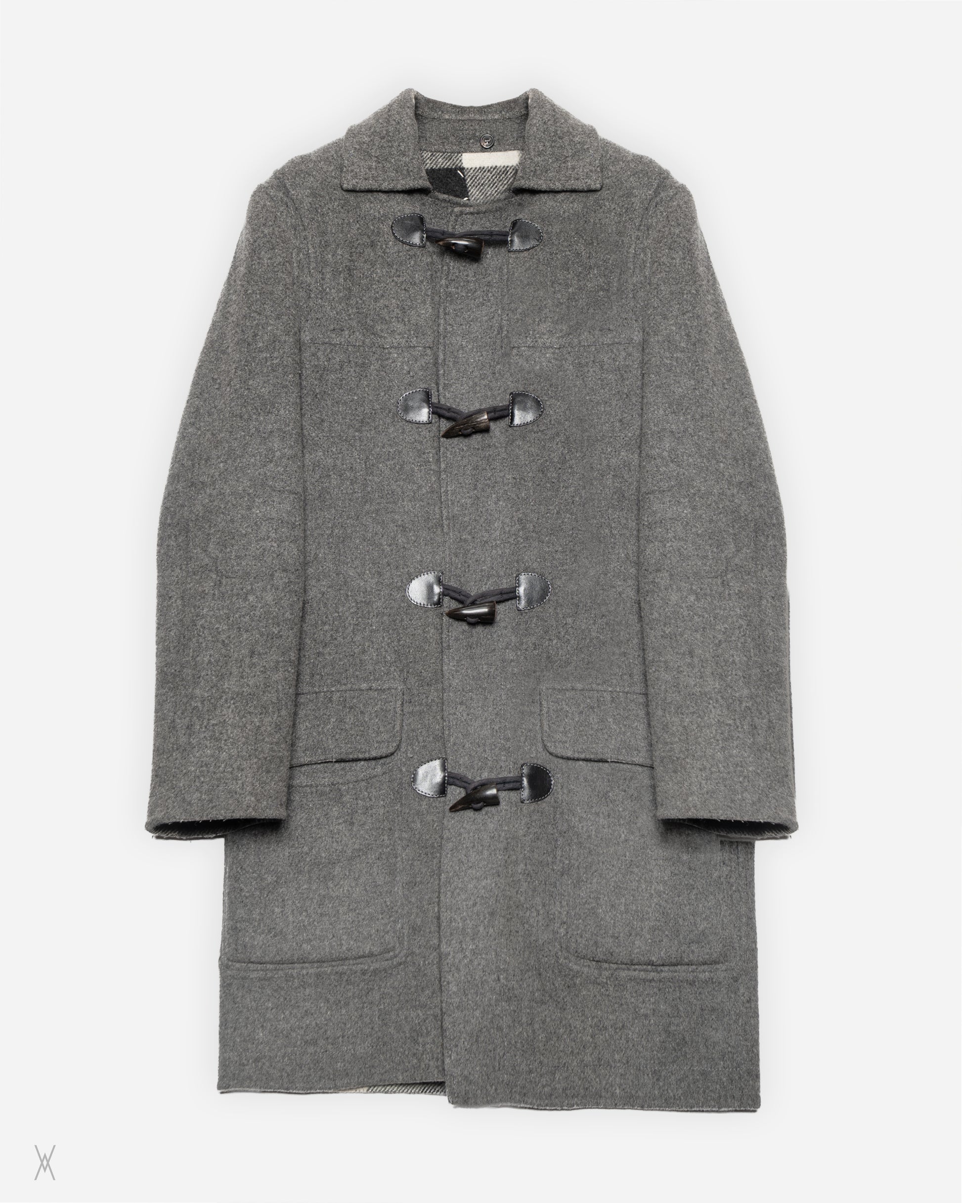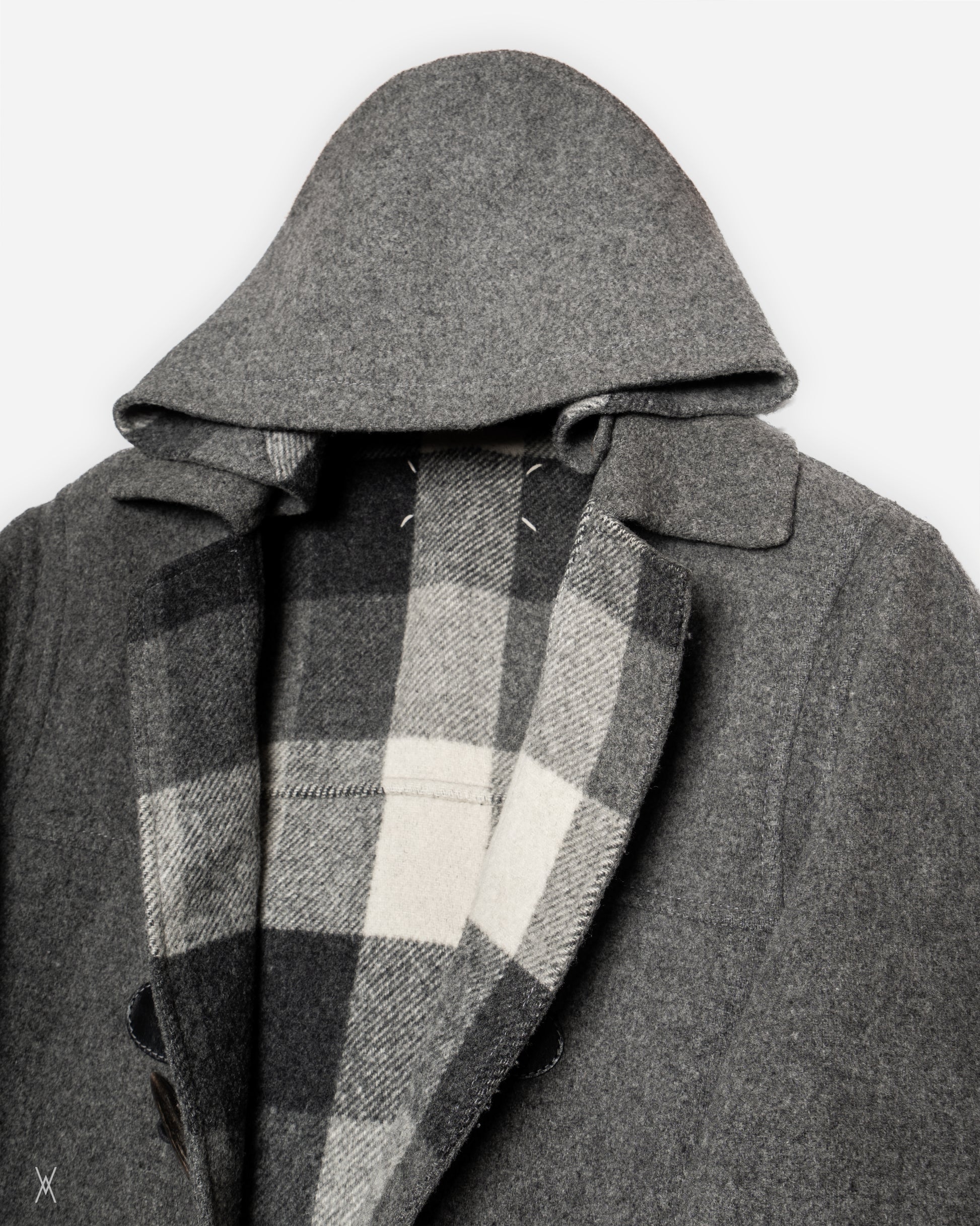 Maison Margiela reversible toggle coat from the Fall/Winter 2010 runway collection. Constructed from heavy wool with a fully reversible design, allowing the coat to be worn in two distinct configurations. One side features a grey melange wool exterior, while the reverse presents a large-scale check pattern in grey, charcoal, and off-white tones.
