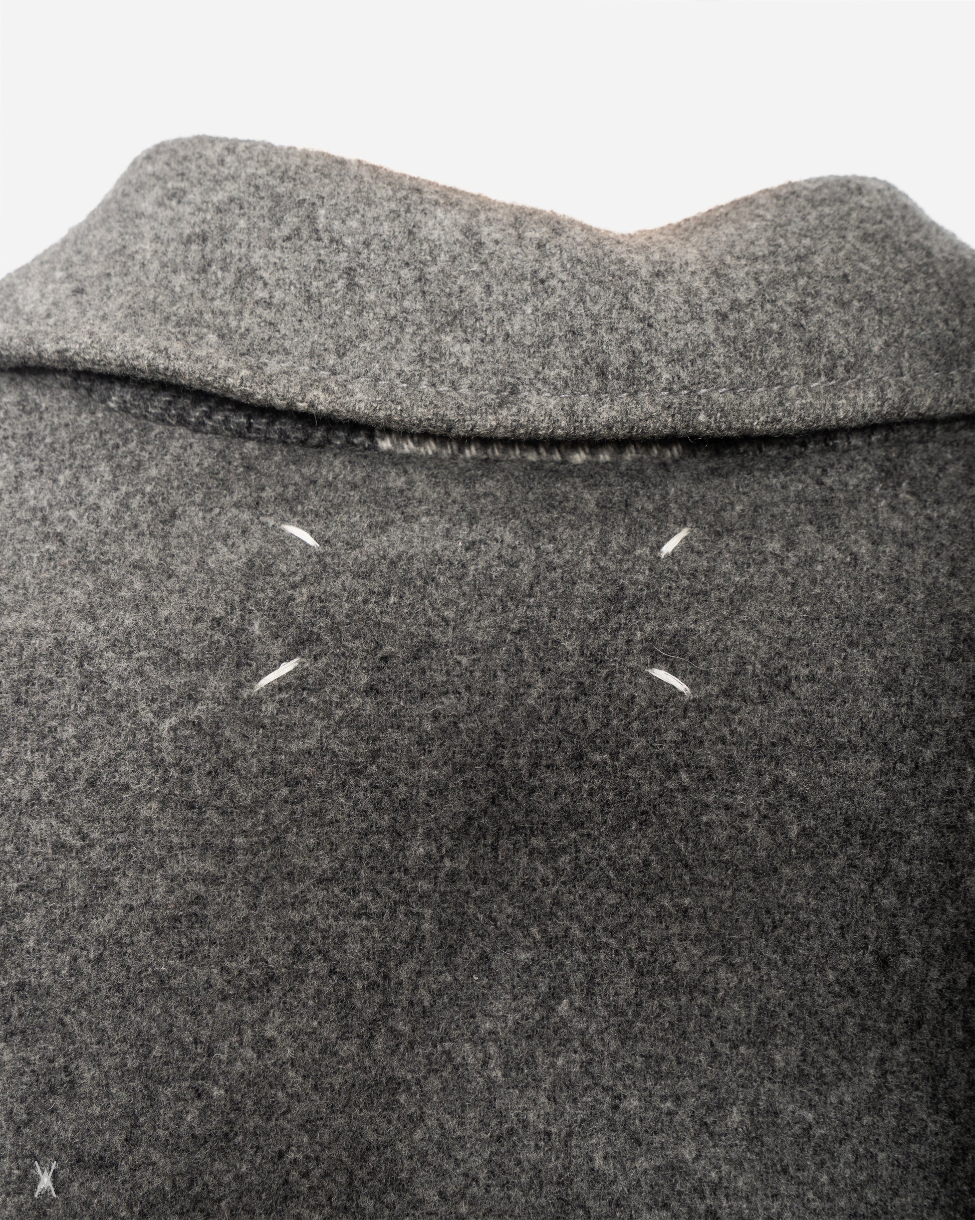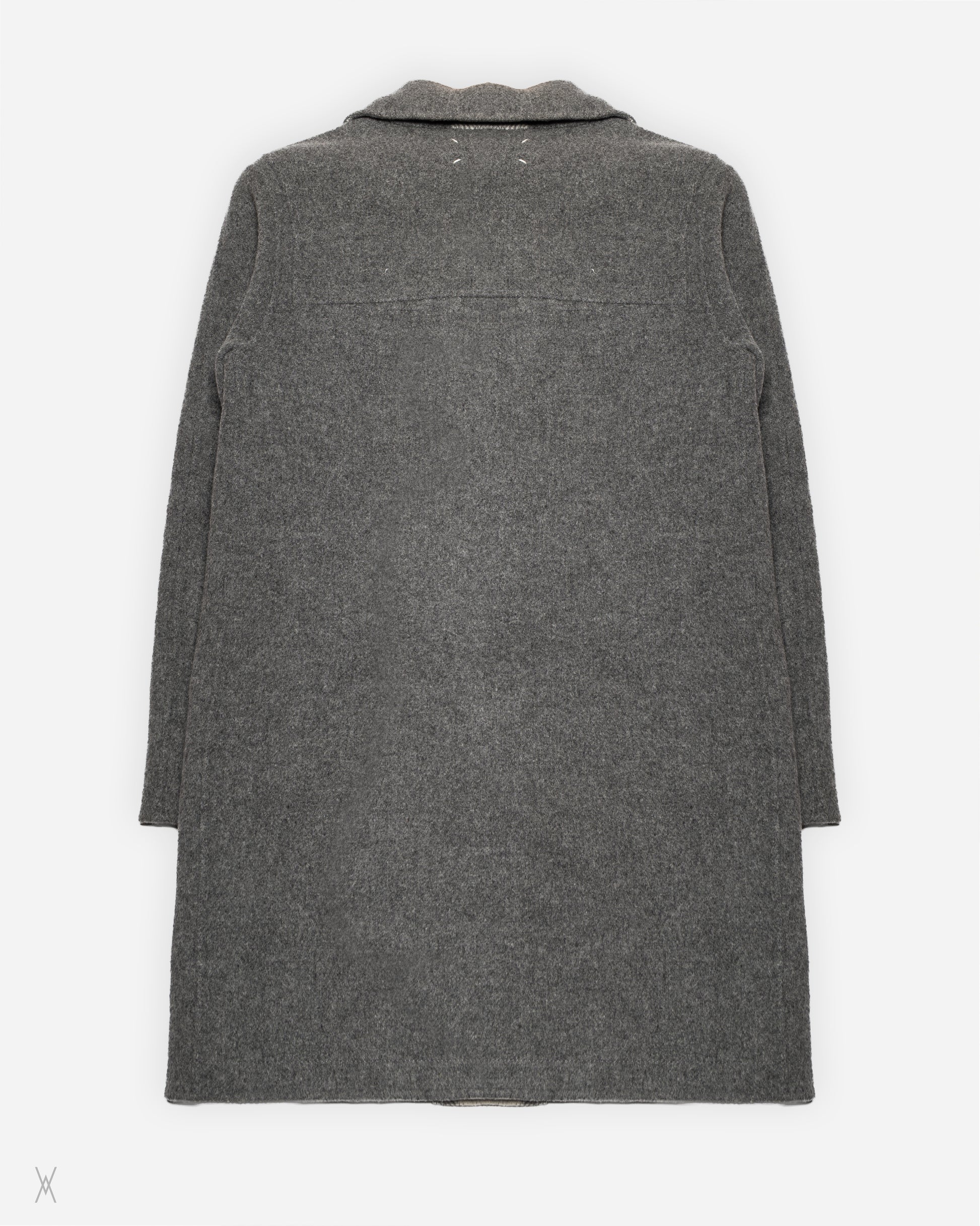 The coat is finished with a toggle fastening system, flap pockets, and a structured hood. Signature Margiela four-stitch detailing is present at the upper back on both sides. This piece appeared on the runway in separate looks, showcasing each face of the reversible construction.