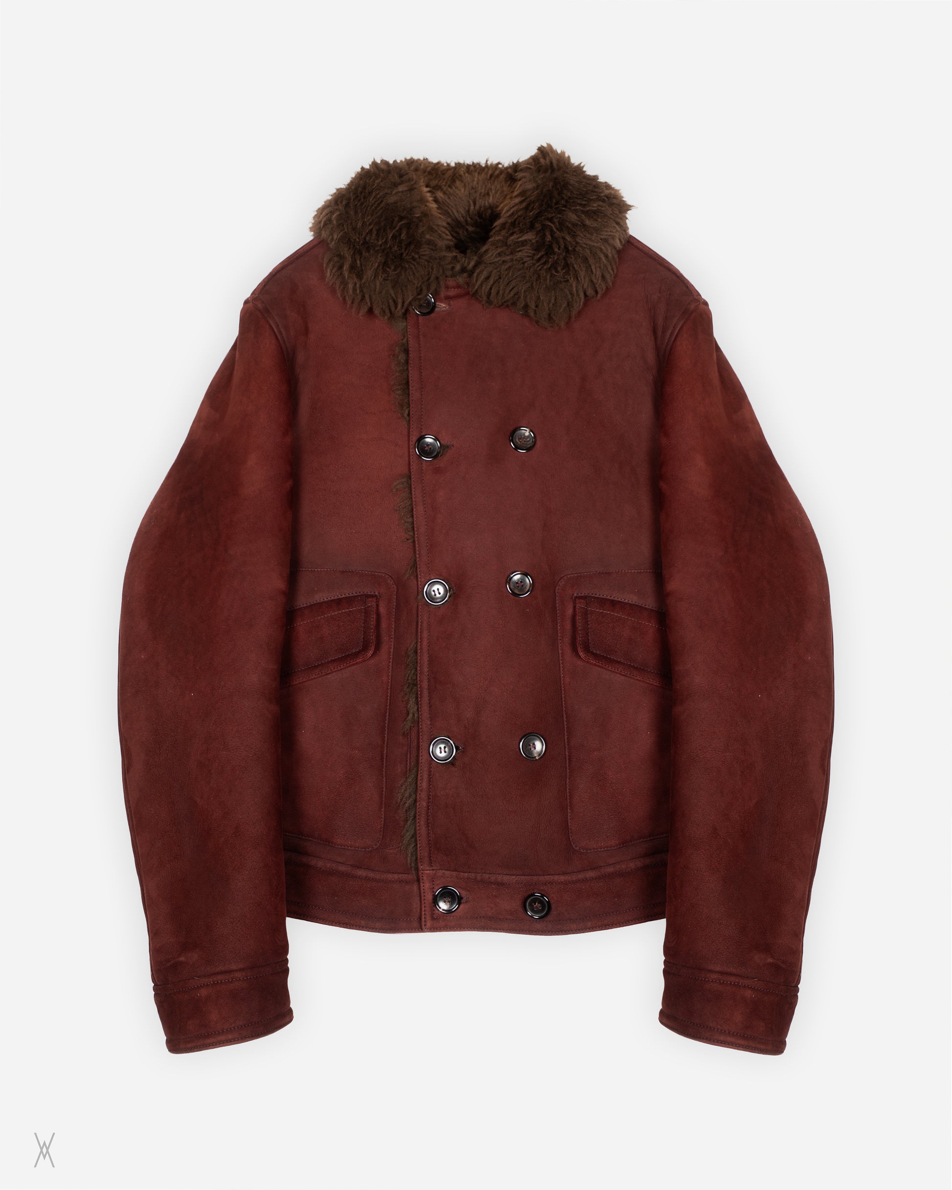 Gucci runway shearling jacket from the Fall/Winter 2013 collection (Look 17), crafted in rich burgundy suede with a full brown shearling lining. The design features a double-breasted front with polished dark buttons, a substantial shearling collar, and clean flap hand pockets at the waist. Cropped, compact body with sculpted sleeve volume and curved panel seaming across the back, finished with a clean hem and a dense, insulating interior.