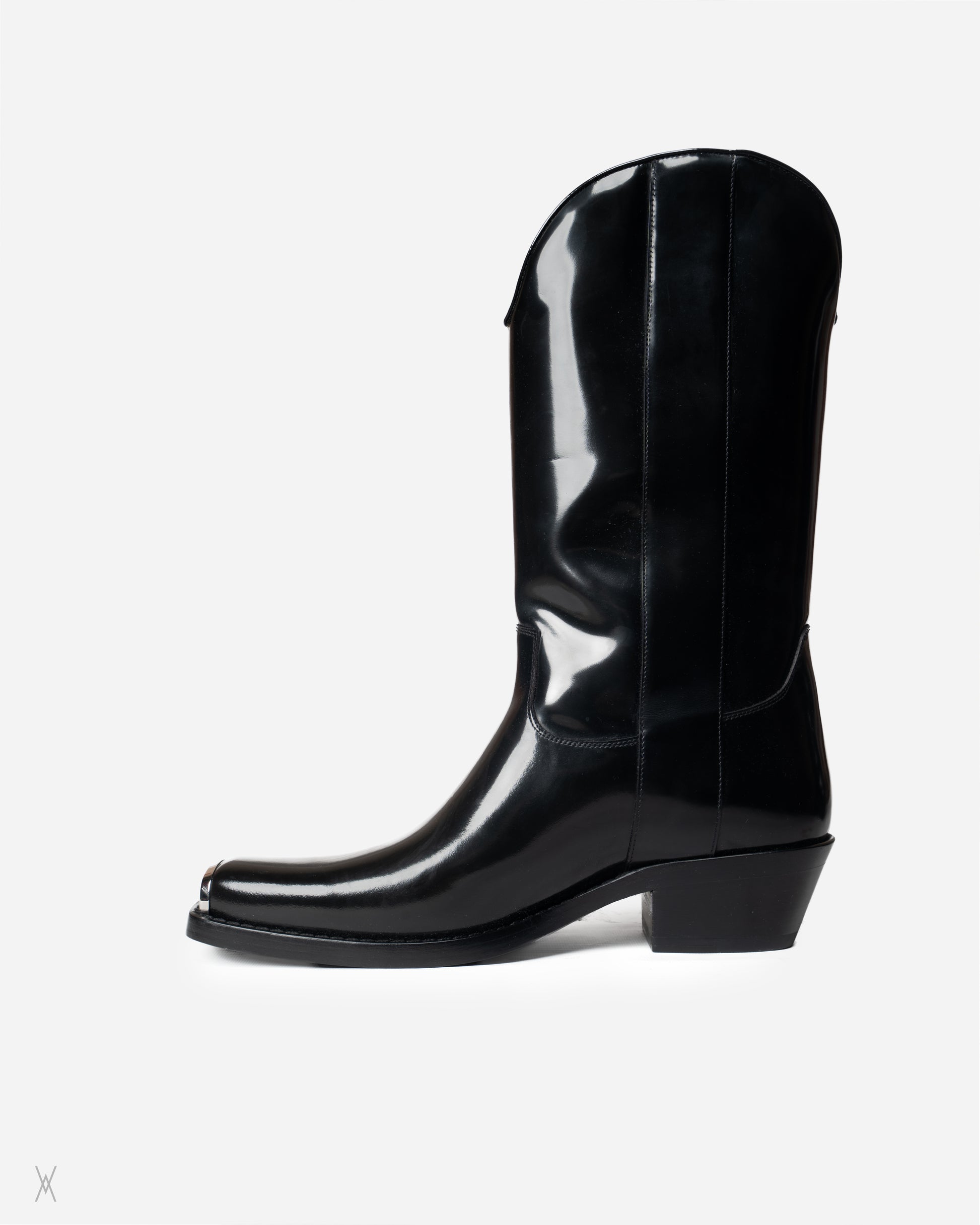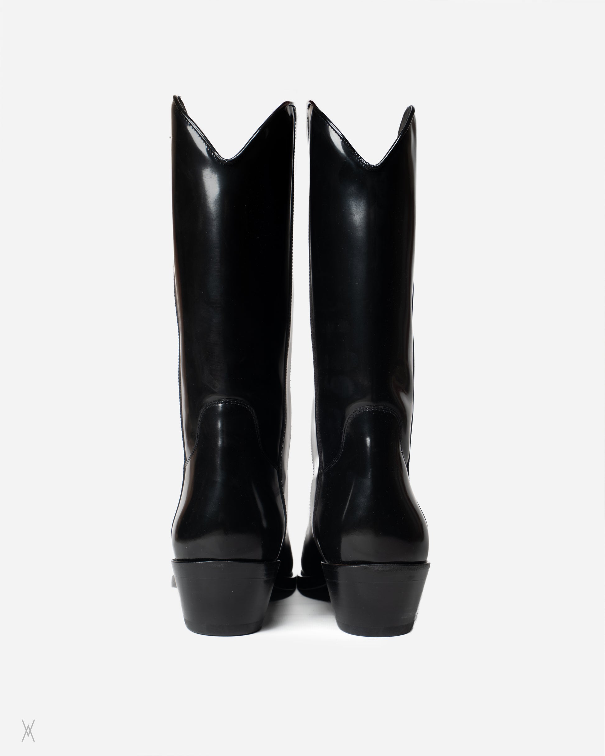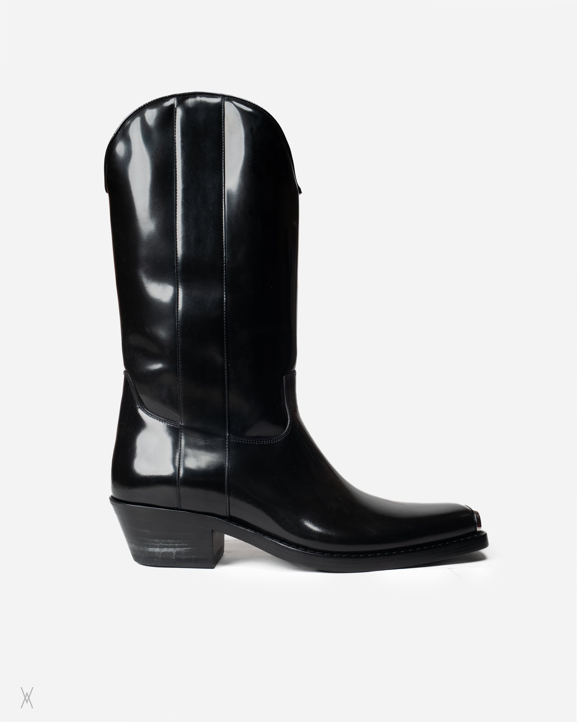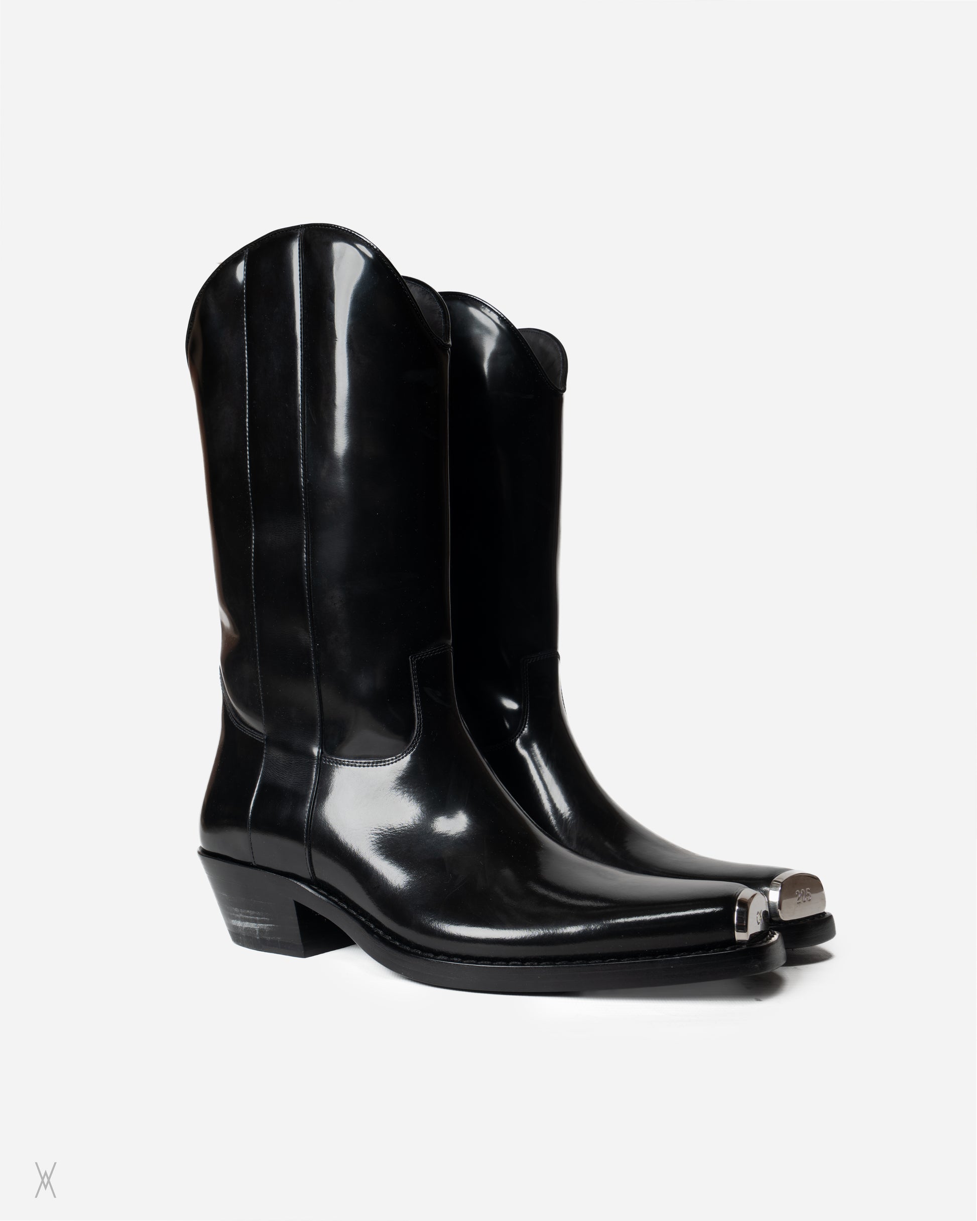 Calvin Klein 205W39NYC leather boots made in Italy. Executed in a fully black colorway, this version is exceptionally hard to find, particularly in unworn condition. Crafted from polished black leather, the boots feature a clean shaft, elongated pointed toe with engraved 205 metal toe caps, a stacked leather heel, and a solid leather sole. The design is precise and restrained, with minimal stitching and a focus on material quality and construction.