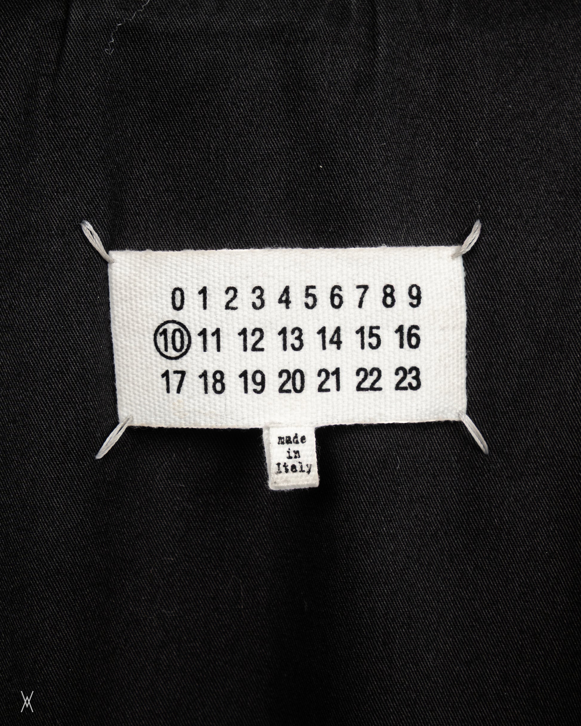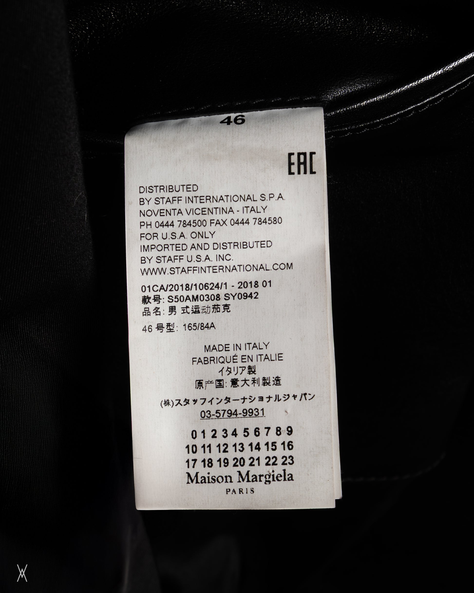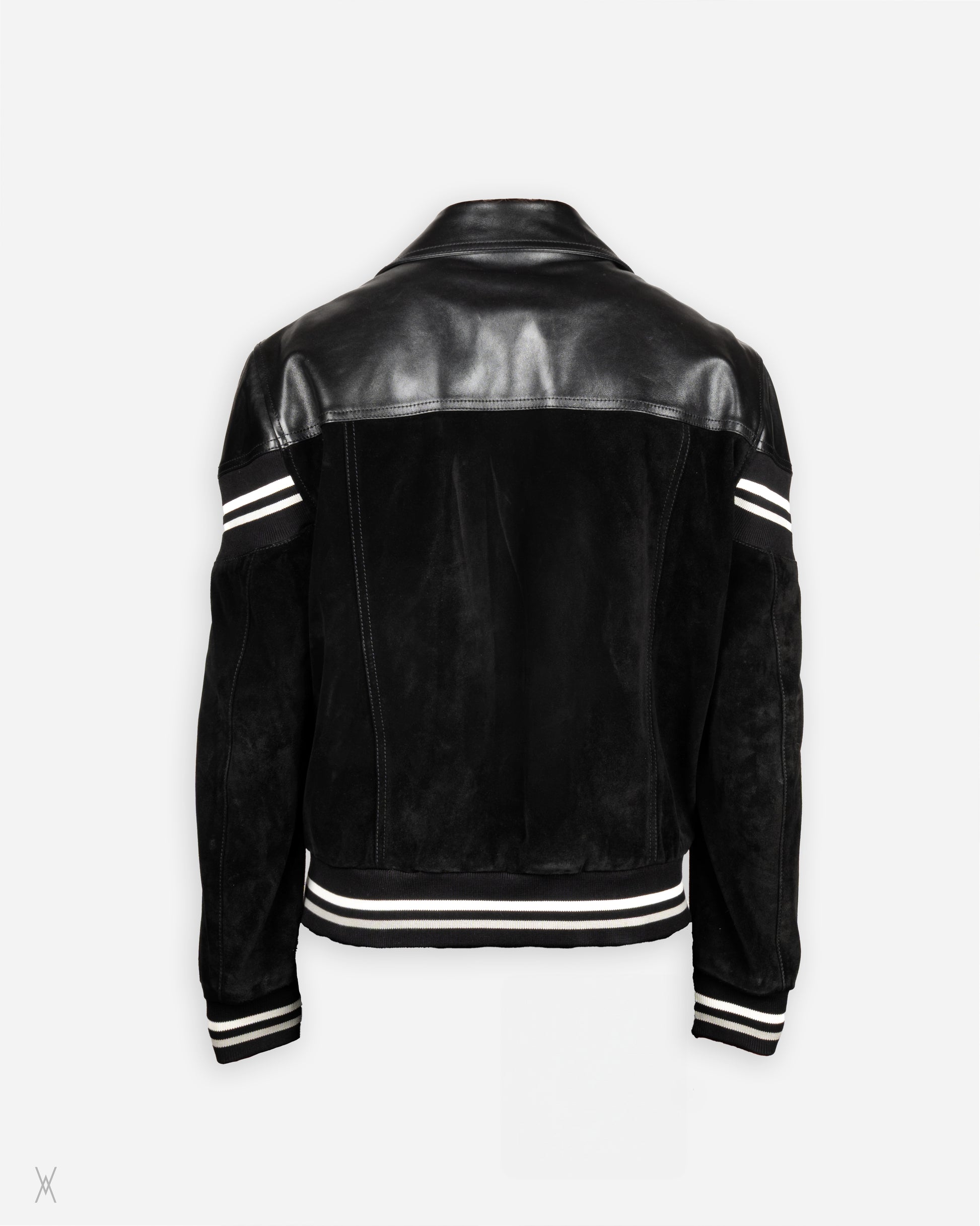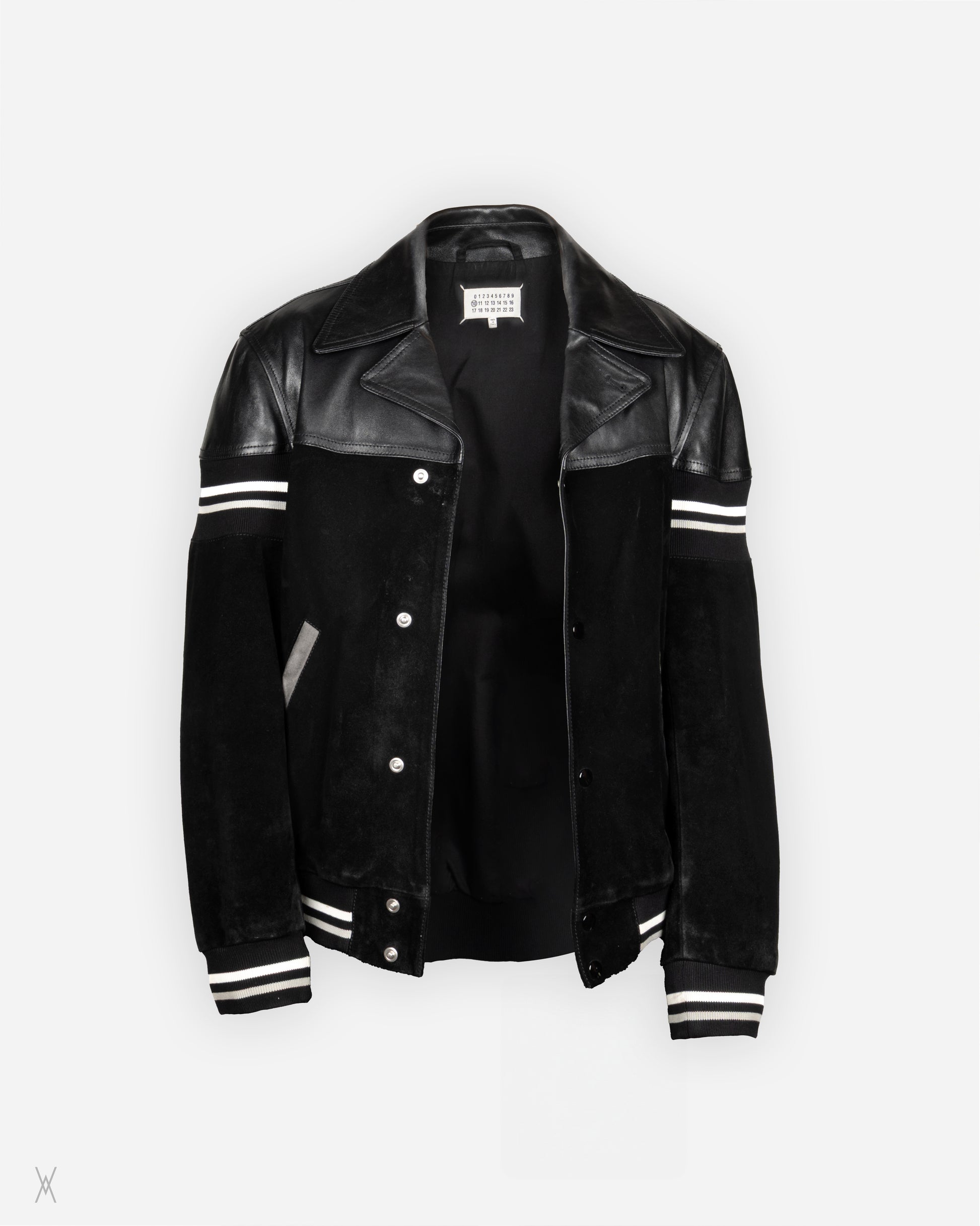 Maison Margiela elevates the varsity bomber with a precise balance of luxury and sport. Crafted in Italy from a combination of soft suede and smooth leather, the jacket’s black body is structured with a leather yoke across the shoulders and sleeves. White and gray striped ribbed trims add a graphic contrast, while snap button closure and slanted welt pockets keep the silhouette sharp and functional. The natural variations in suede and leather are factory-made, intentionally giving the piece a vintage-inspired look consistent with Margiela’s design ethos. Finished with the house’s iconic four-stitch signature at the back.