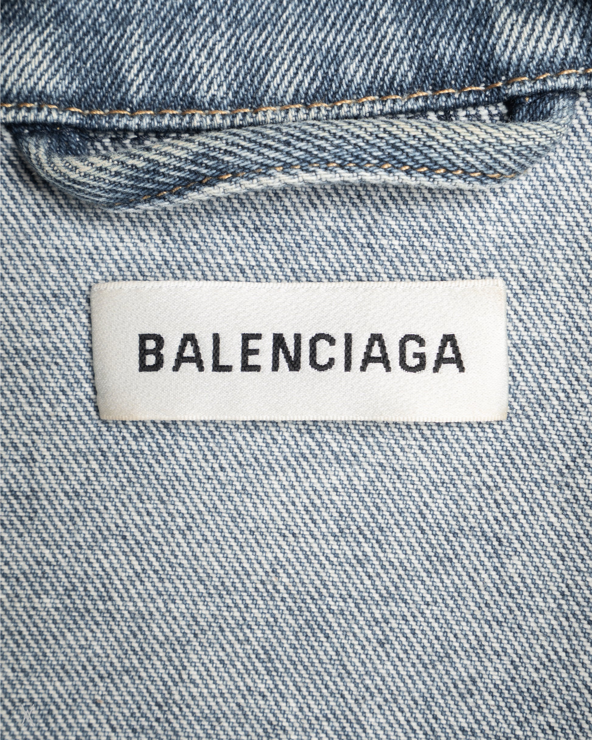 Balenciaga “Swing” denim jacket in a light blue wash, featuring the distinctive gathered waist construction that creates a rounded, sculpted volume through the body. Classic trucker elements are kept clean and architectural: pointed collar, silver-tone button front closure, flap chest pockets with button closures, and additional vertical front pockets integrated into the paneling. Finished with contrast topstitching, buttoned cuffs, and a cropped, boxy back that emphasizes the swing shape. This is the “ARCHETYPE” label version, marked “SINCE FALL/WINTER 16” on the inner tag, referencing the 2016 release variant.