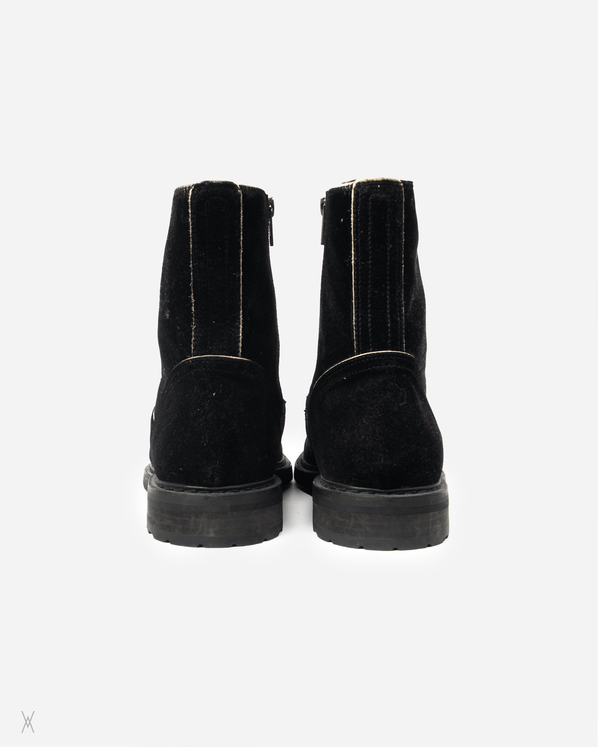 Ann Demeulemeester ankle boots combining a leather base with a synthetic velour upper, finished in deep black with irregular factory distressing that reads intentional and graphic rather than worn. The silhouette is pared-back and architectural: rounded toe, clean panel lines traced with subtle contrast piping, and a discreet side zip for an easy entry. Set on a low lug sole that grounds the softness of the velour with a tougher, utilitarian edge. From the 2012–2016 period.