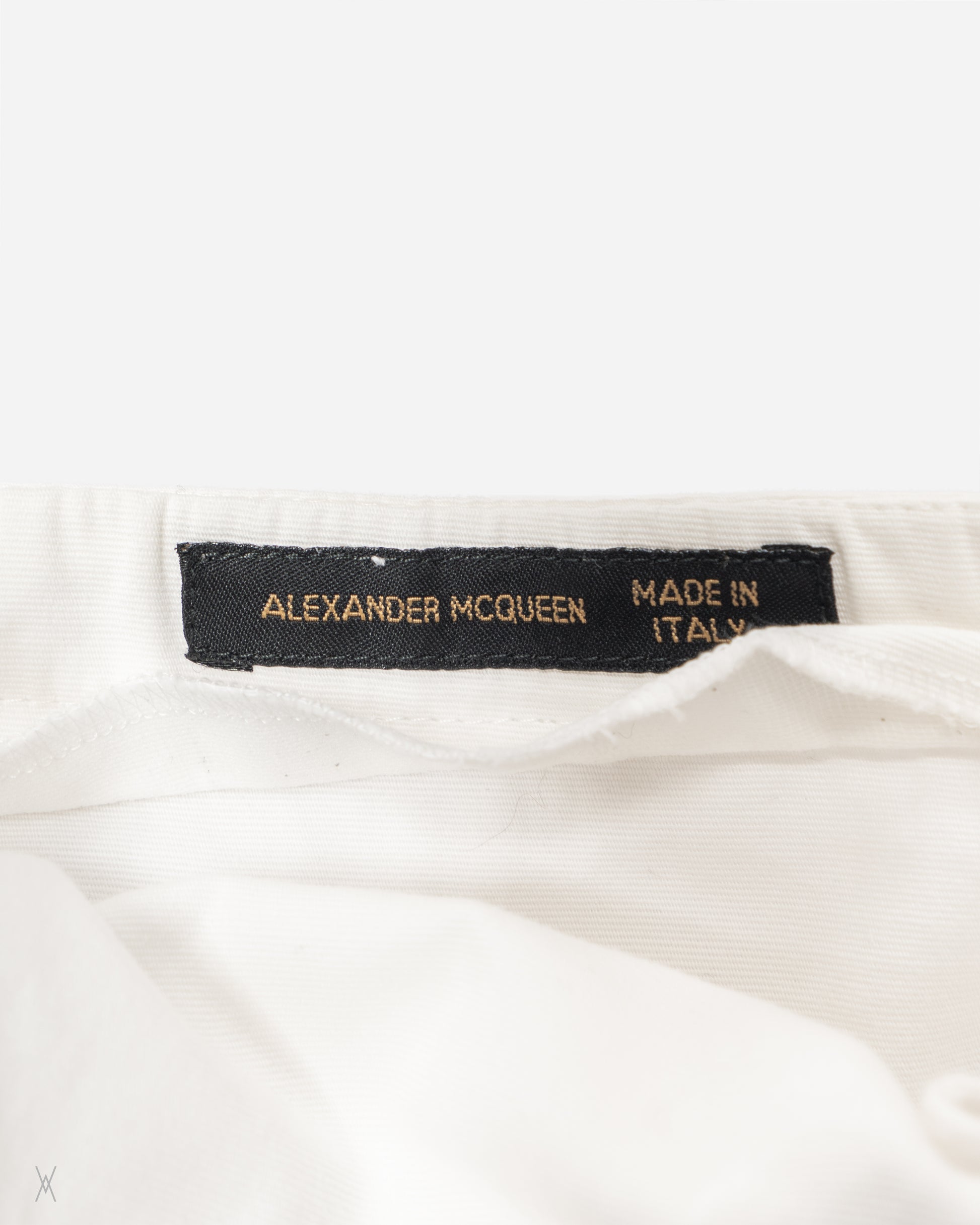 Alexander McQueen skirt featuring a structured, high-waisted construction with distinctive lace-up bondage-style detailing at the hips. Crafted in a smooth, lightweight fabric, the design incorporates corsetry-inspired side panels and a bustle / bum skirt–style volume that subtly emphasizes the back of the silhouette while keeping the front clean and minimal. Finished with understated fastening details at the waistband and a straight, knee-length cut.