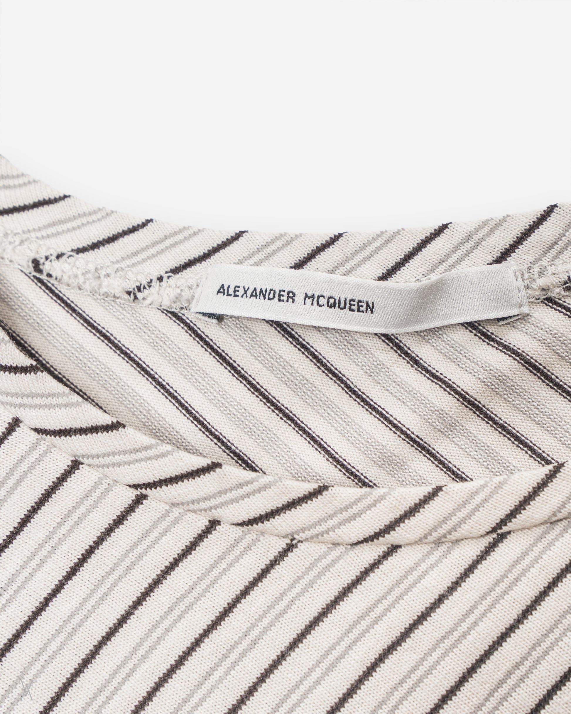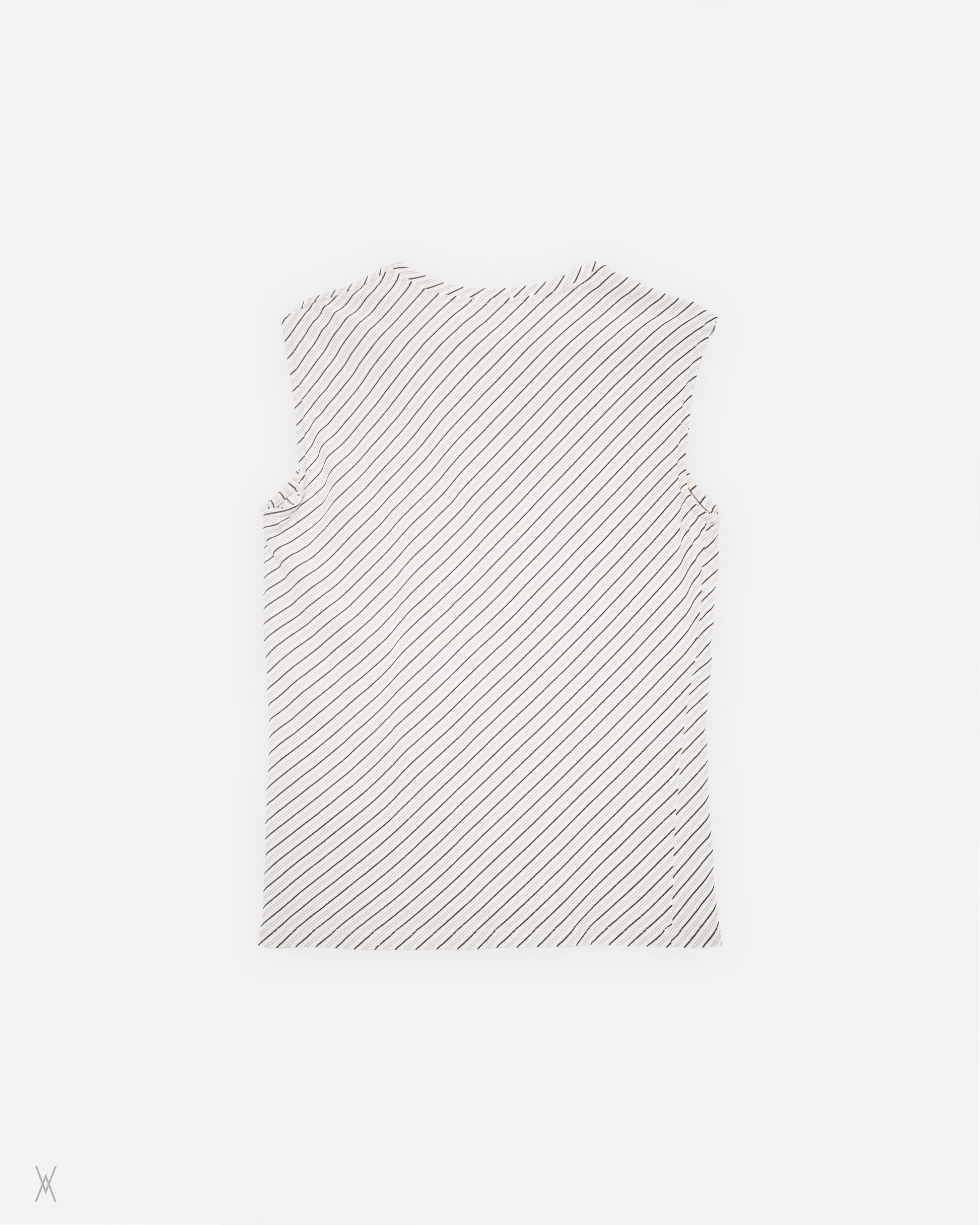 Vintage sleeveless top by Alexander McQueen. Lightweight, textured knit with an open, irregular structure and diagonal stripe pattern throughout. Sleeveless cut with a softly shaped neckline. Minimal construction with emphasis on fabric and surface.